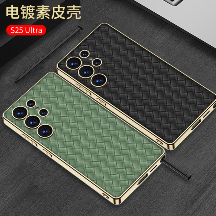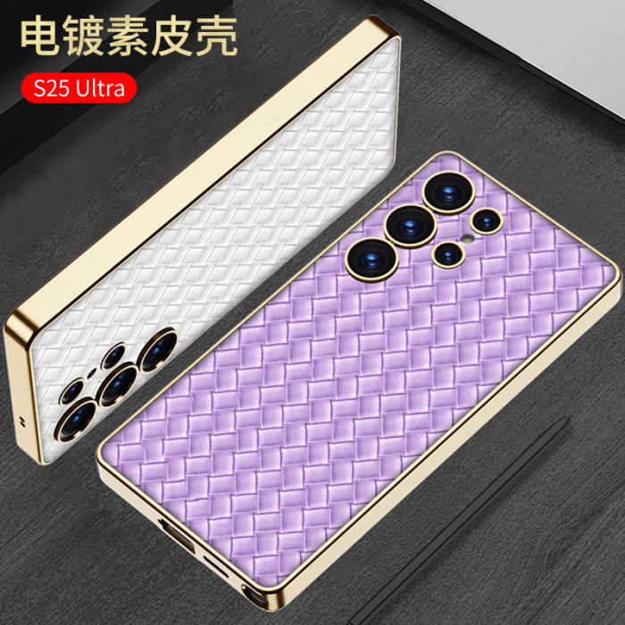 適用三星s25u手機殼S25Ultra編織紋電鍍素皮手機殼s25plus保護套