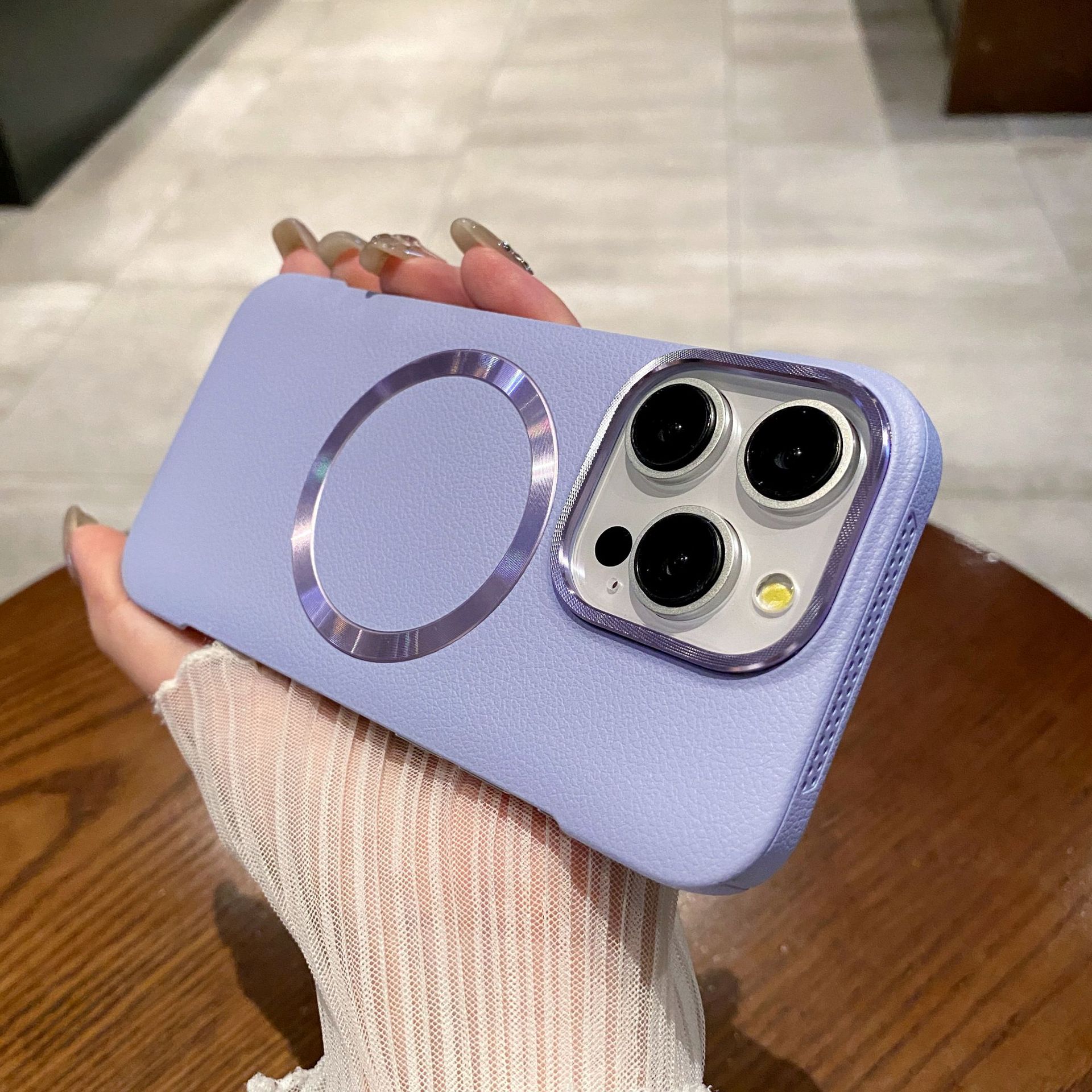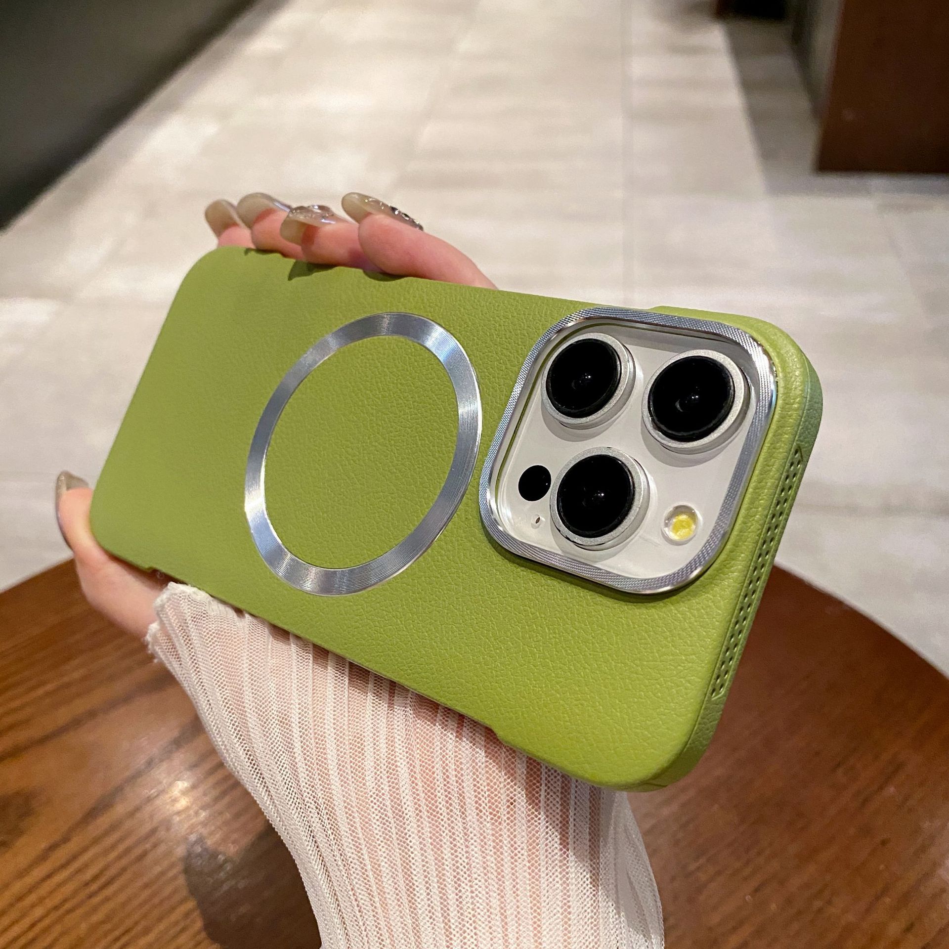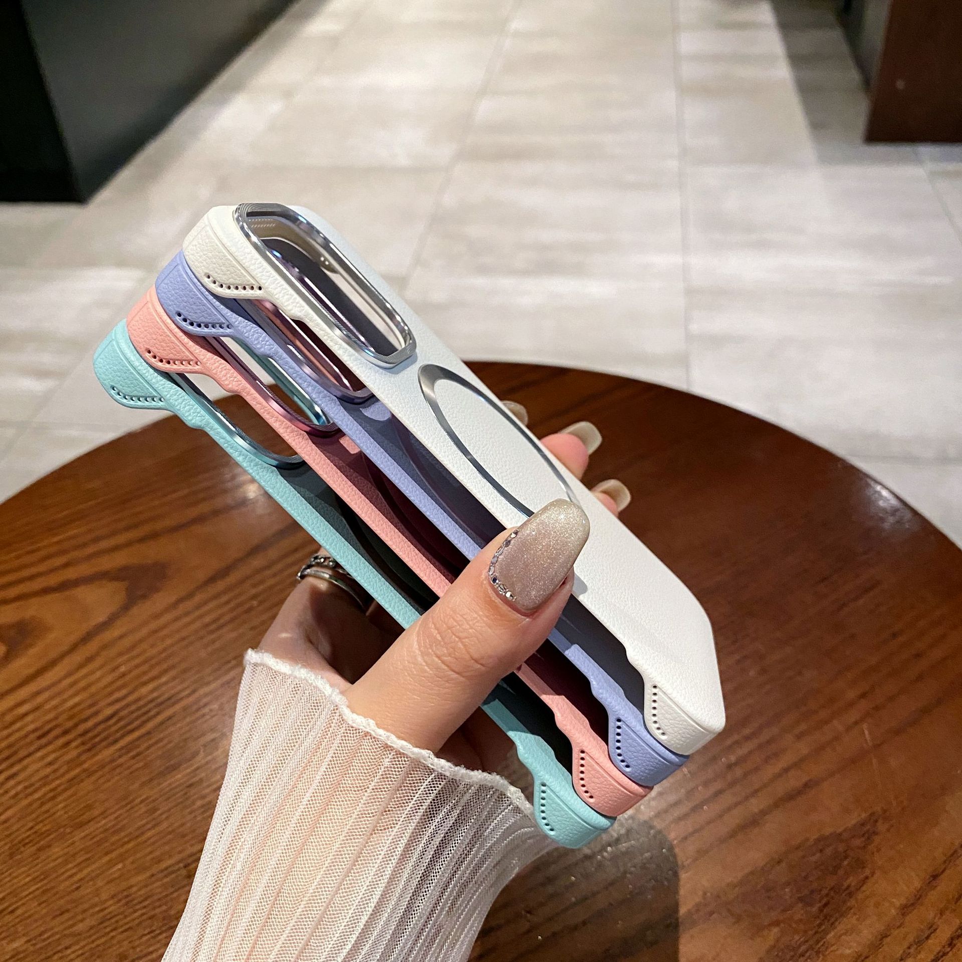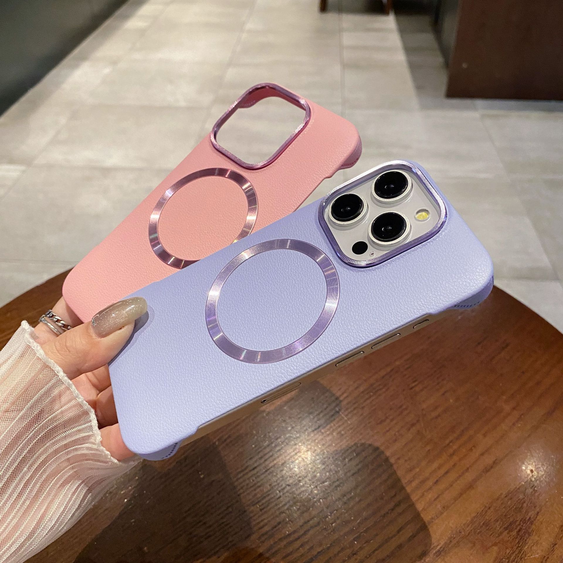 新款無邊框適用iPhone16荔枝紋磁吸手機殼蘋果15防摔純色高級感14