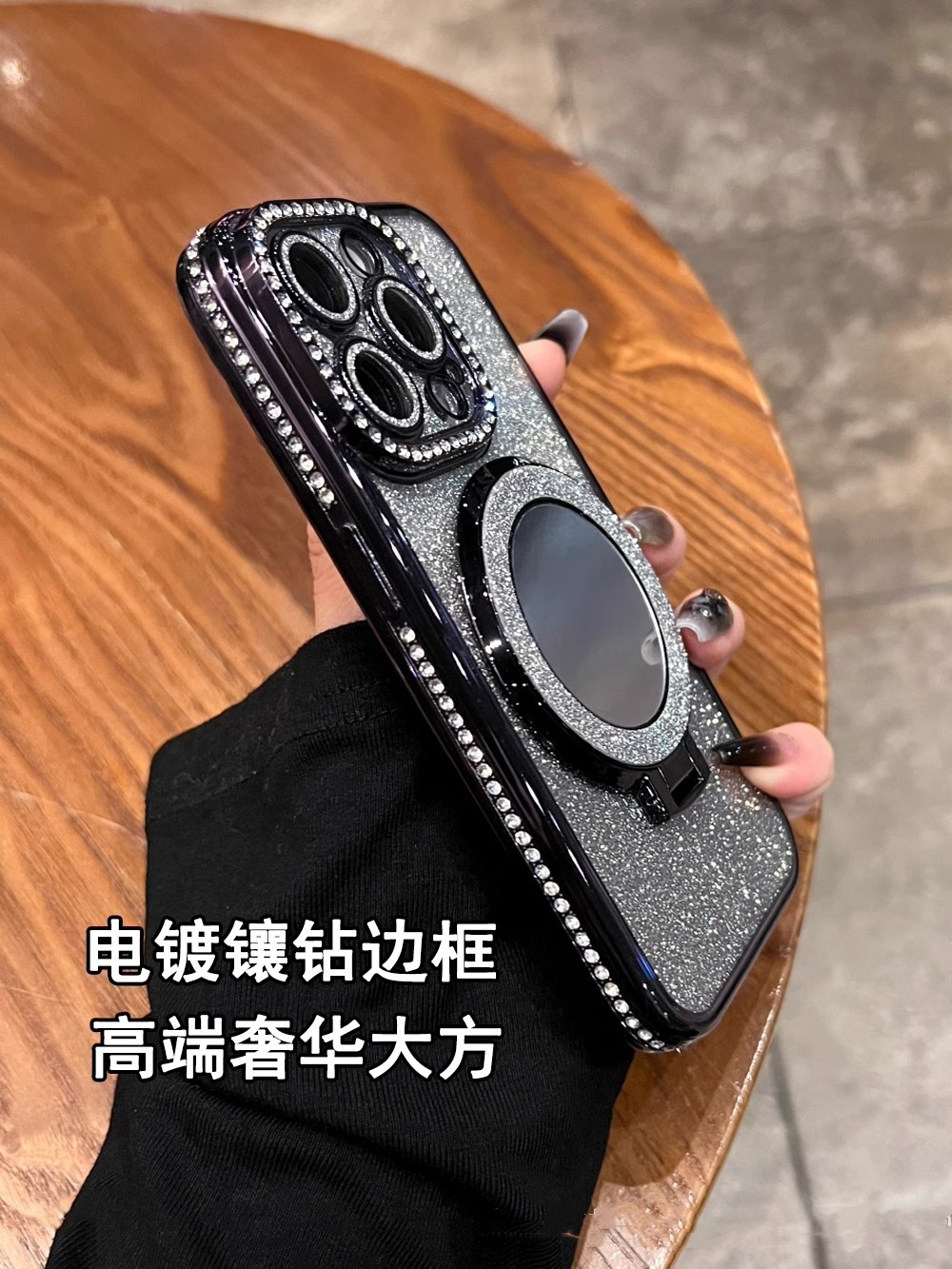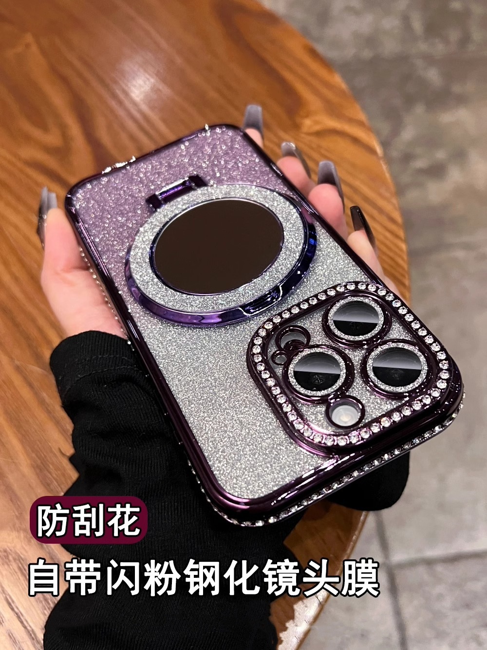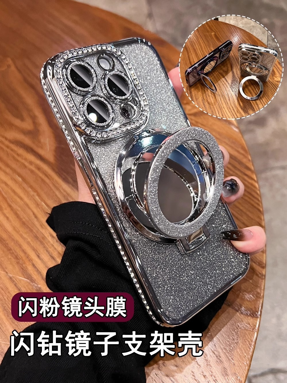 補妝鏡子支架iPhone16邊鑽閃粉手機殼蘋果17磁吸殼適用16pro軟殼