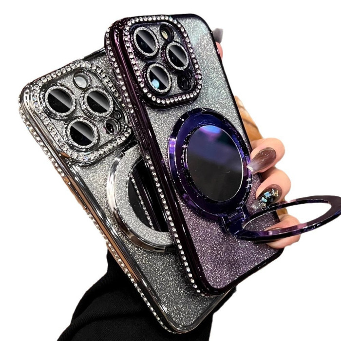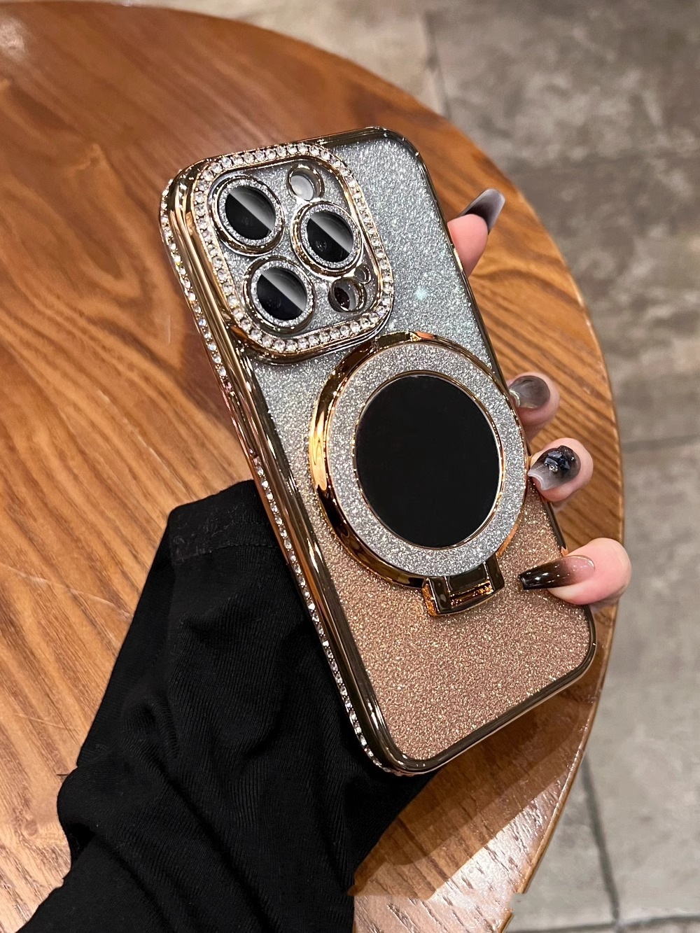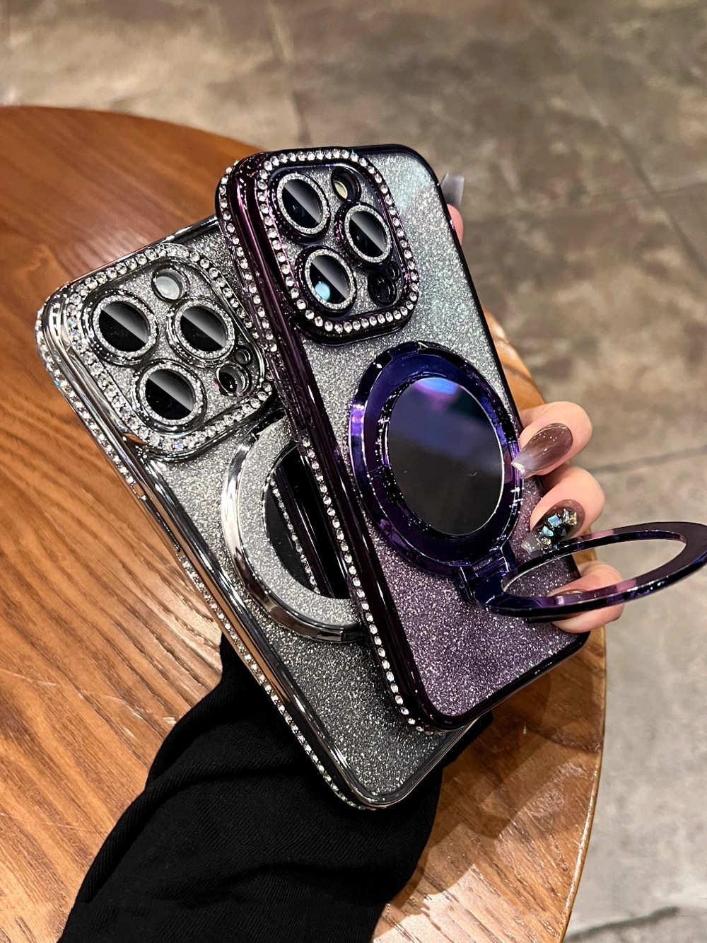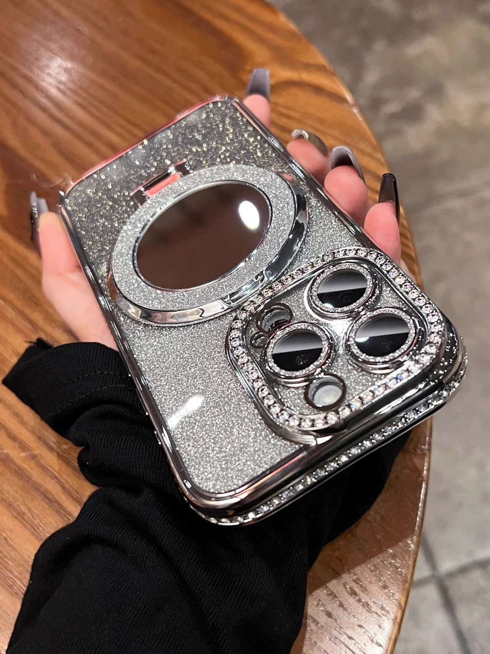 補妝鏡子支架iPhone16邊鑽閃粉手機殼蘋果17磁吸殼適用16pro軟殼