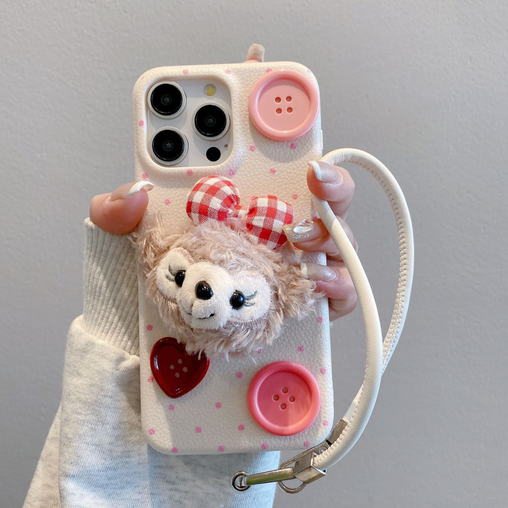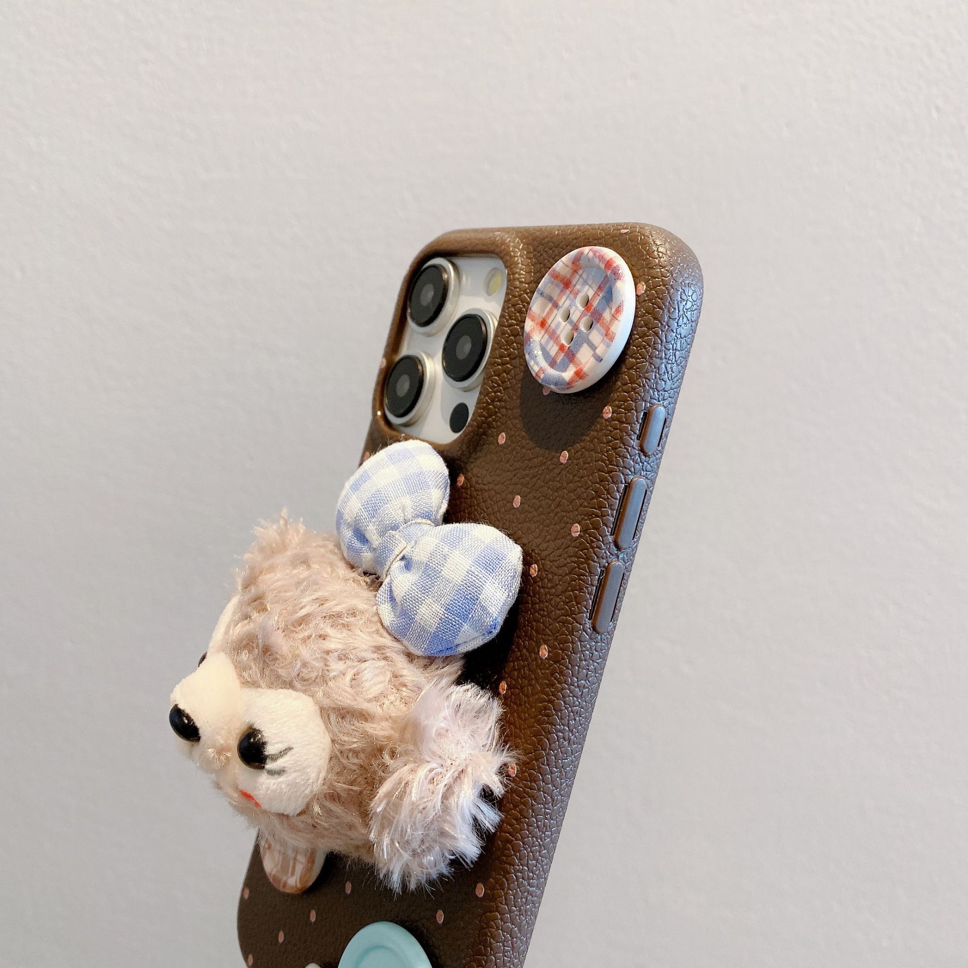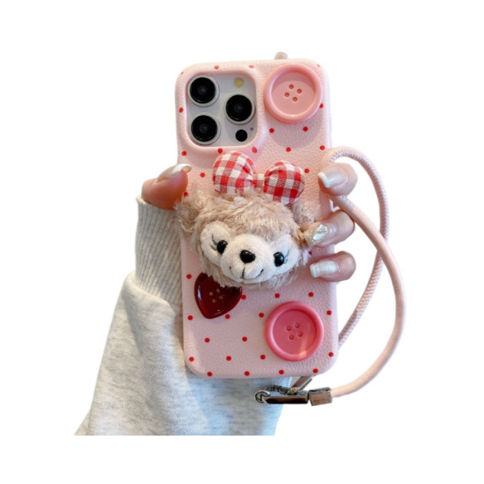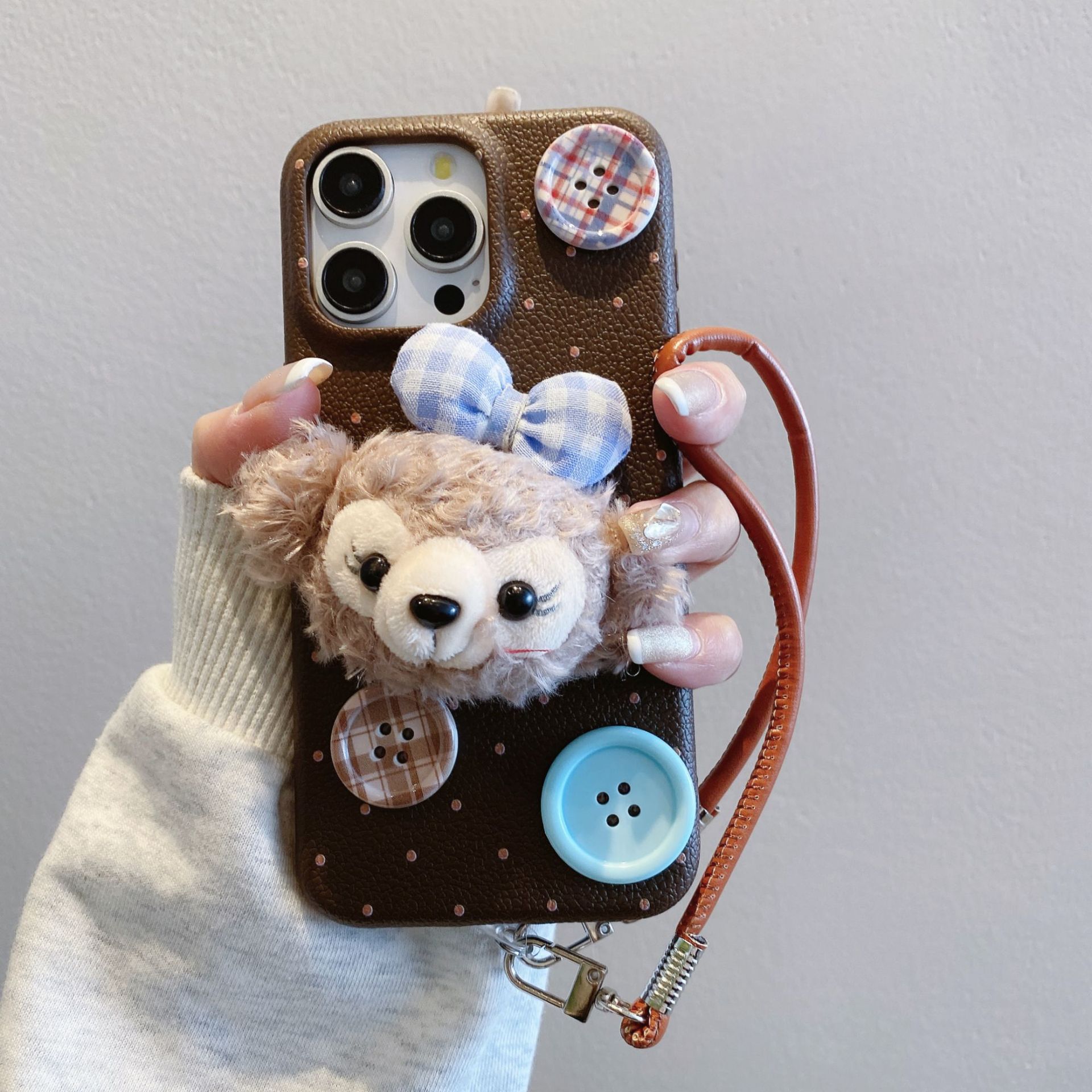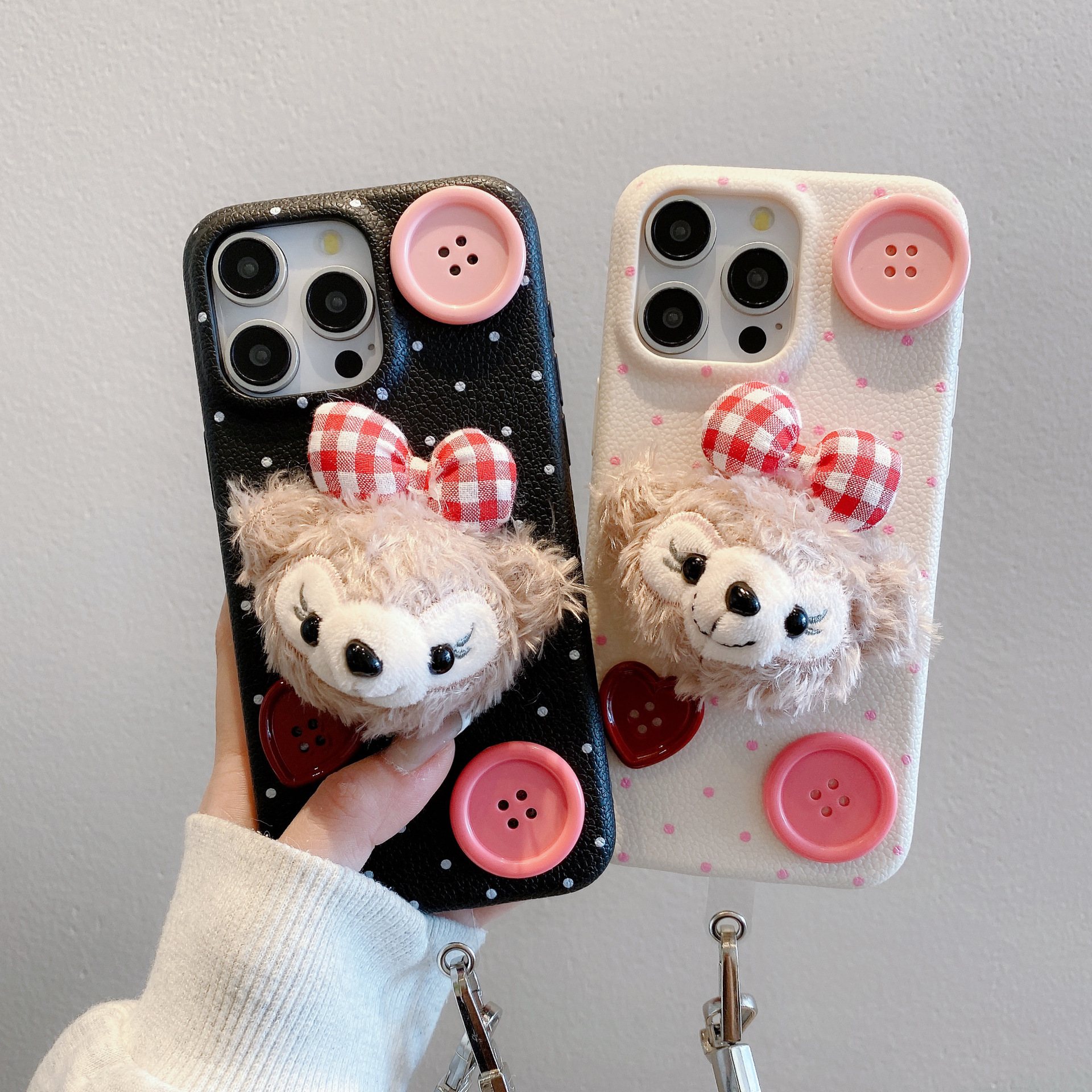 秋冬天毛絨菲熊紐釦掛繩蘋果16promax防摔全包17AIR皮紋手機殼