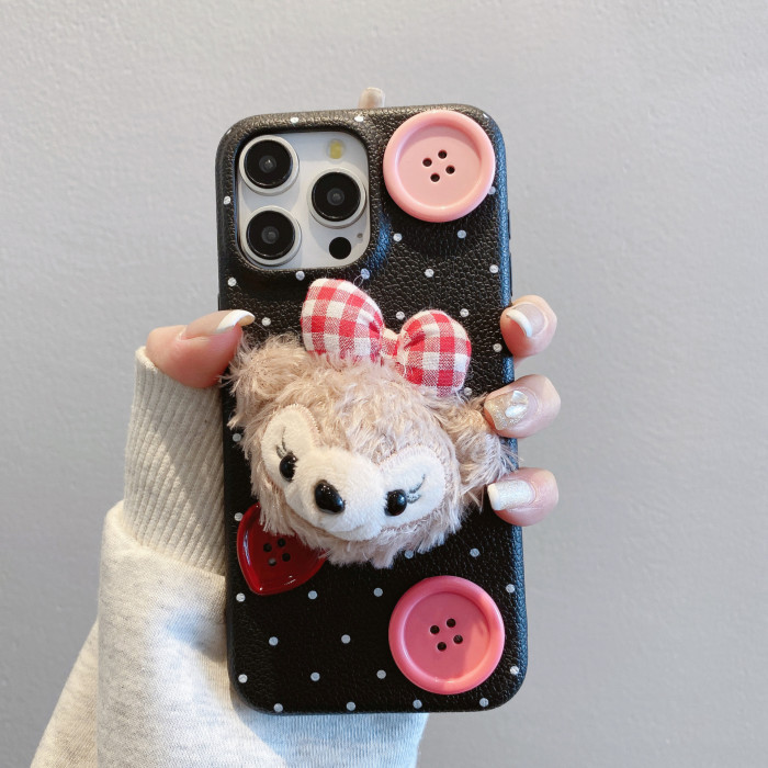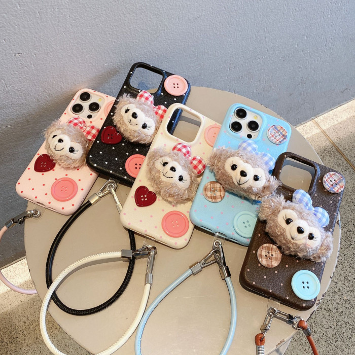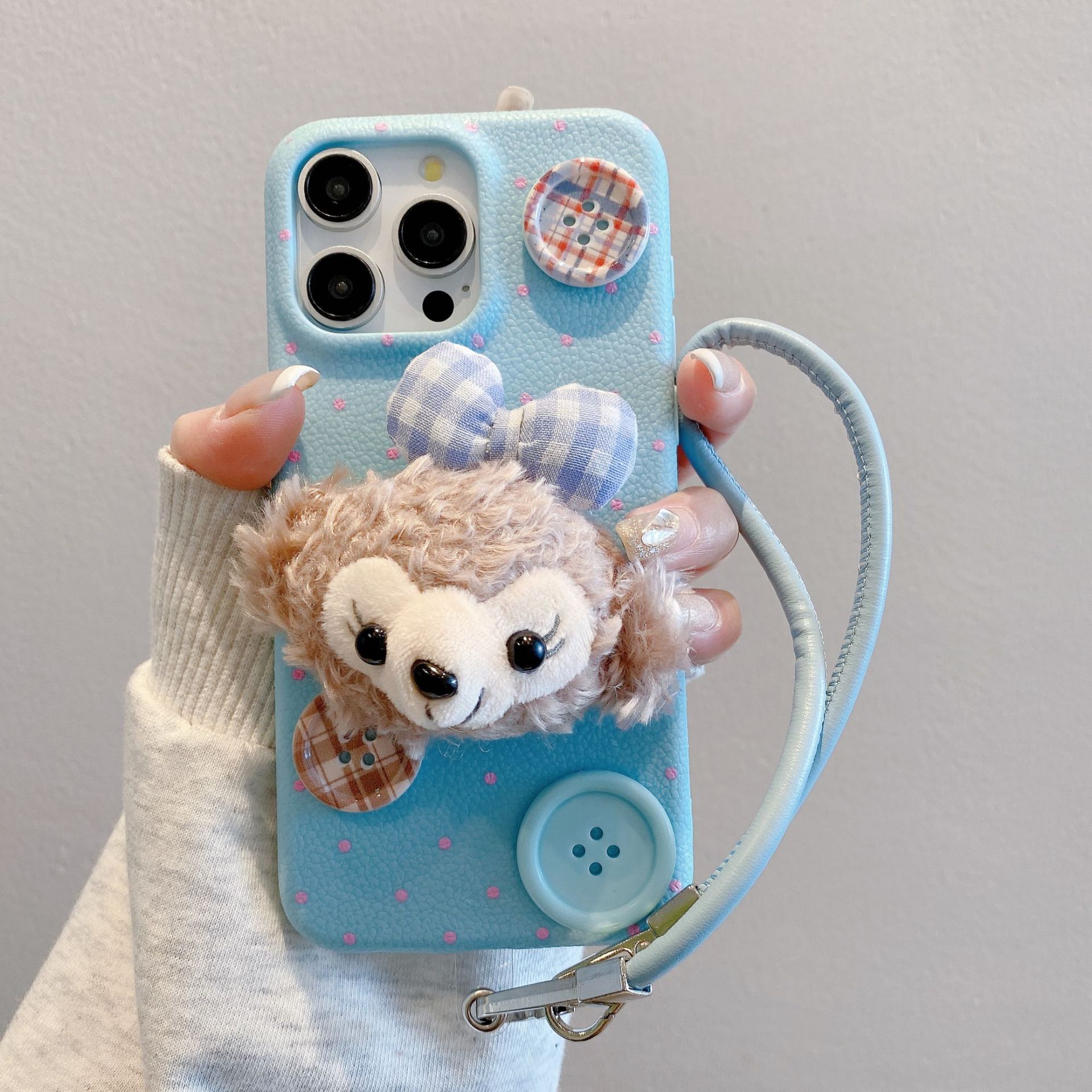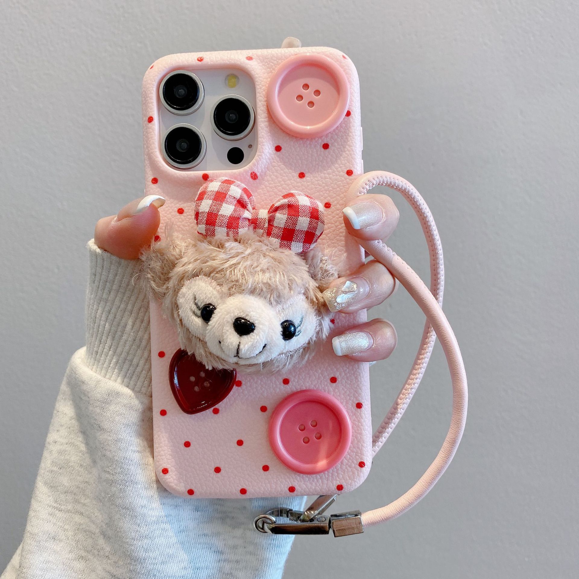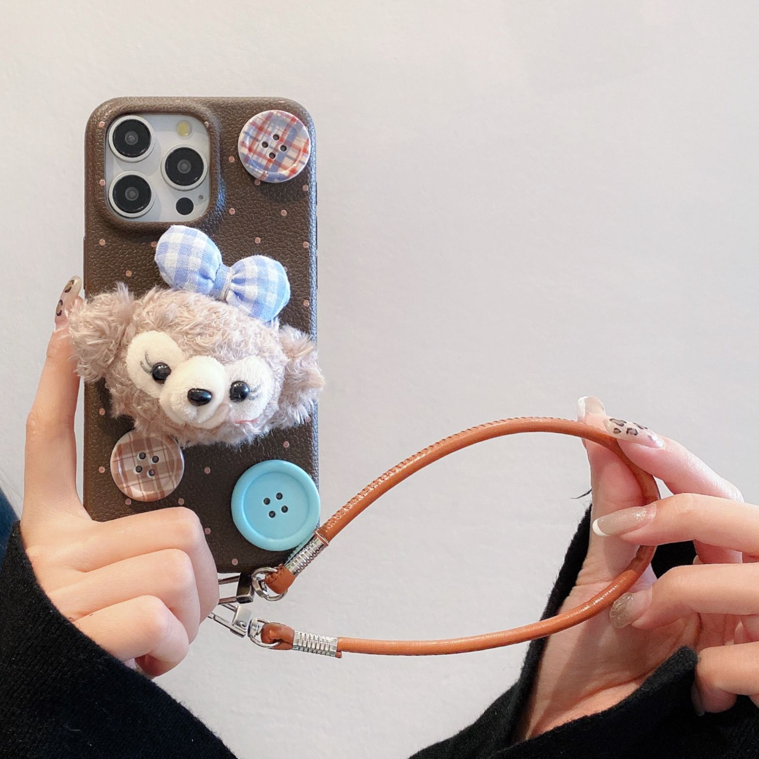 秋冬天毛絨菲熊紐釦掛繩蘋果16promax防摔全包17AIR皮紋手機殼