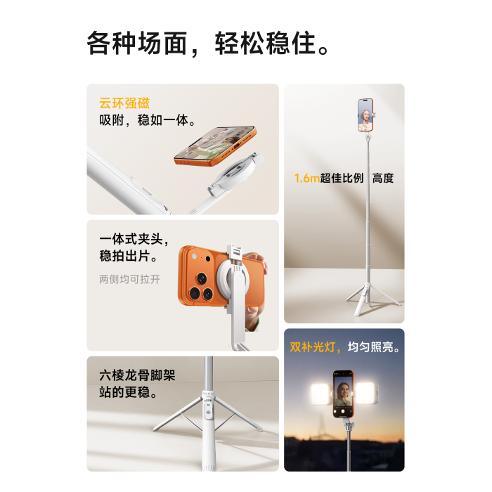 【W&P】2025新款磁吸自拍桿落地三腳架旅遊可攜式拍照通用360度旋轉藍牙手持拍攝神器MagSafe手機支架2024專用
