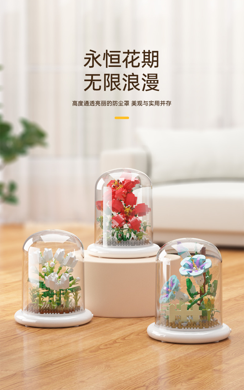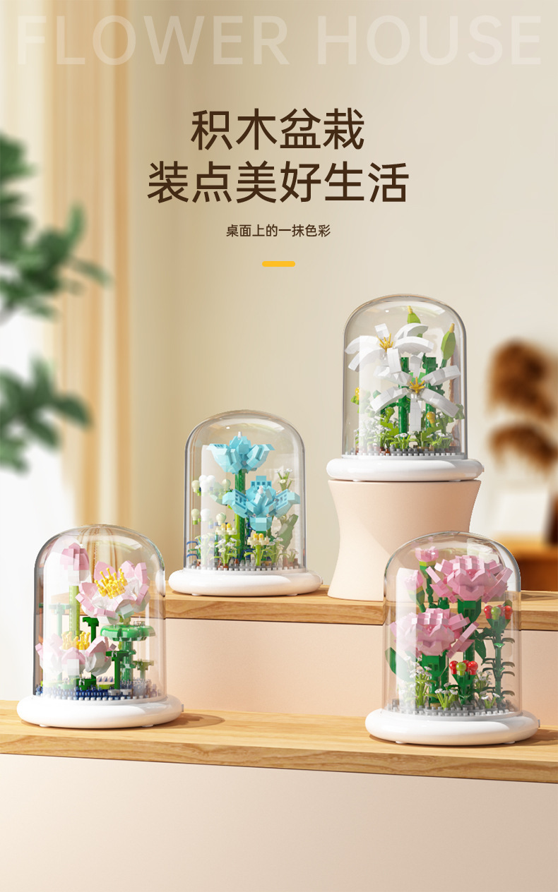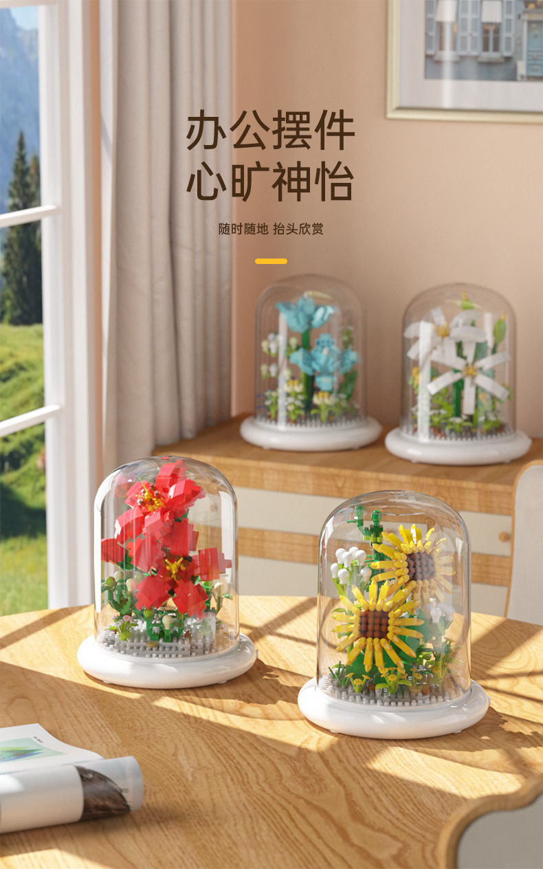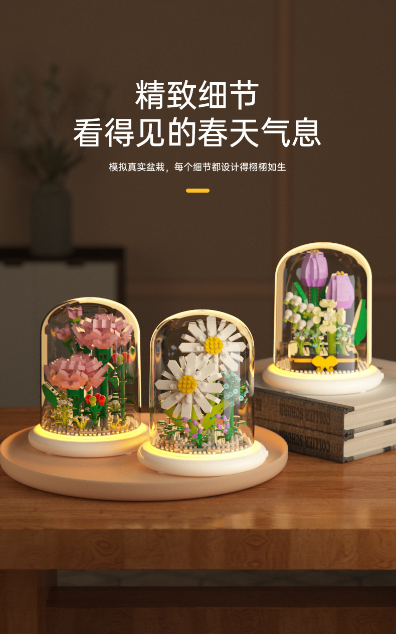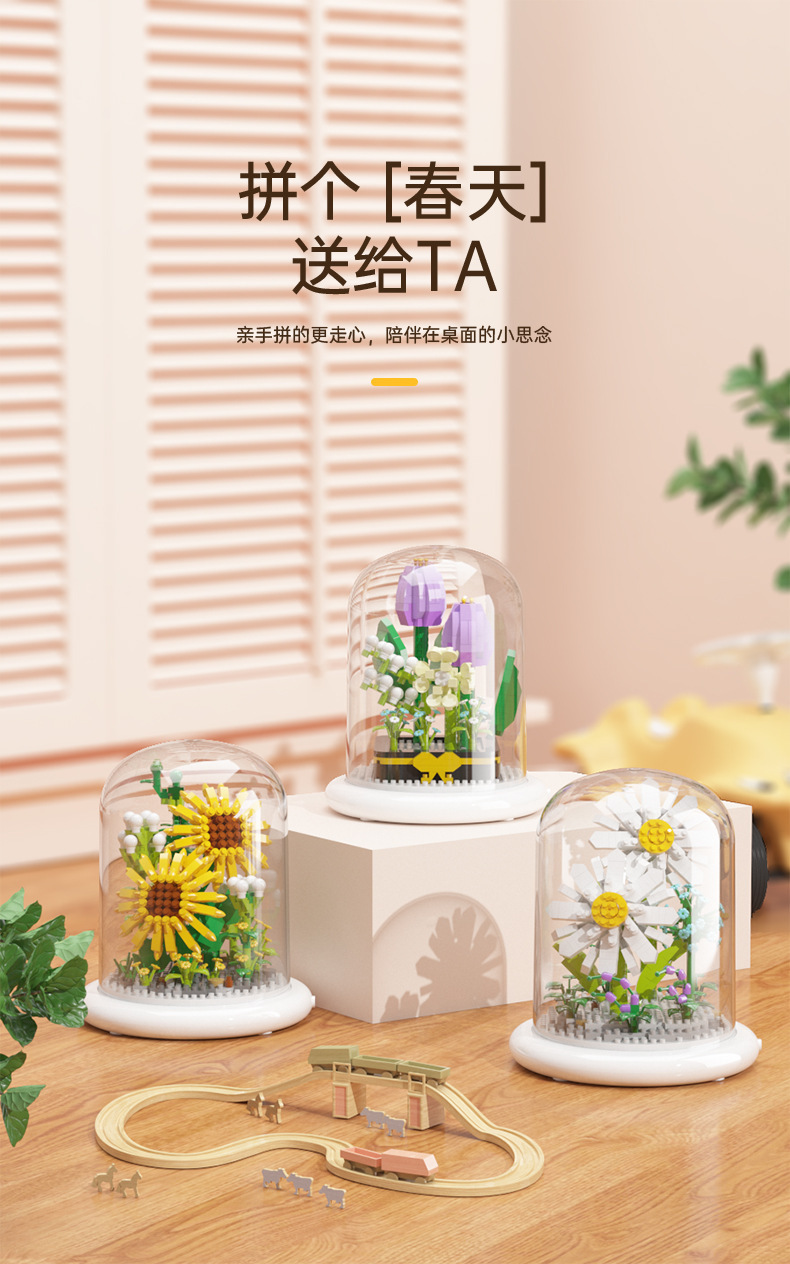 兒童積木玩具兼容某高小顆粒盆栽永生花玫瑰向日葵積木花束拼插花