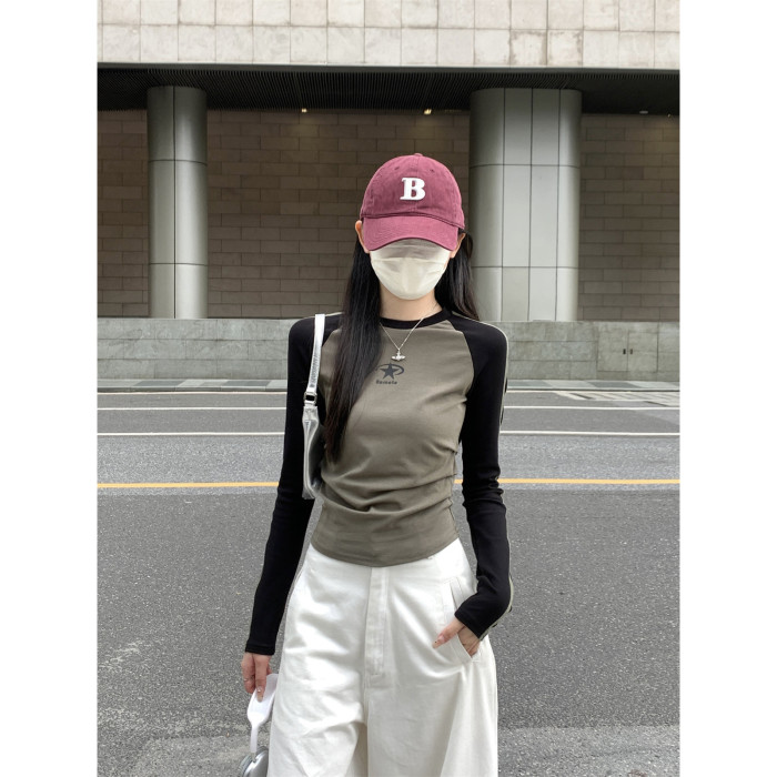 春秋冬季新款ins撞色插肩袖印花T恤女上衣美式辣妹長袖T恤打底衫