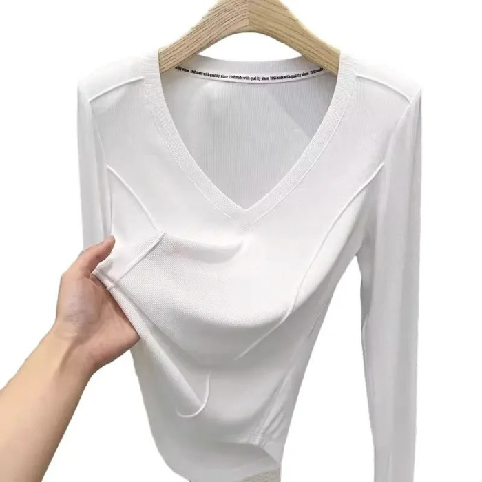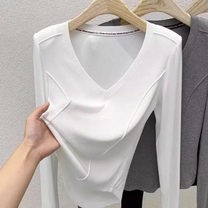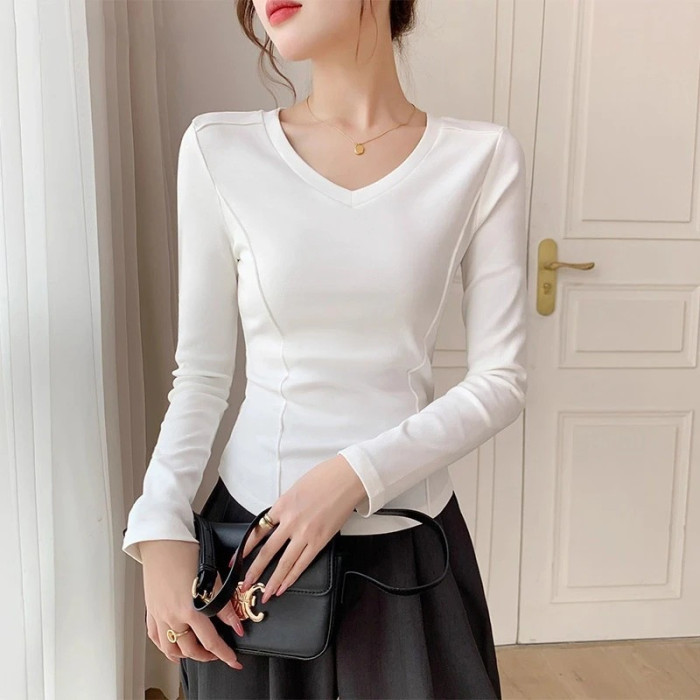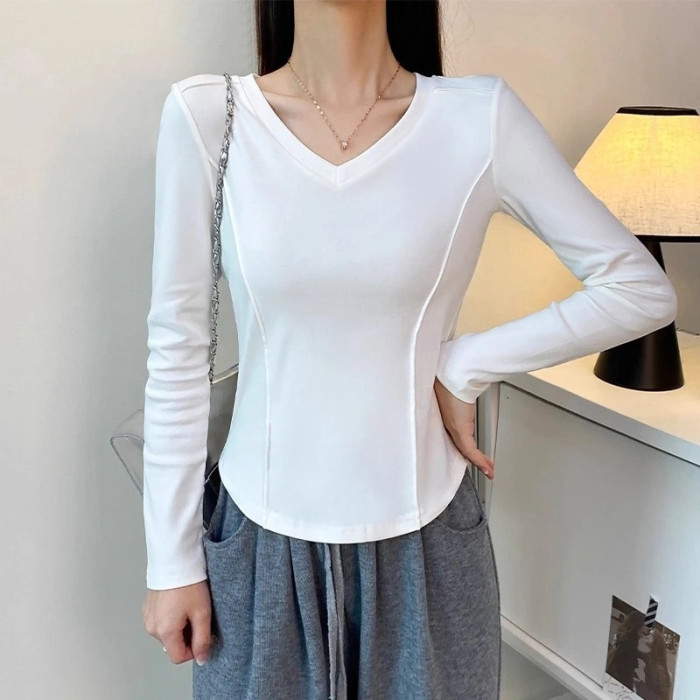 秋冬款v領設計領純棉長袖t恤女早秋寬松休閒百搭防曬罩衫打底上衣