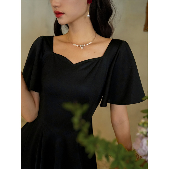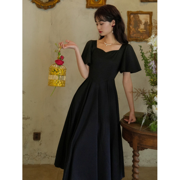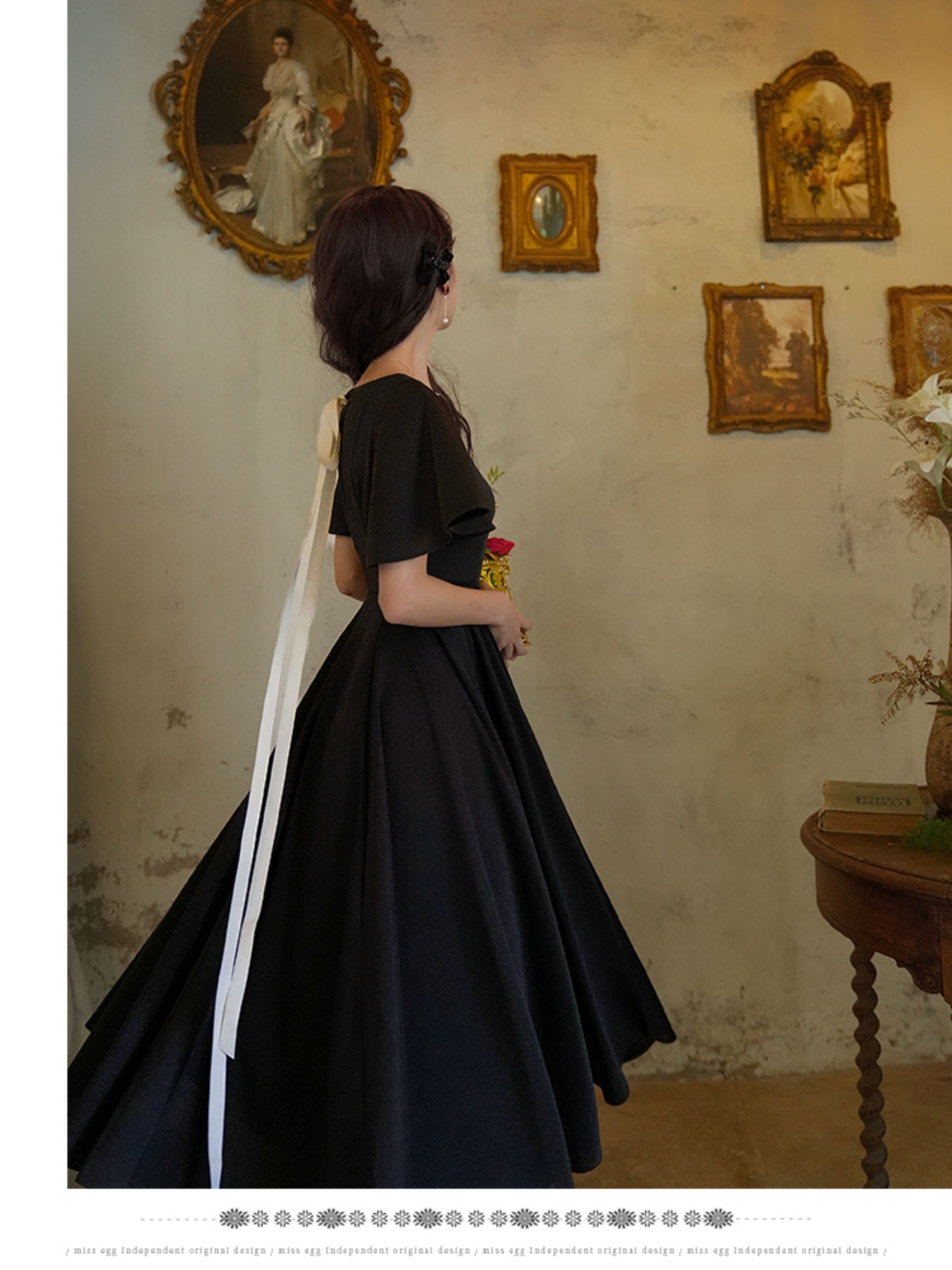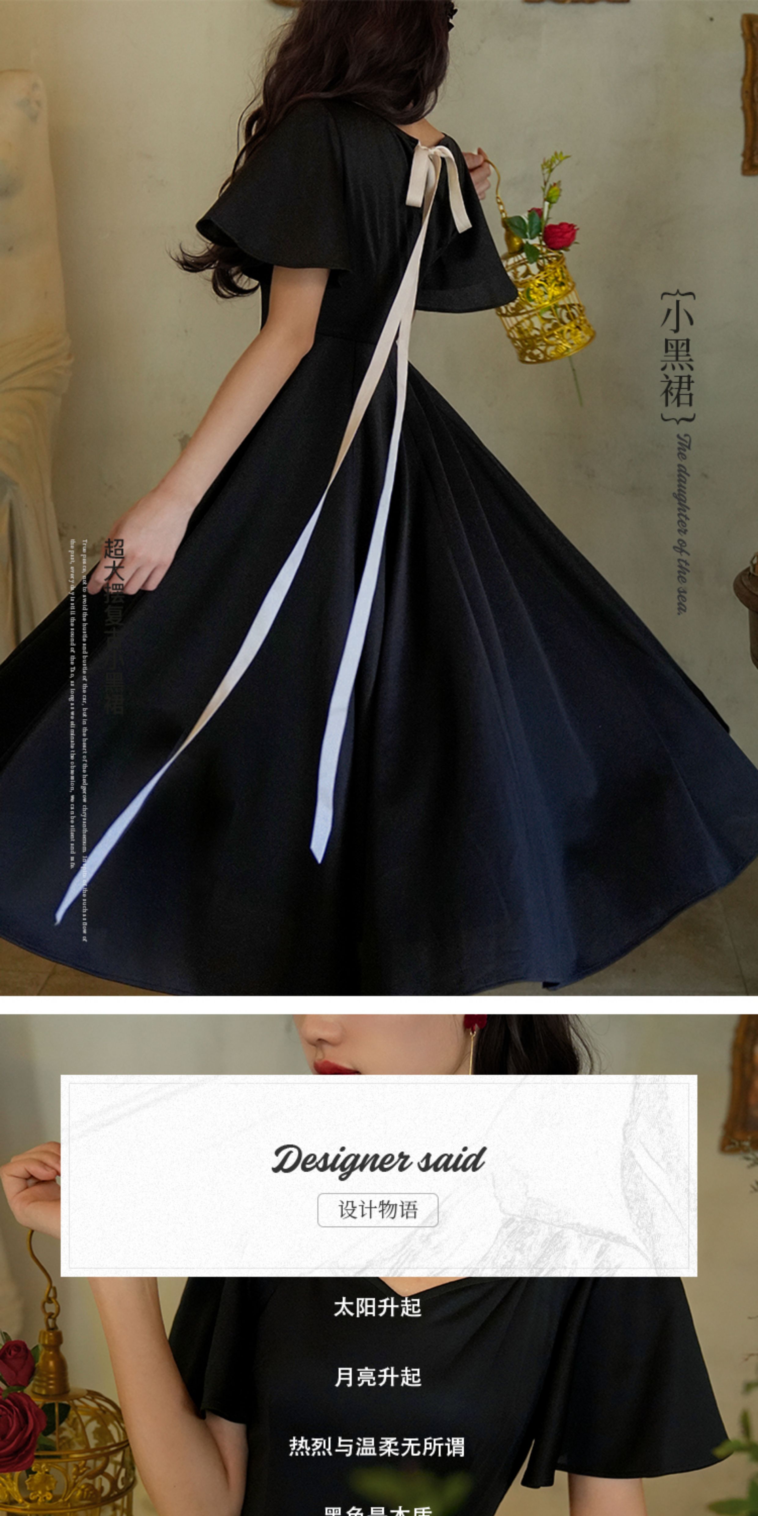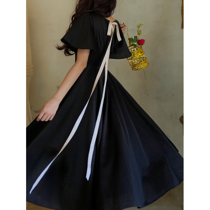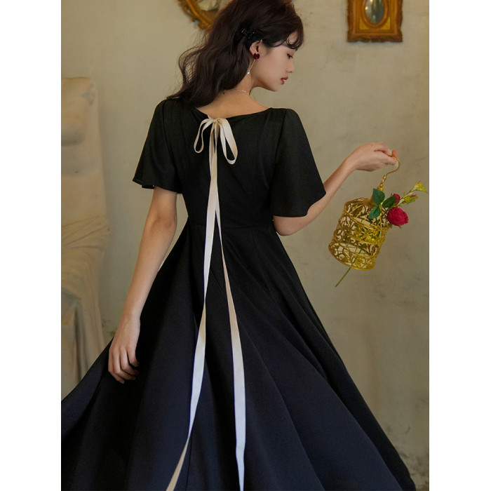 彌愛原創《小黑裙》法式復古赫本風短袖大擺高腰飄帶連衣裙顯瘦夏