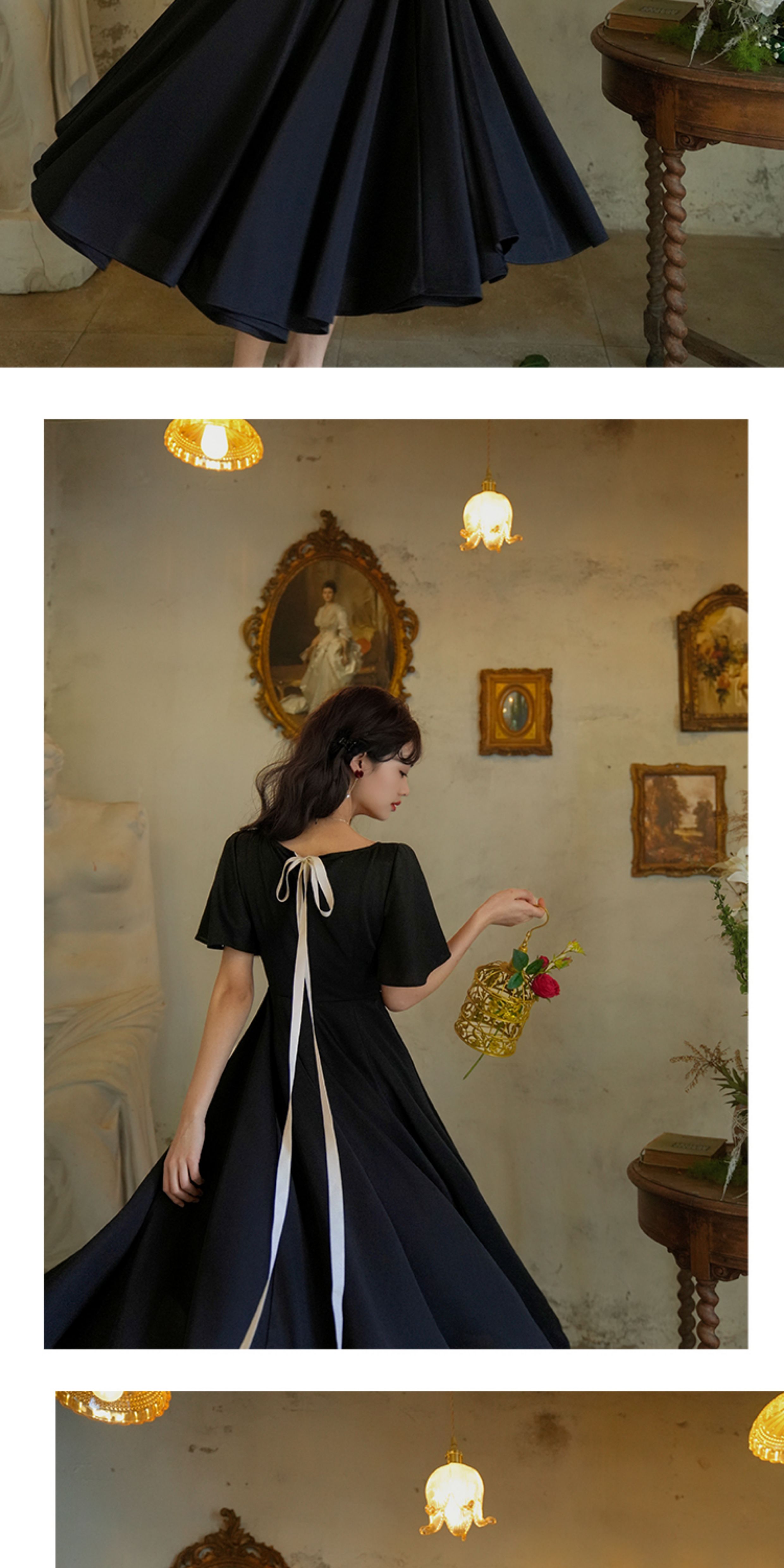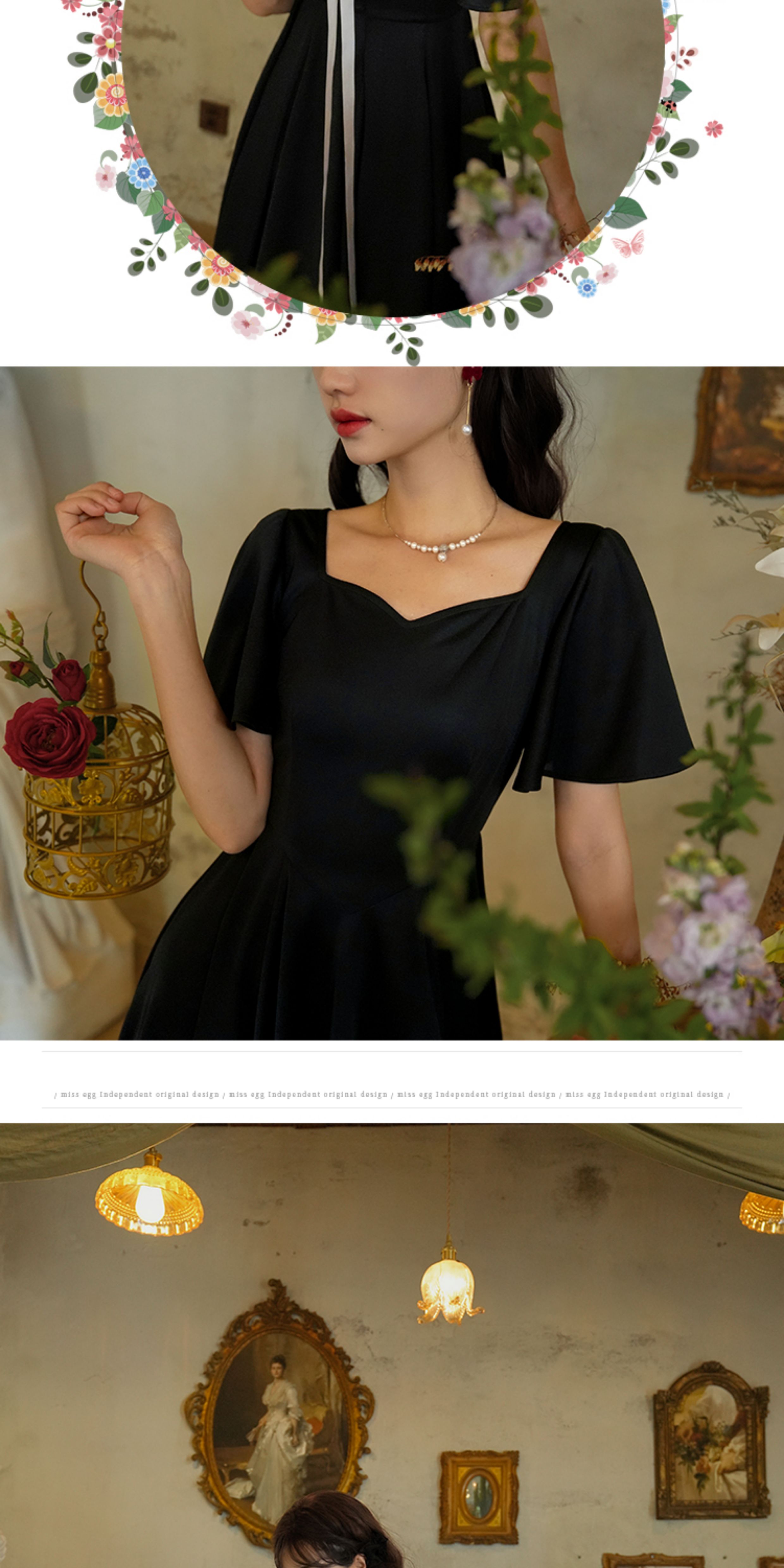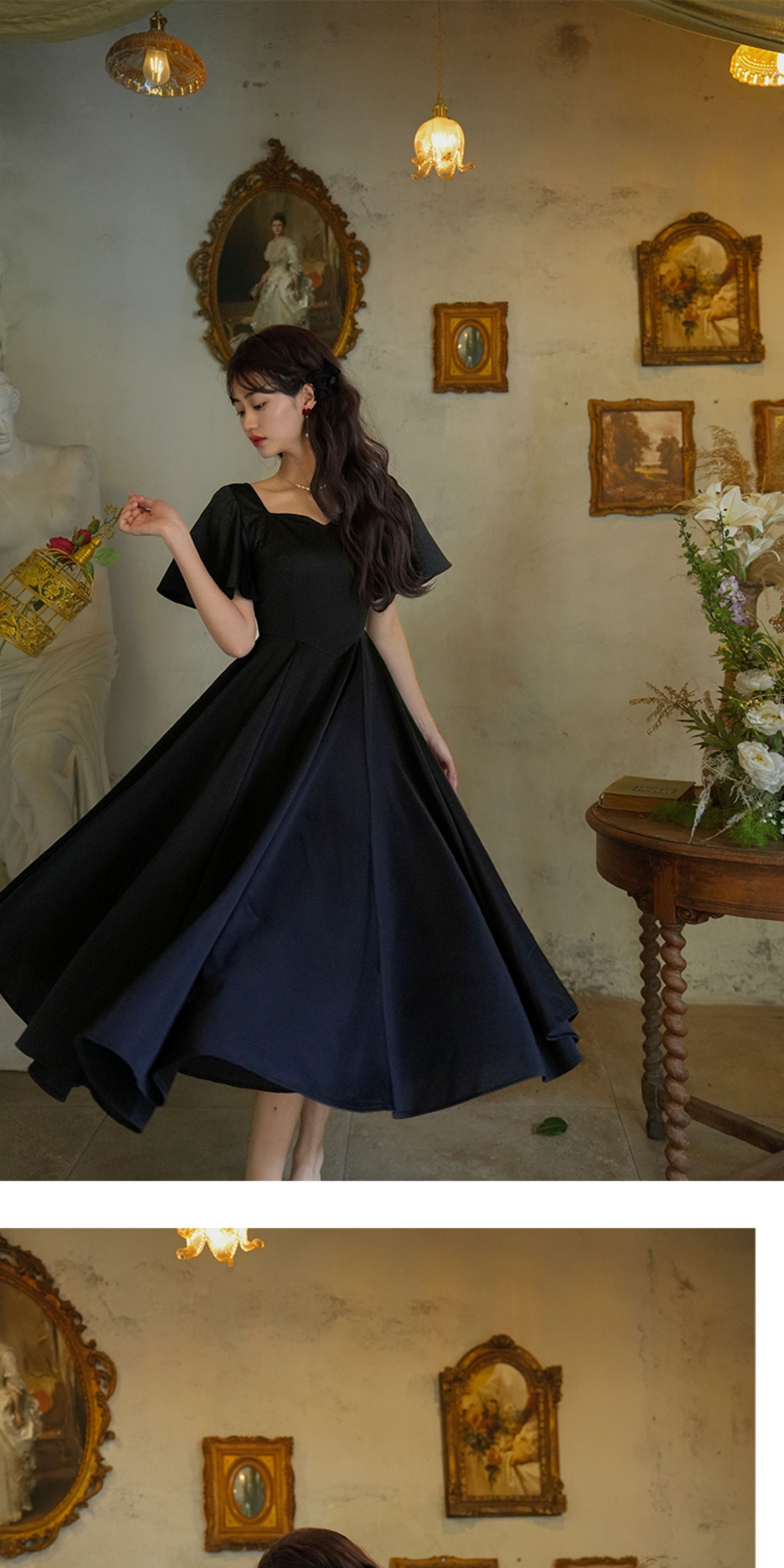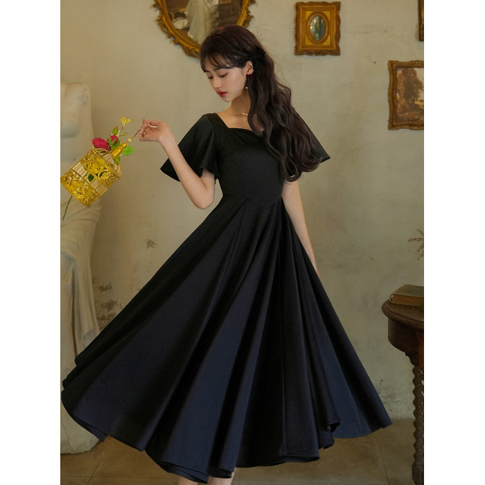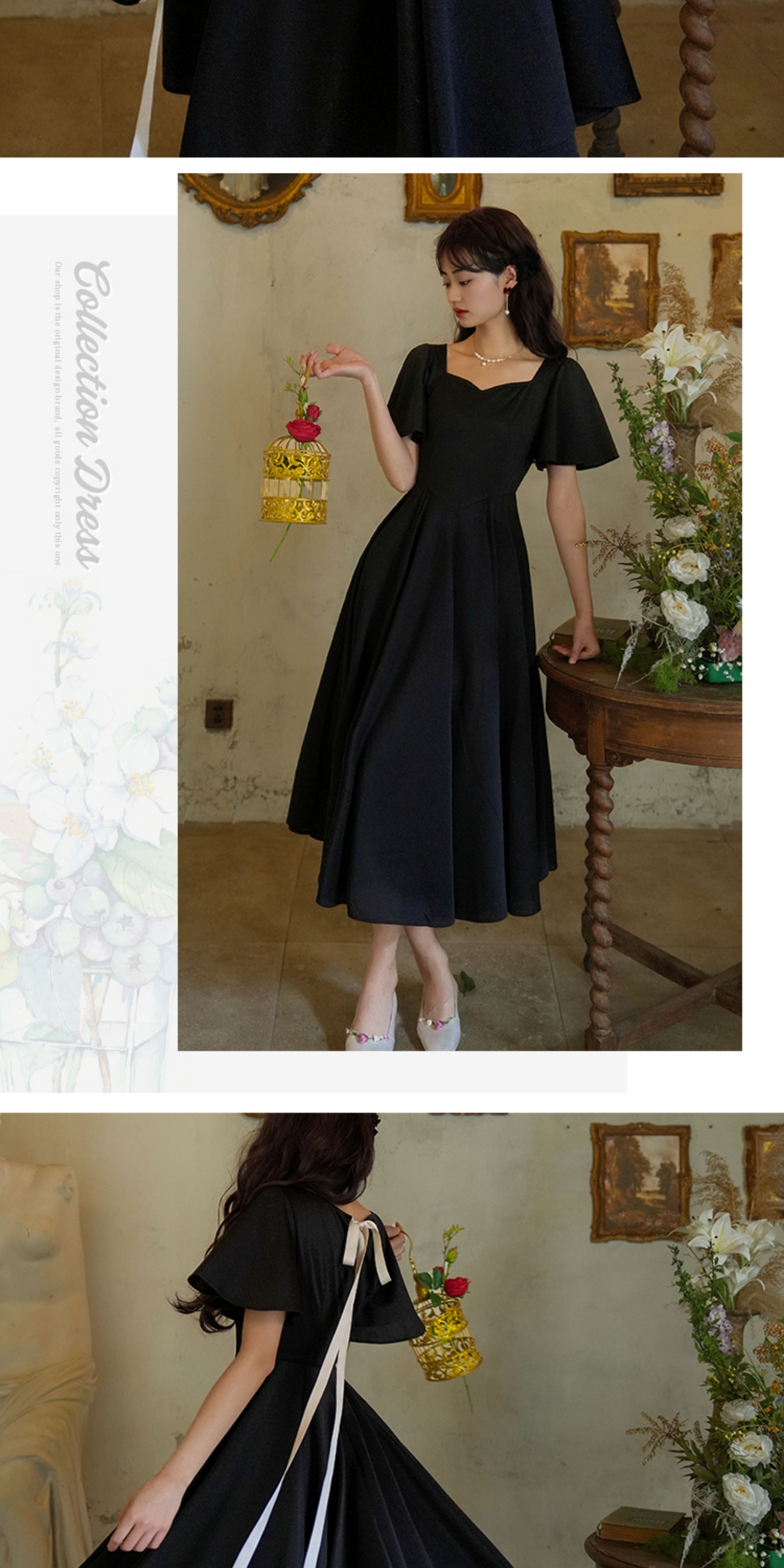 彌愛原創《小黑裙》法式復古赫本風短袖大擺高腰飄帶連衣裙顯瘦夏