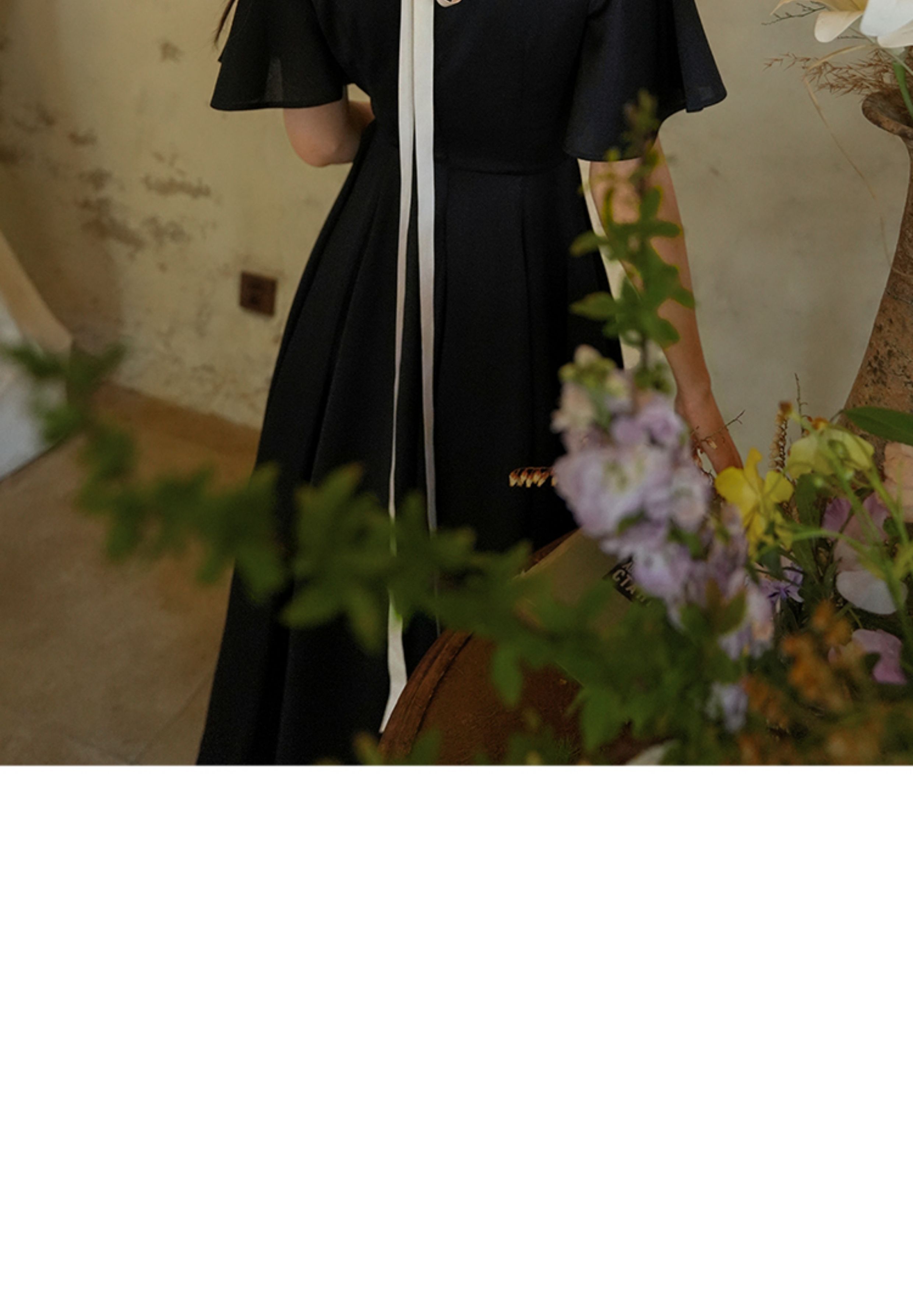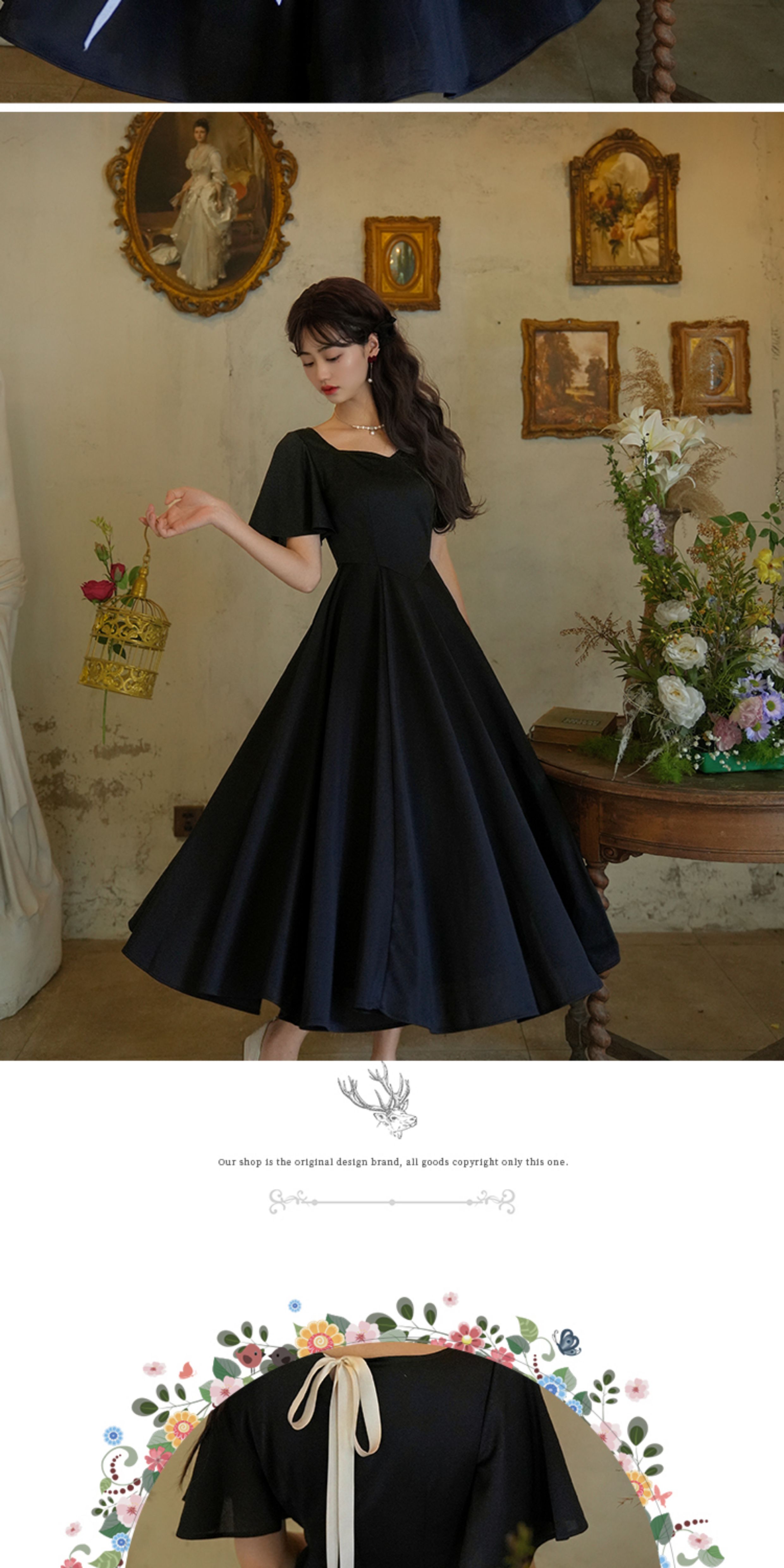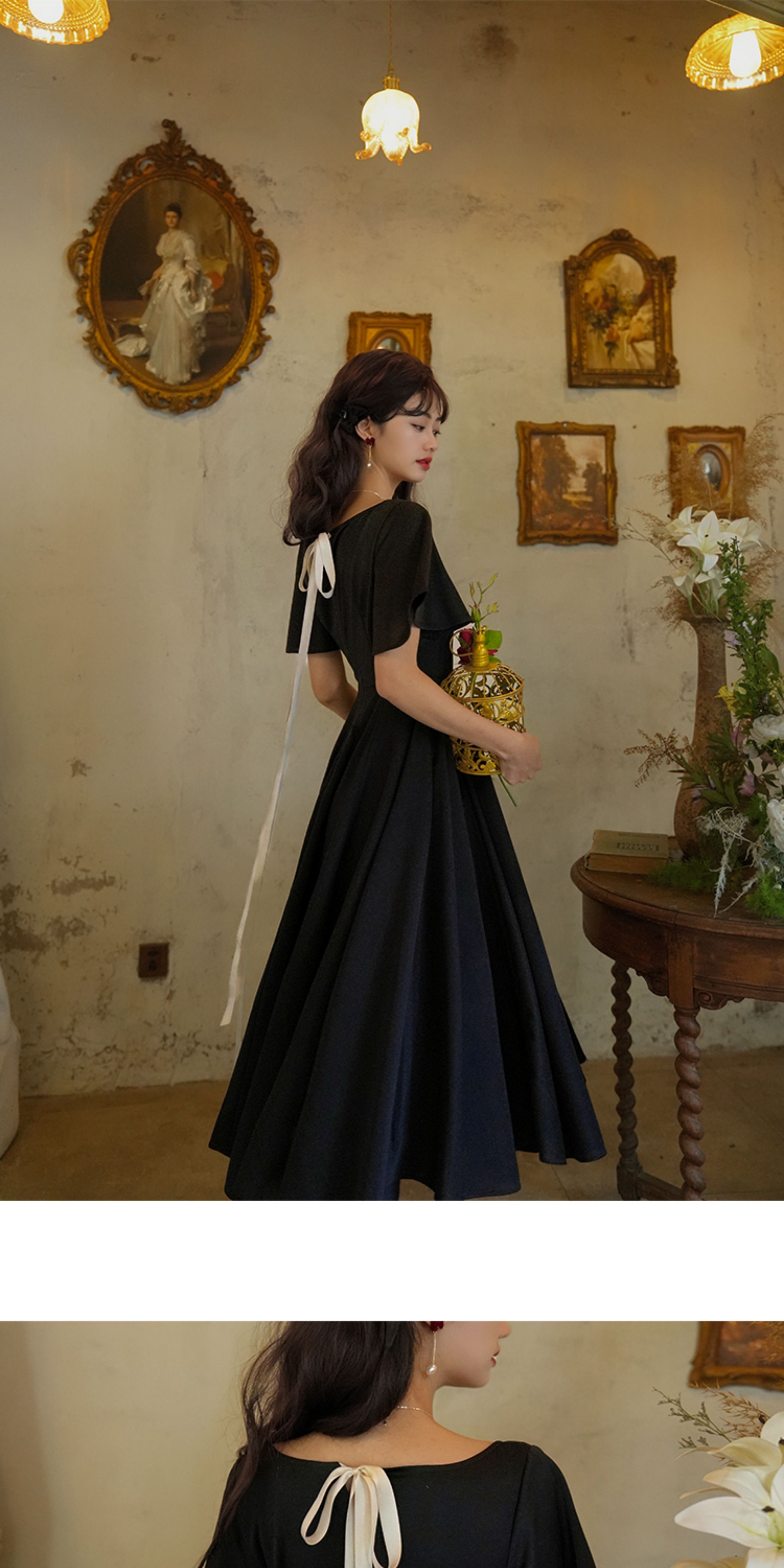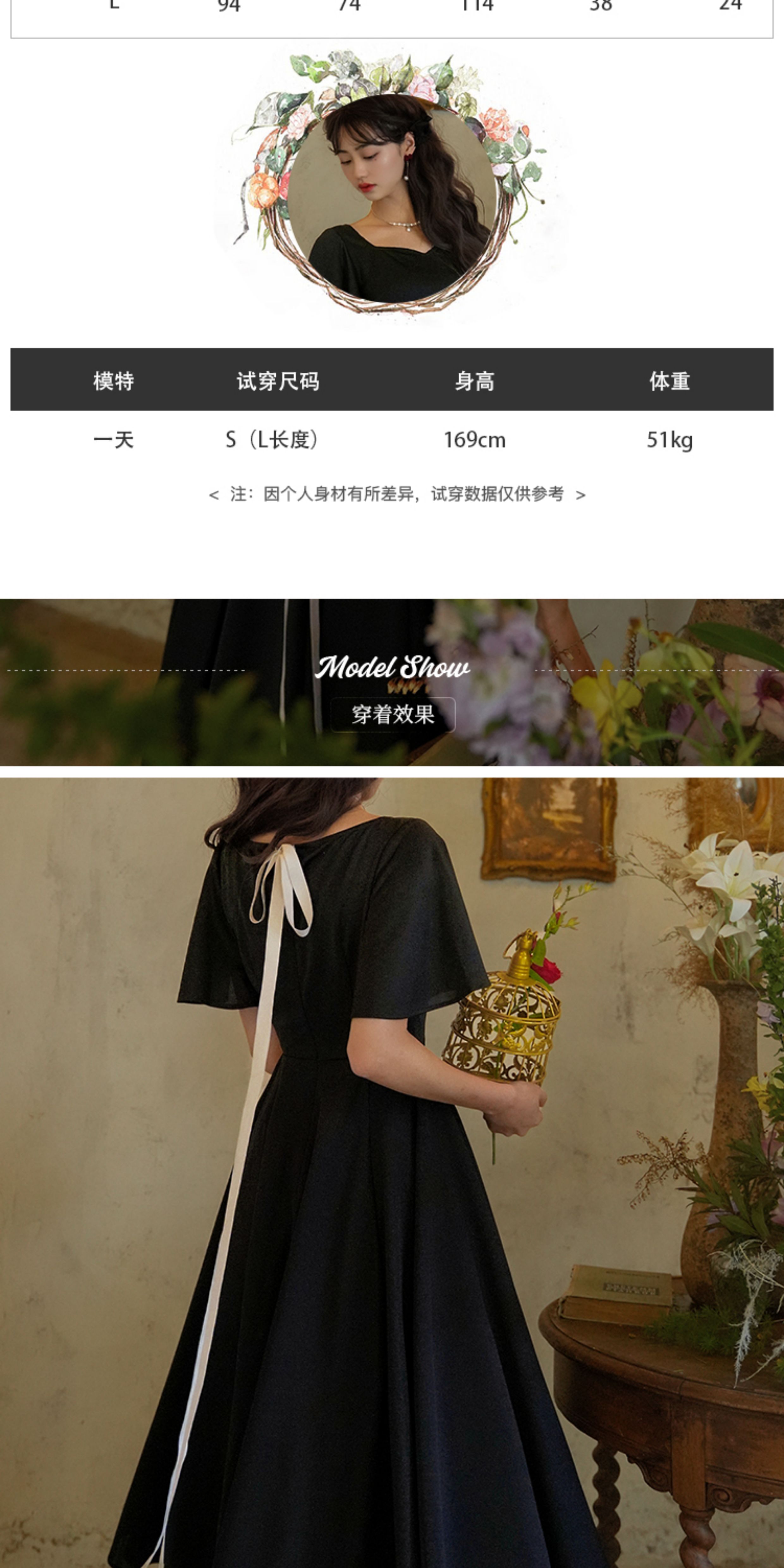 彌愛原創《小黑裙》法式復古赫本風短袖大擺高腰飄帶連衣裙顯瘦夏