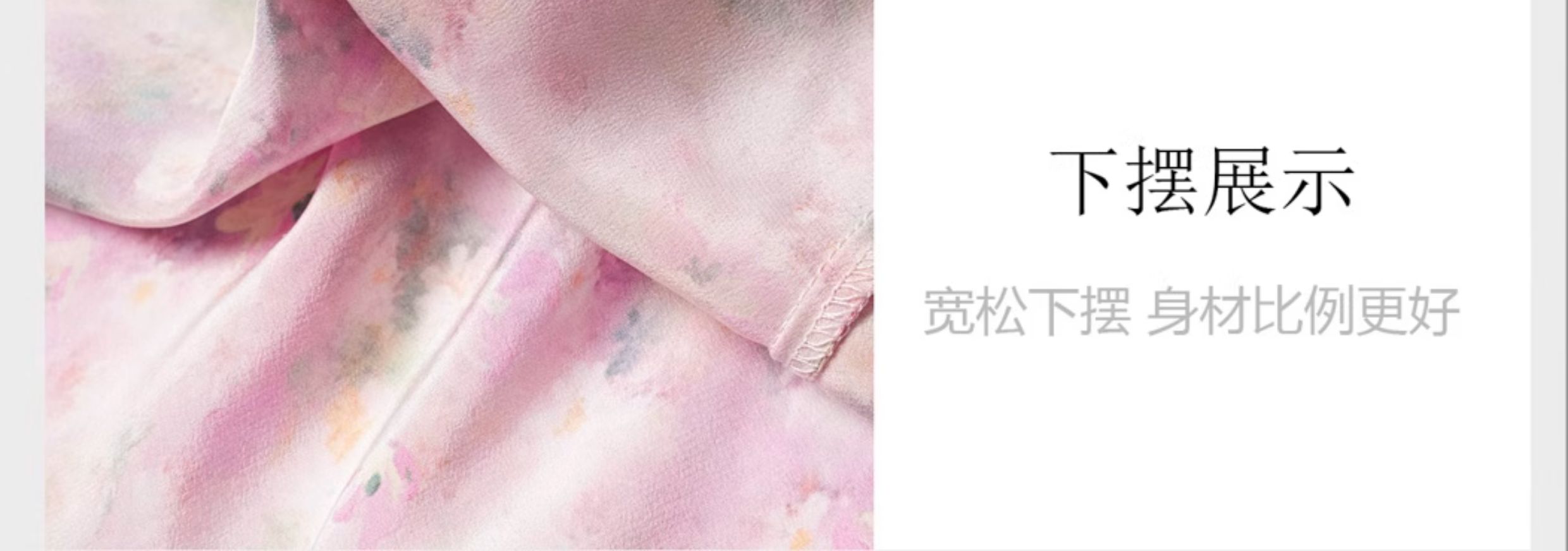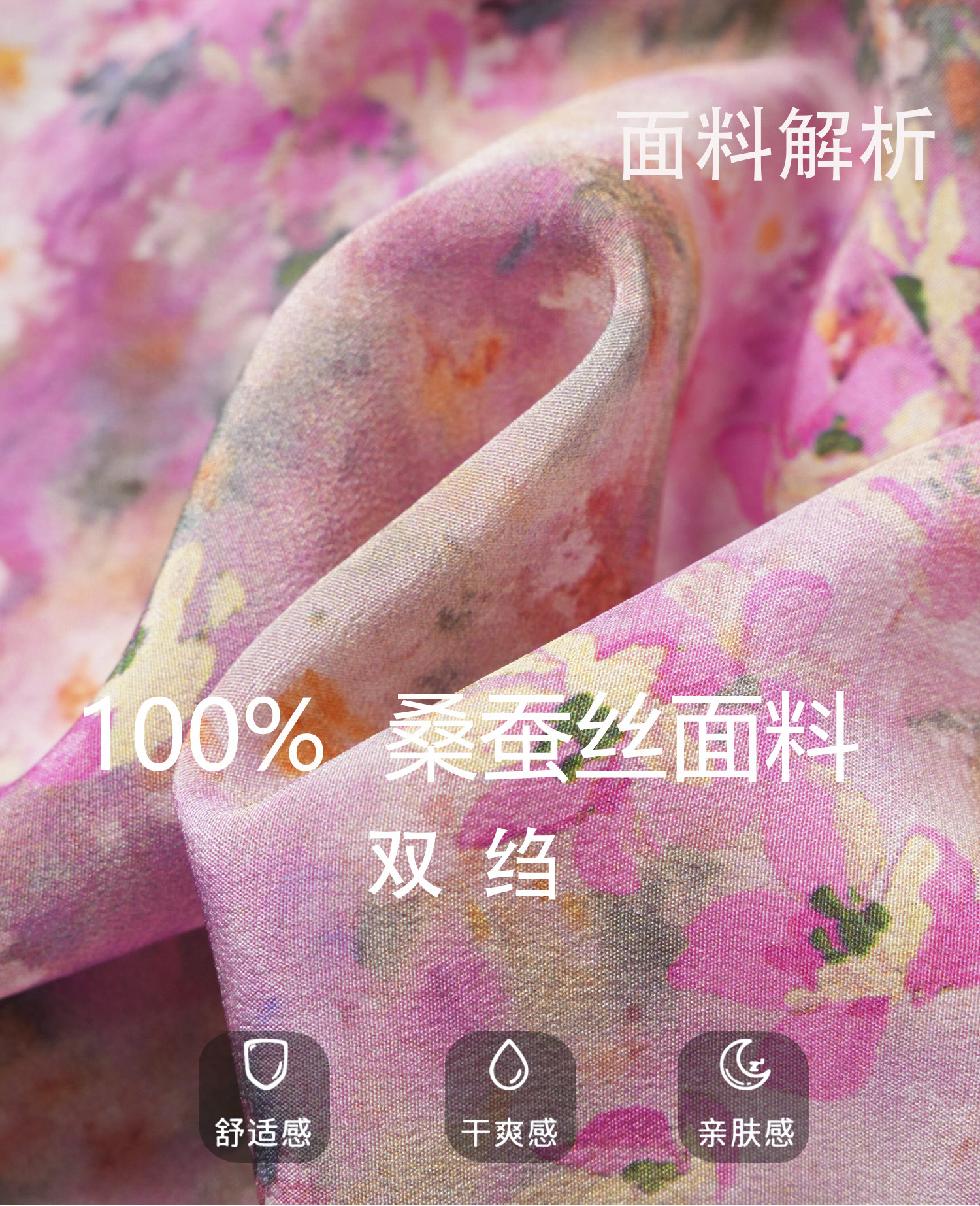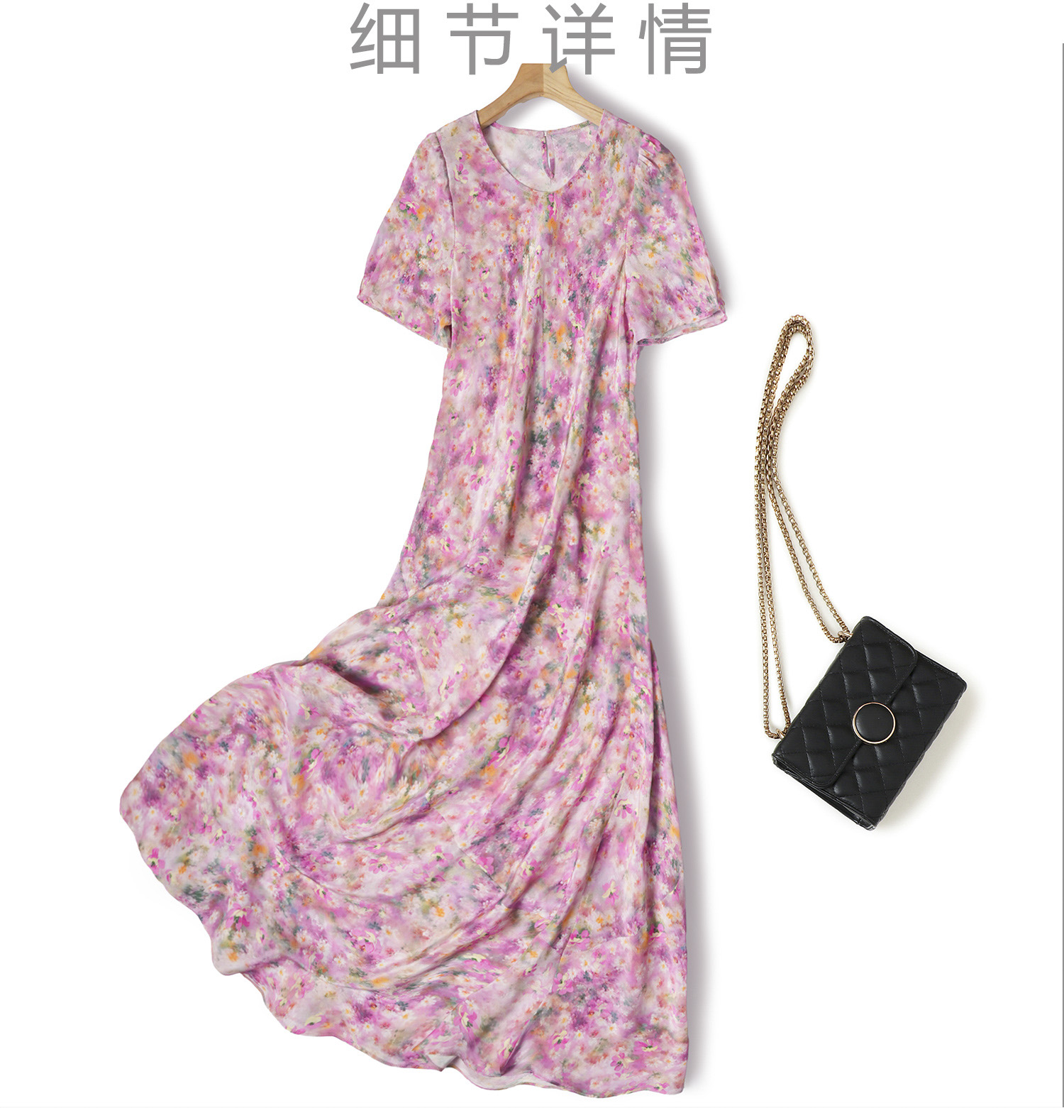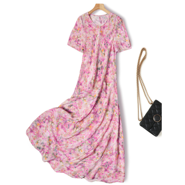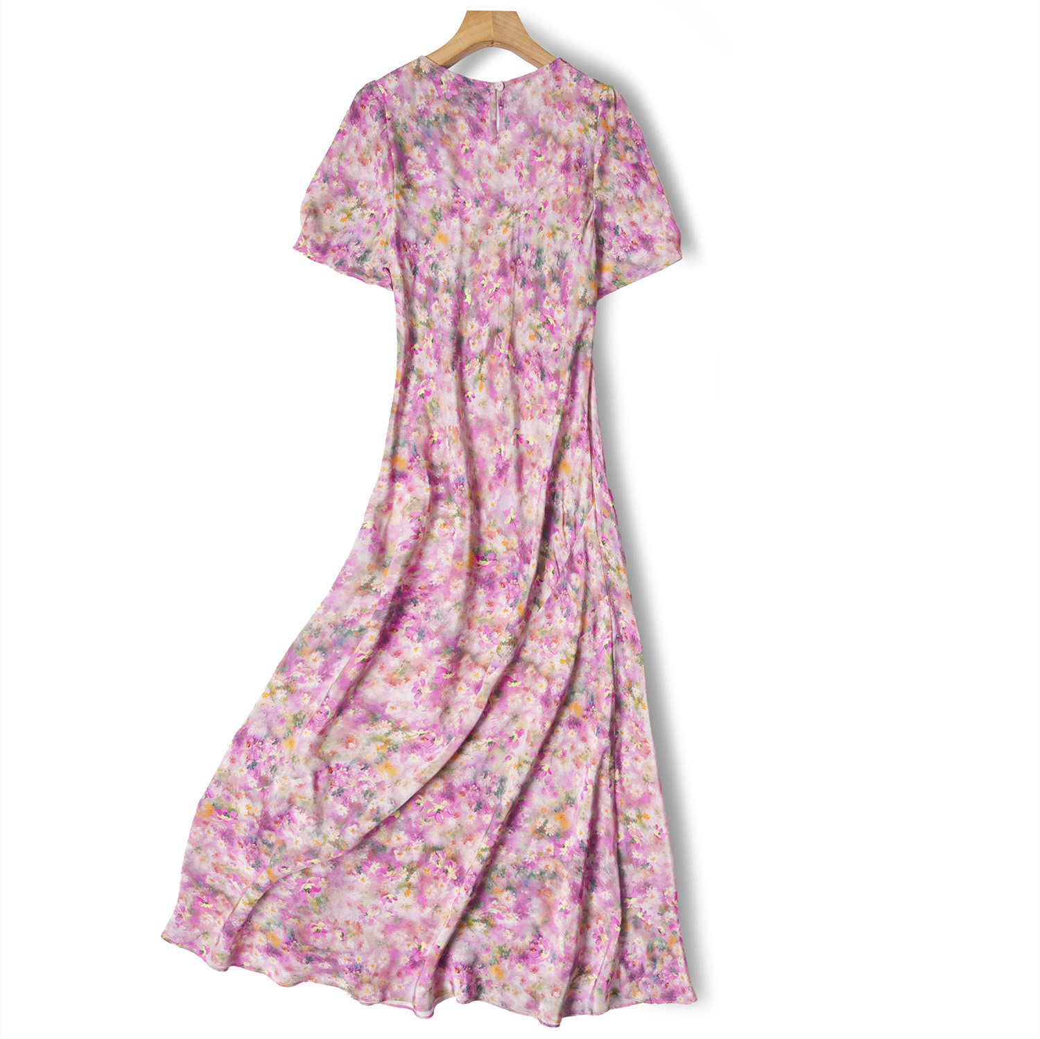 立體斜裁!桑蠶絲暈染印花短袖法式真絲連衣裙時尚修身長裙顯瘦女