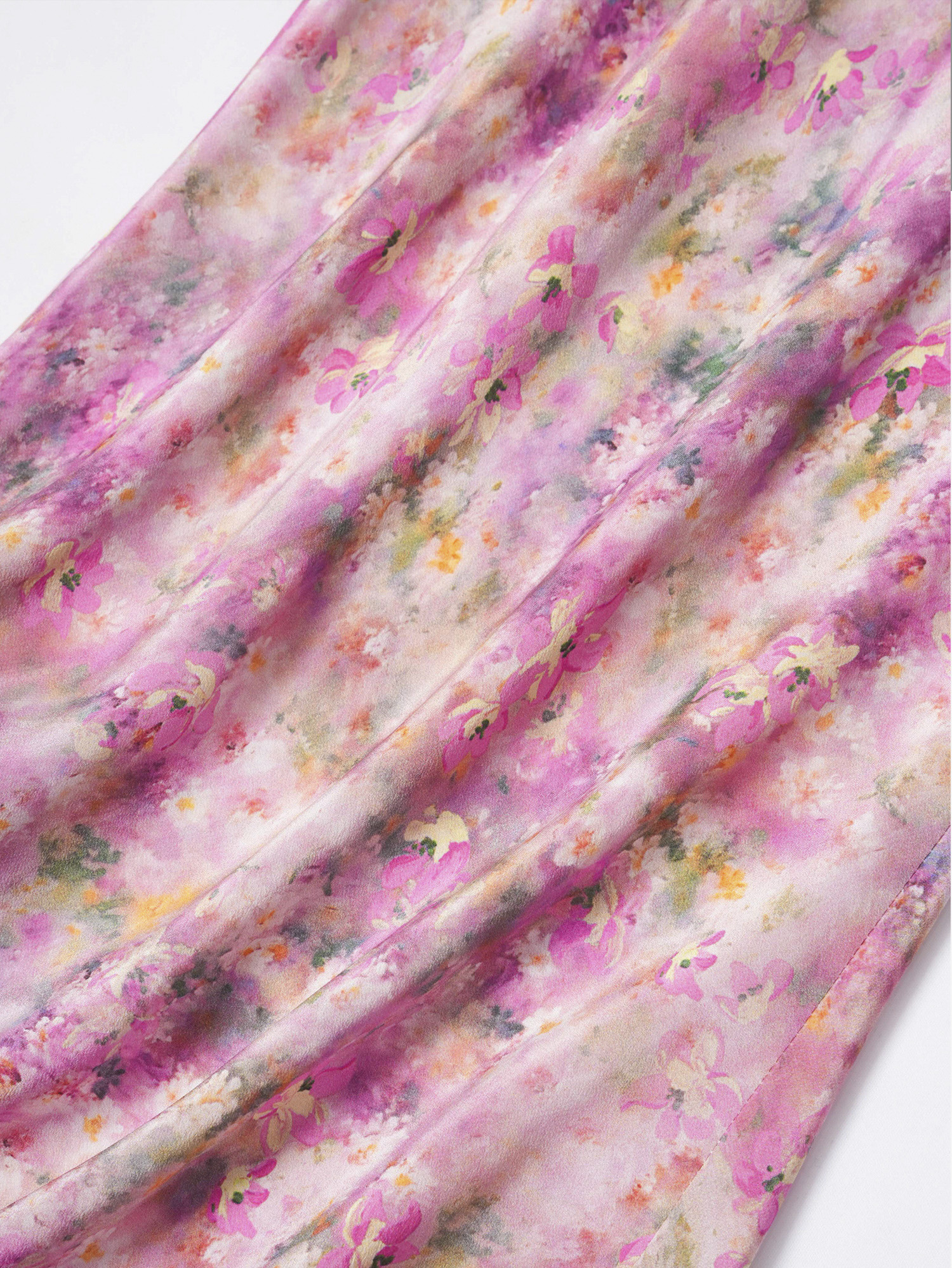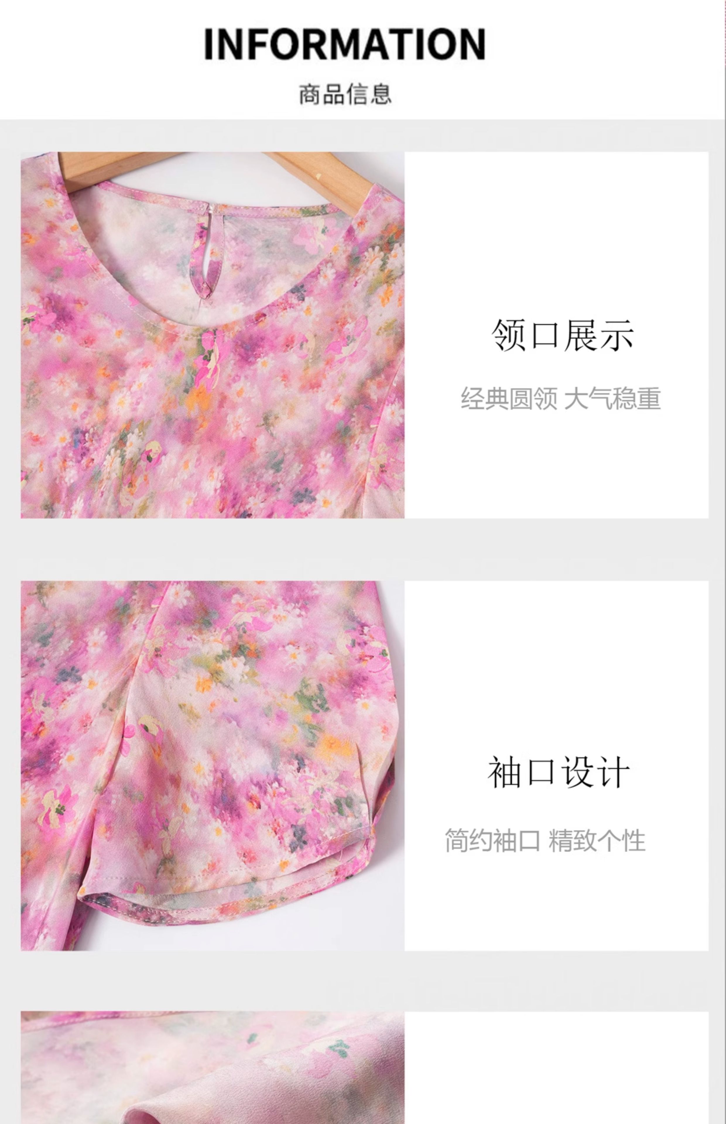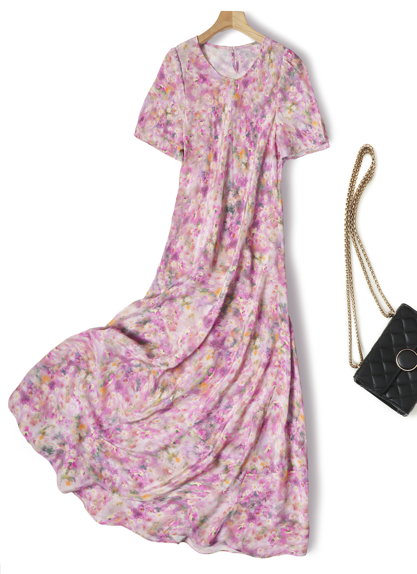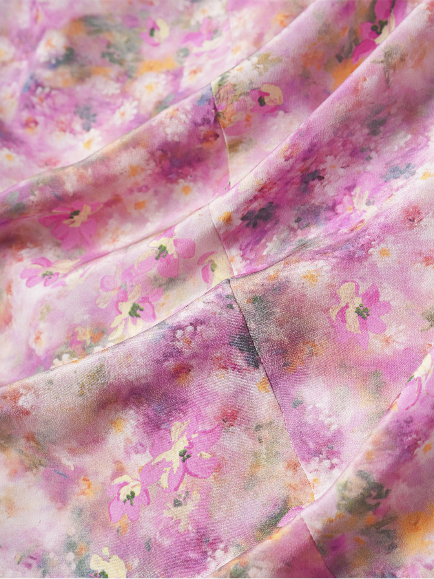 立體斜裁!桑蠶絲暈染印花短袖法式真絲連衣裙時尚修身長裙顯瘦女