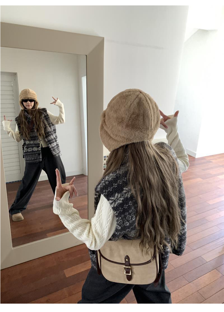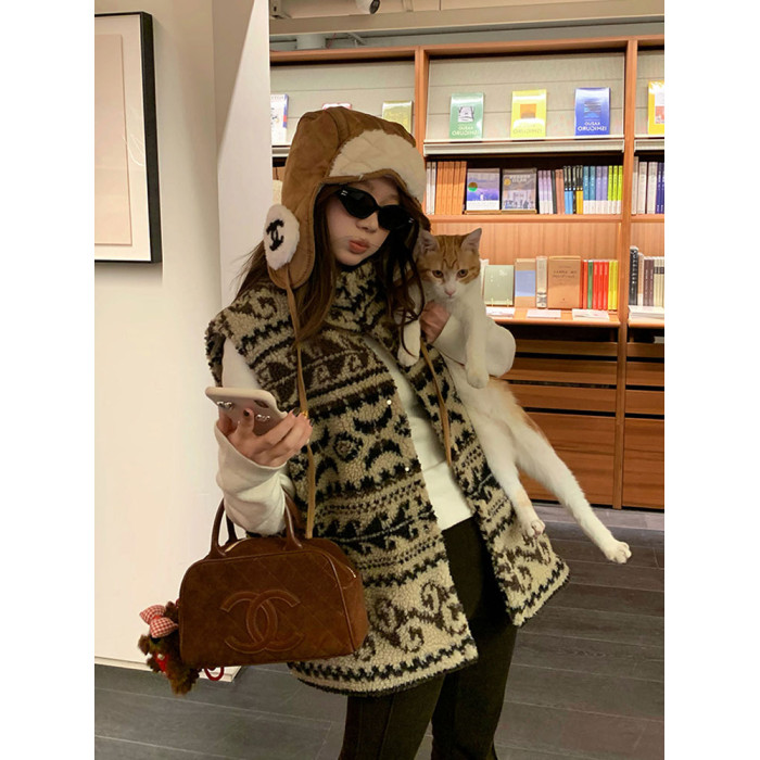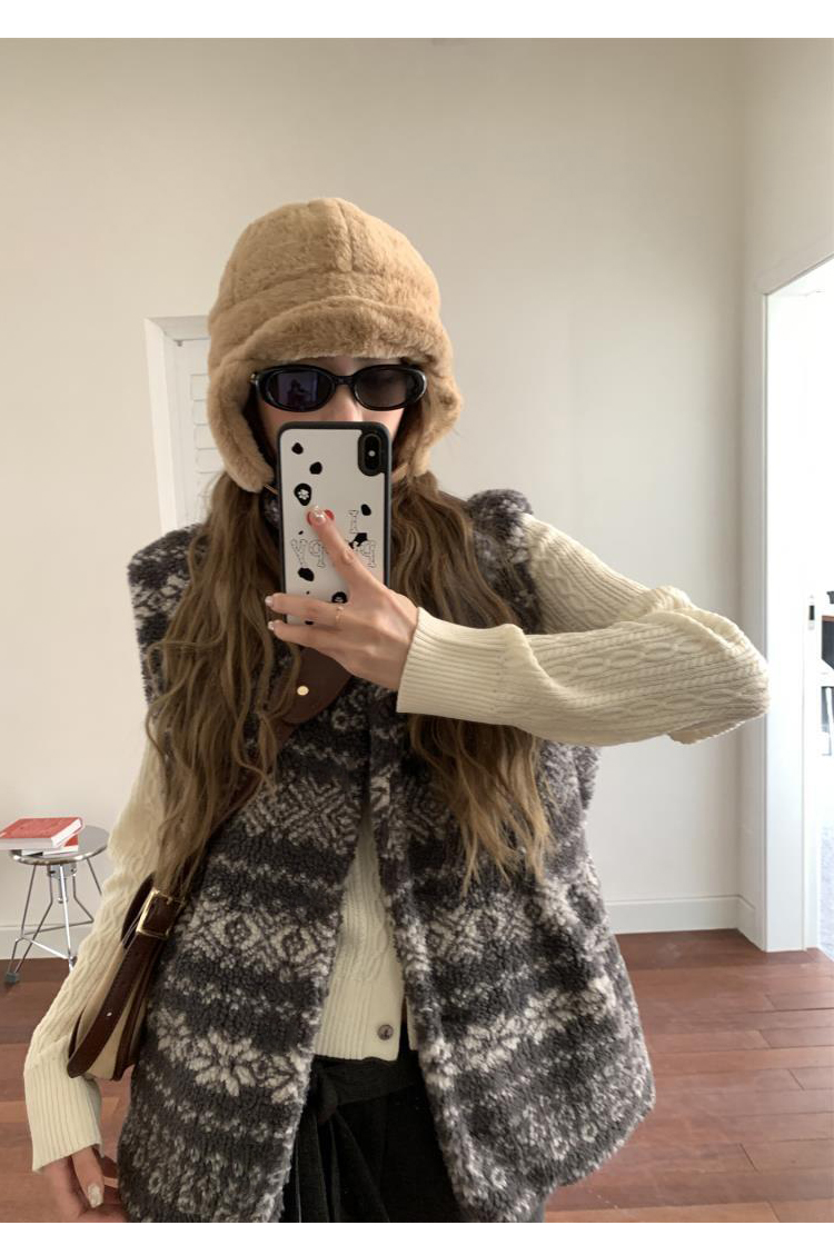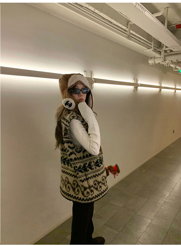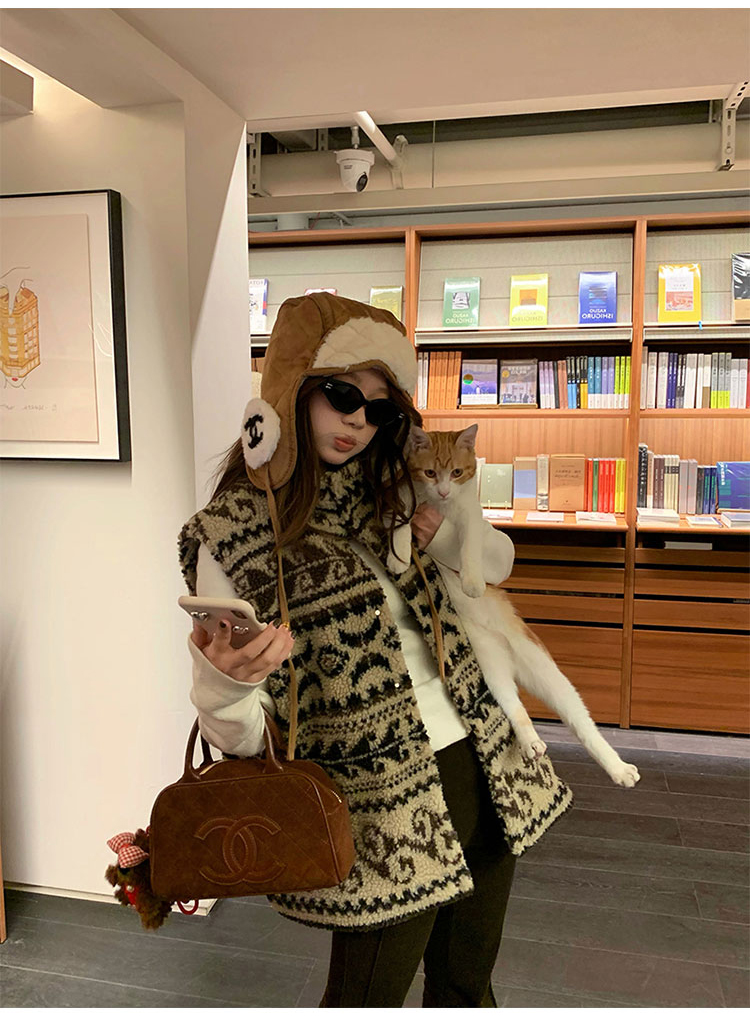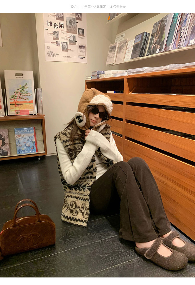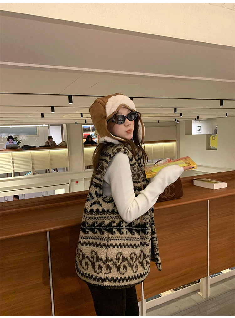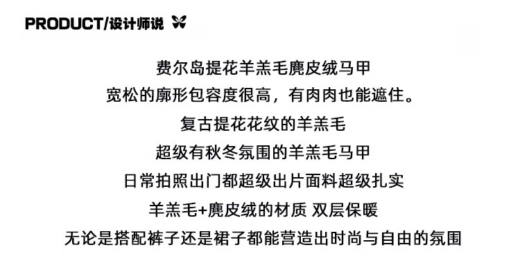 費爾島提花羊羔毛馬甲女2025新款立領韓系外穿麂皮絨皮毛一體馬甲