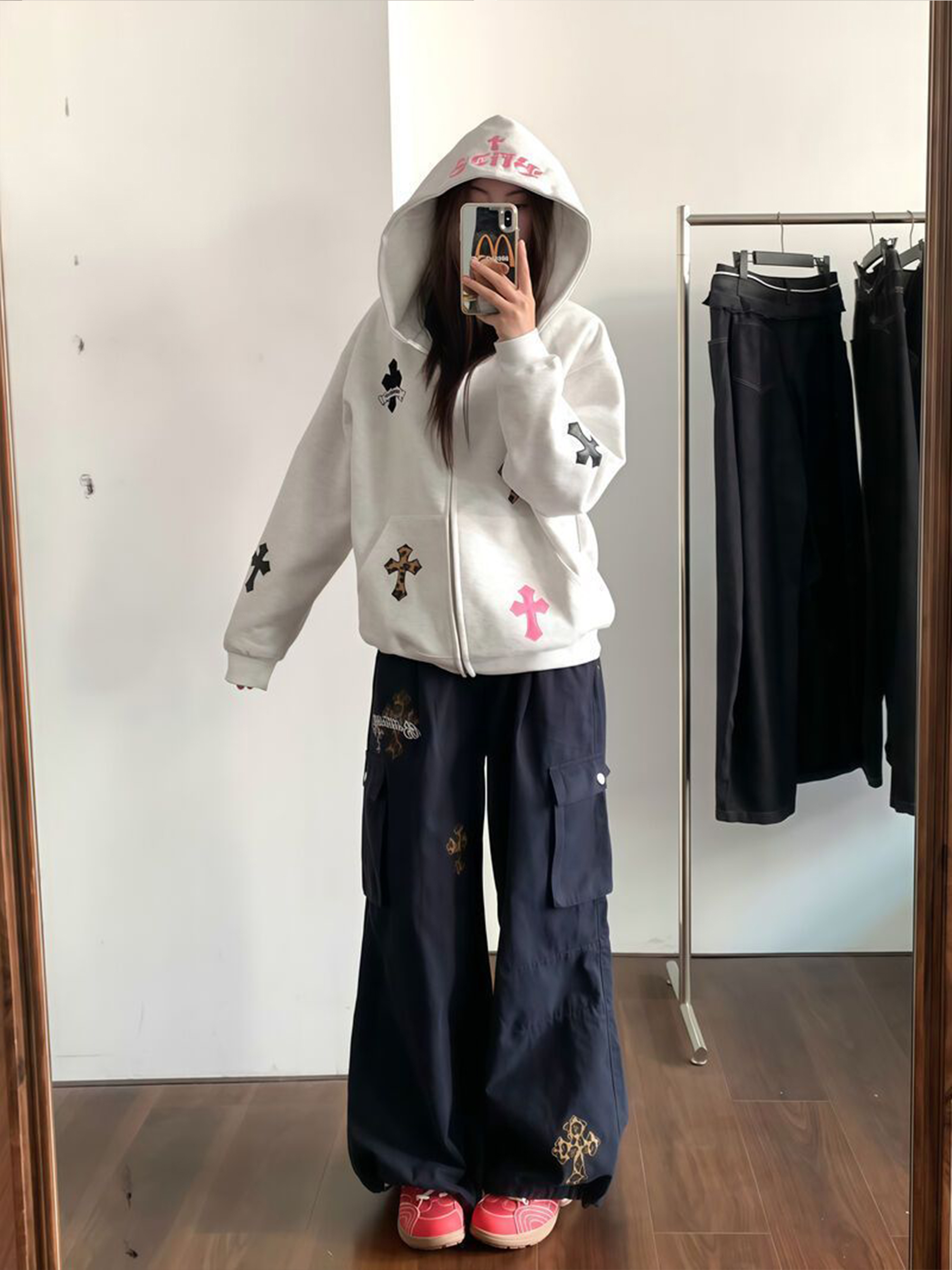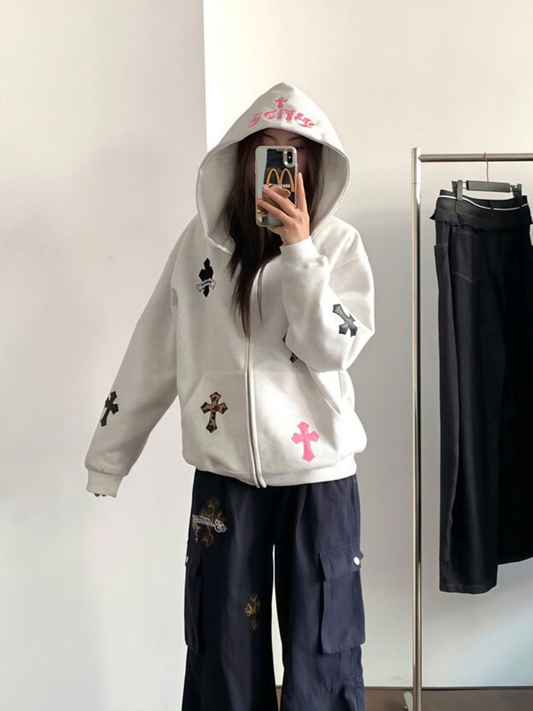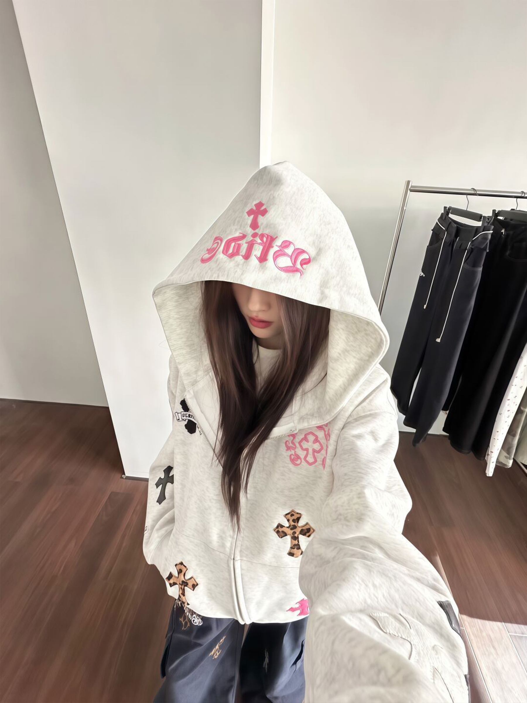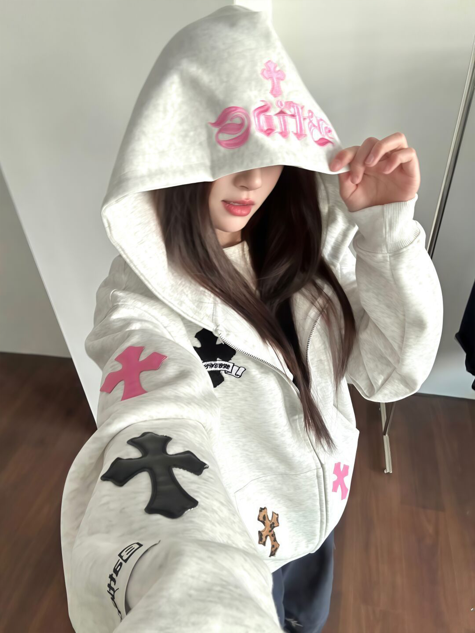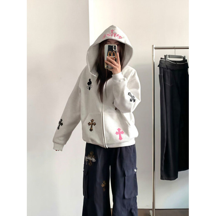 2025新款早秋開衫十字架貼布字母刺綉衛衣女秋冬寬松純棉重磅外套