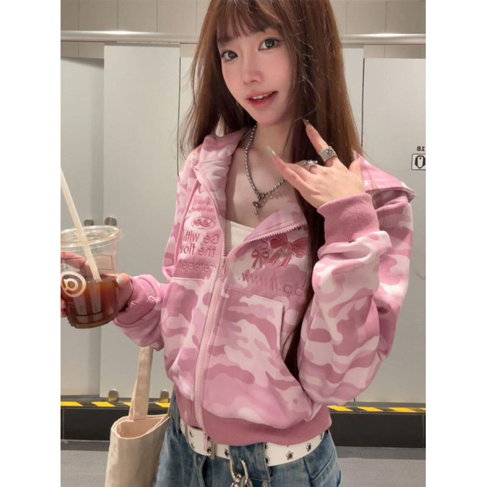 美式復古蝴蝶刺綉迷彩開衫連帽衛衣女春秋寬松顯瘦小個子短款外套