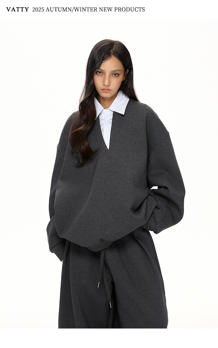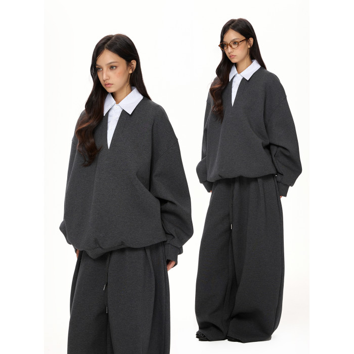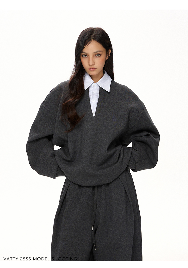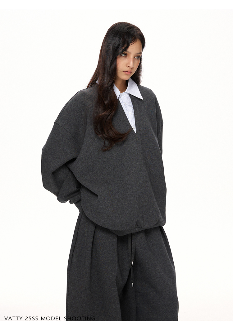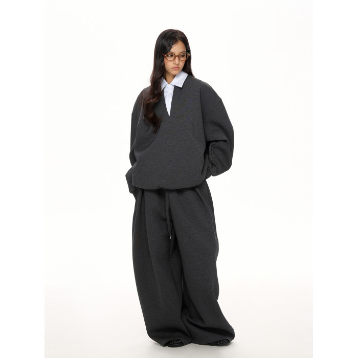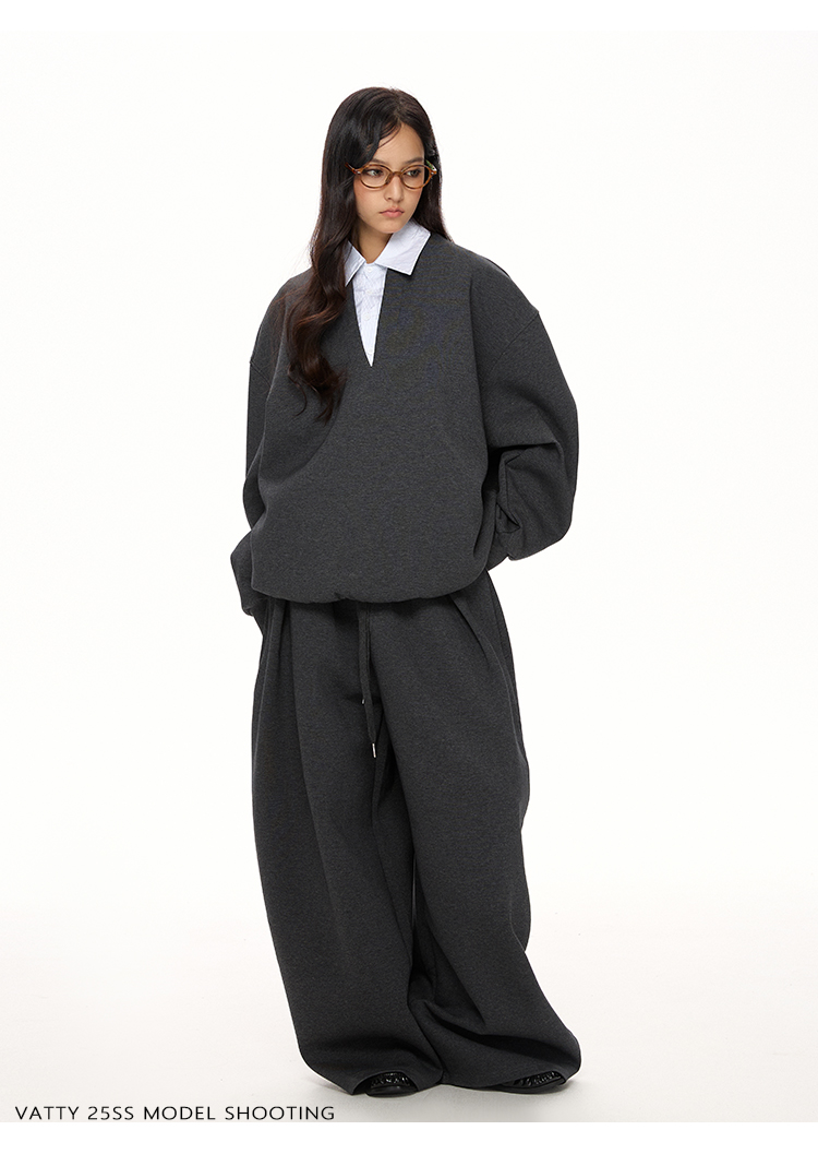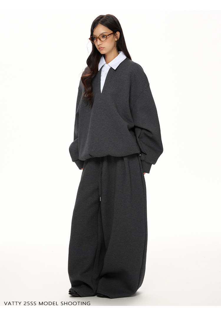VATTY高級感休閒套裝 假兩件空氣棉老錢風廓形衛衣壓褶垂感濶腿褲