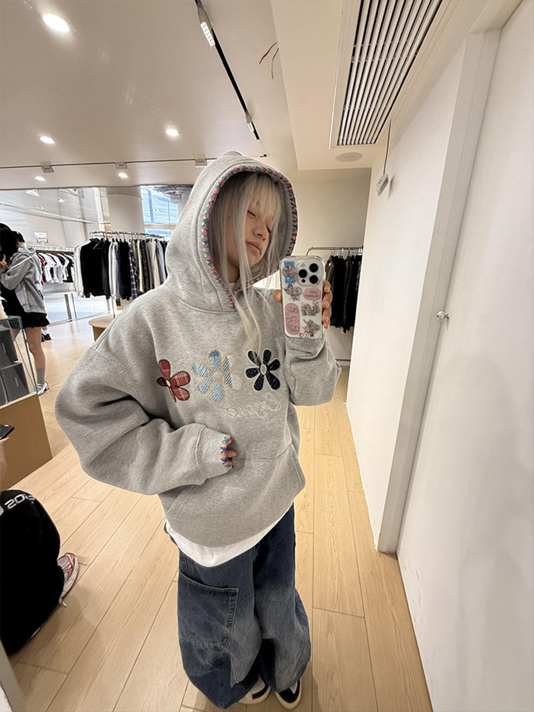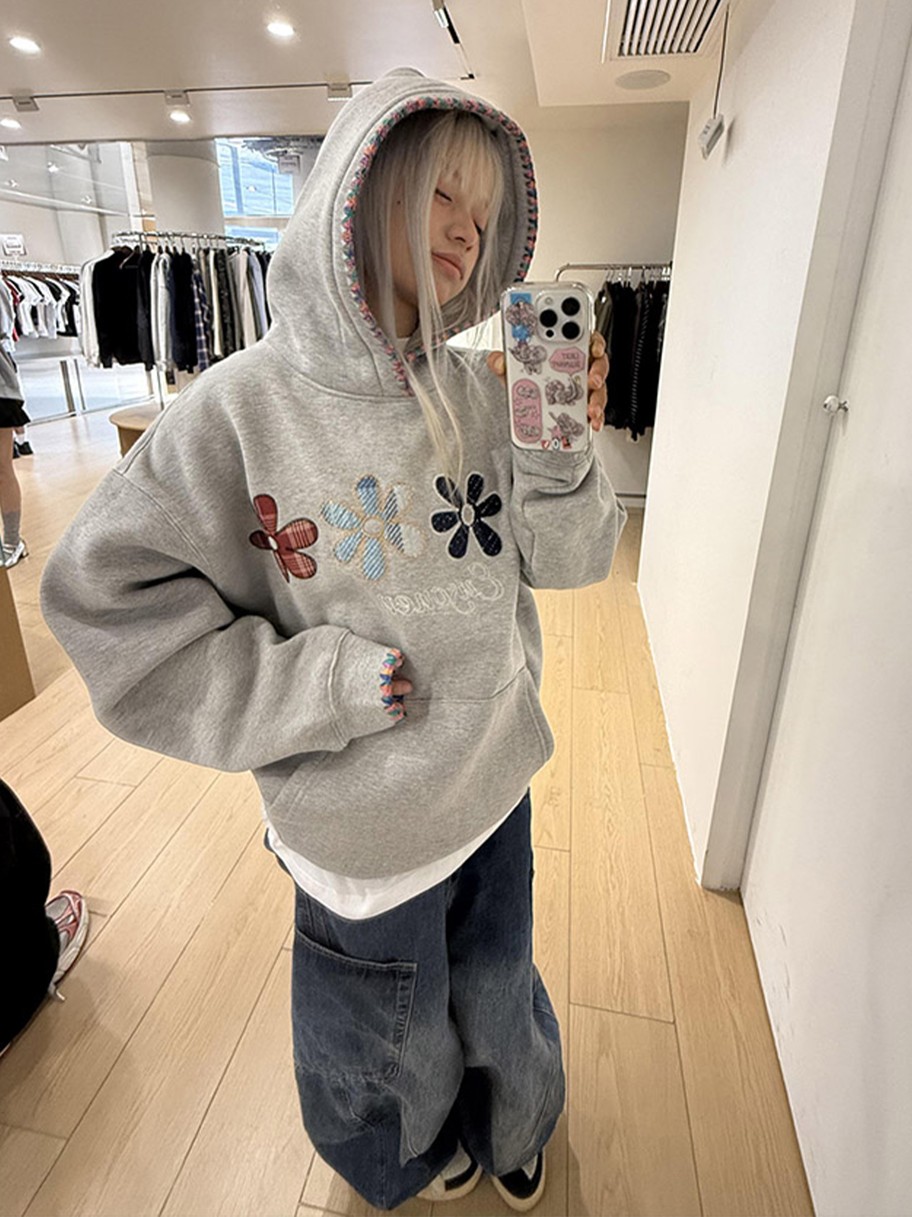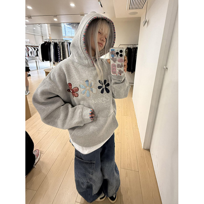 美式高街織帶帽衫刺綉花朵衛衣女秋冬加絨重磅灰色情侶裝連帽外套