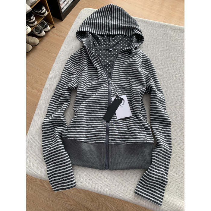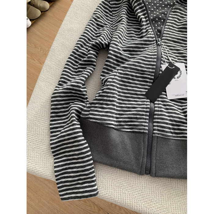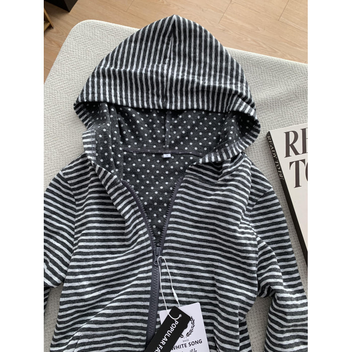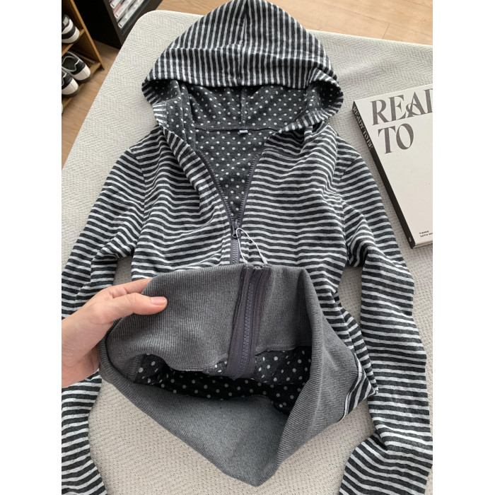 美式復古灰色條紋波點連帽拉鍊衛衣外套女秋季修身短款開衫上衣潮