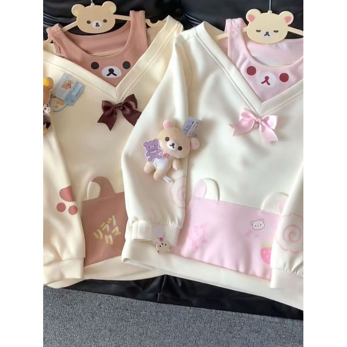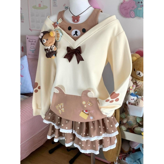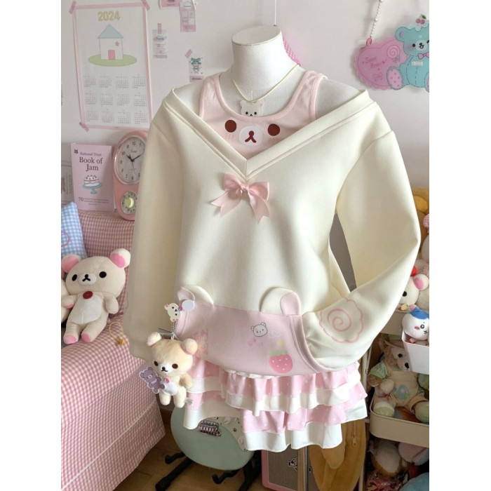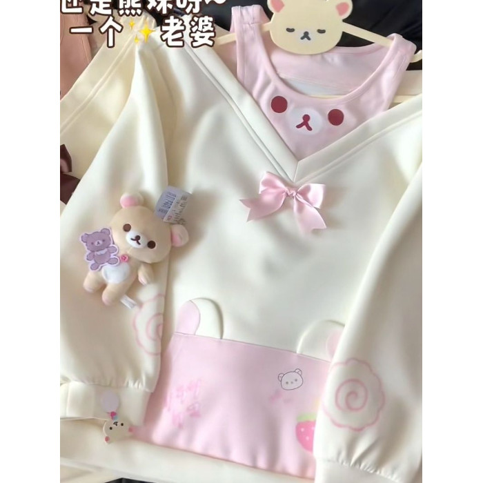 日系甜美可愛二次元軟萌宅系輕松熊假兩件長袖衛衣露肩寬松上衣女
