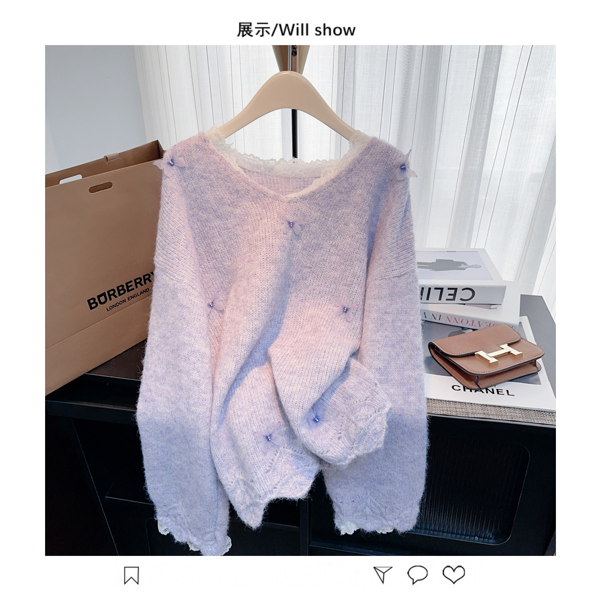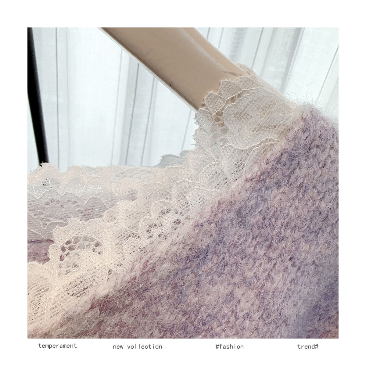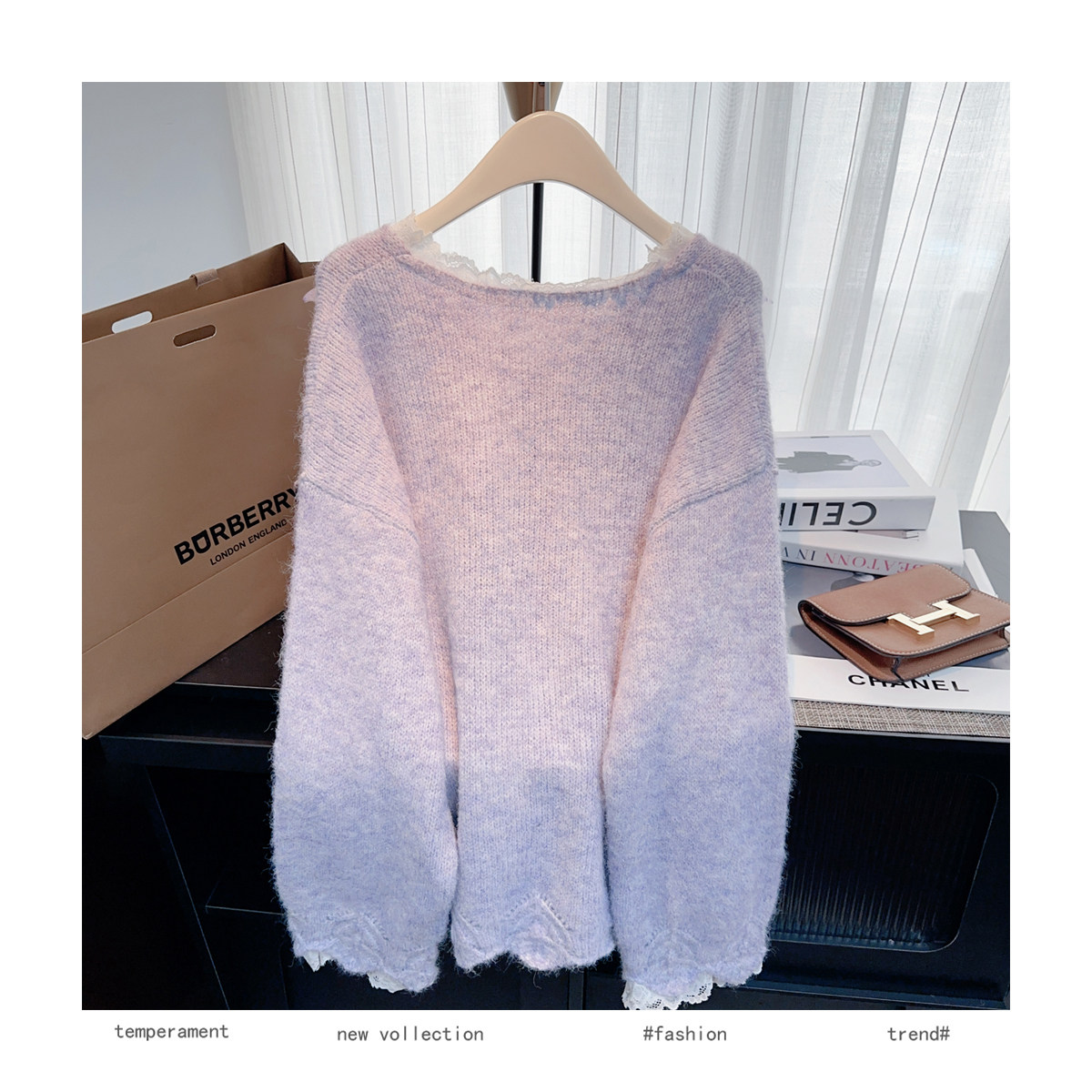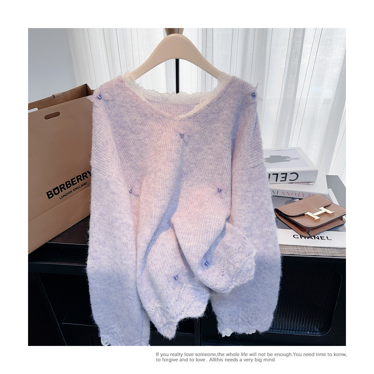 紫色蕾絲V領毛衣女秋冬內搭多巴胺打底衫可外穿純欲慵嬾大朗上衣