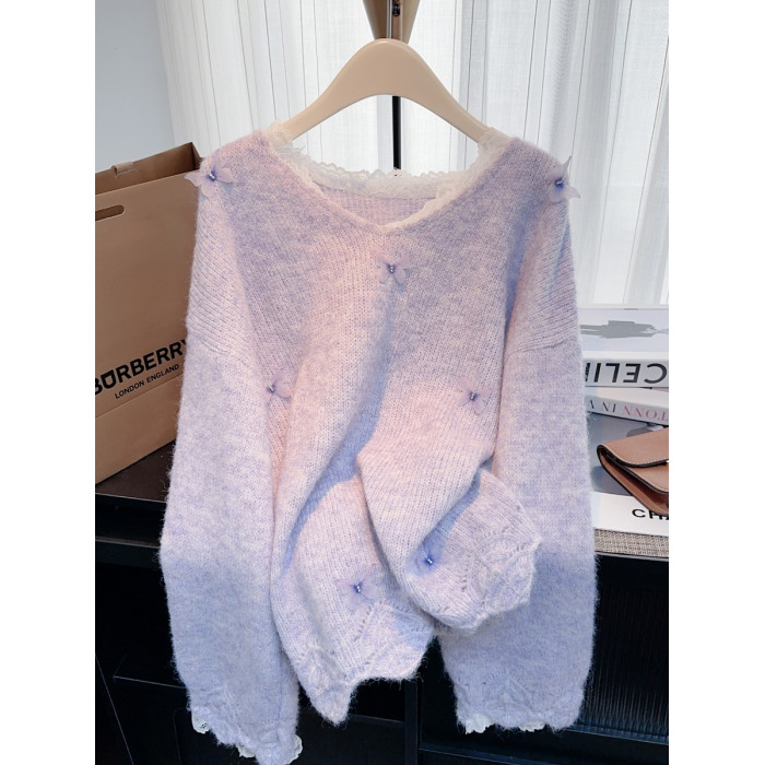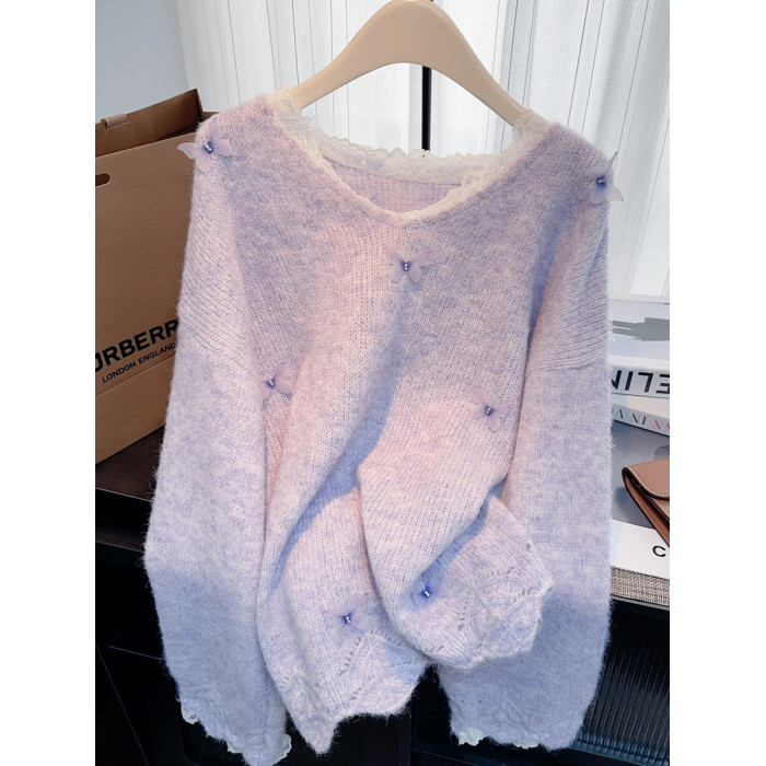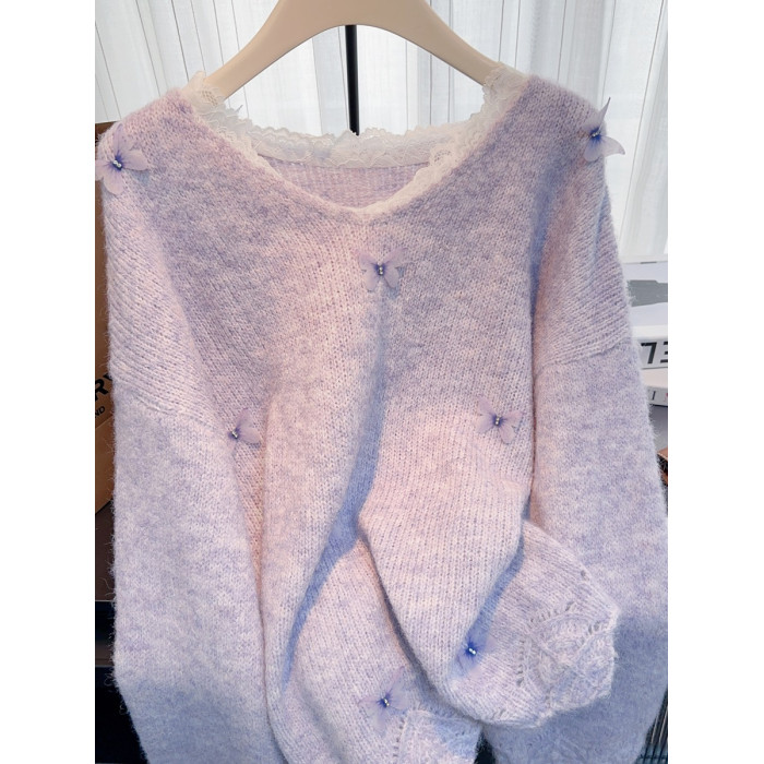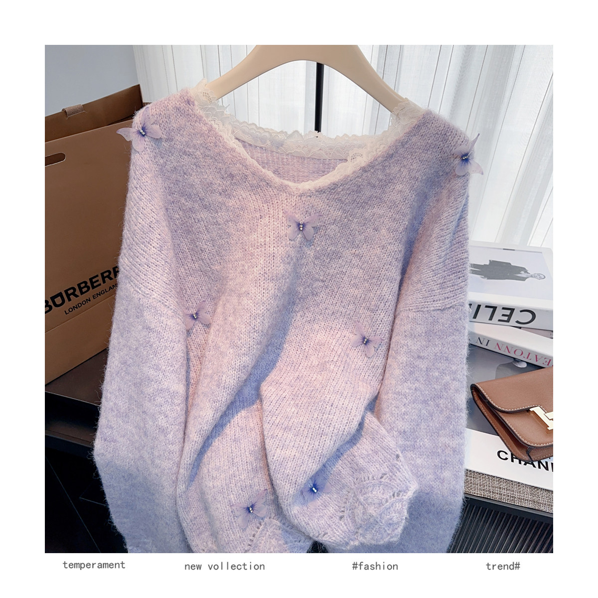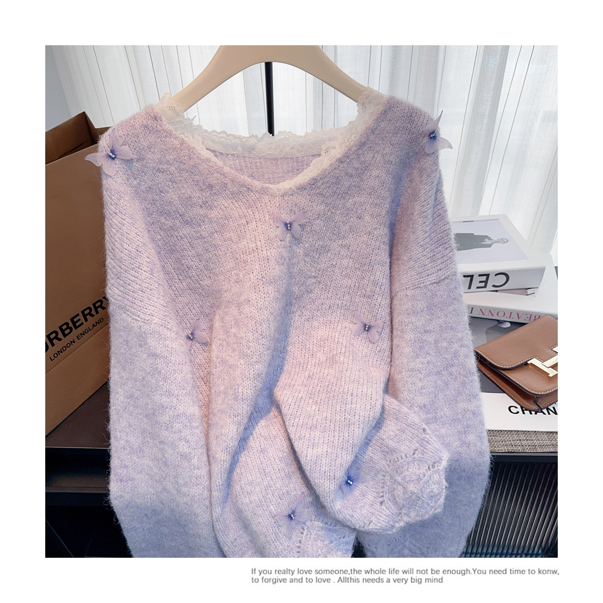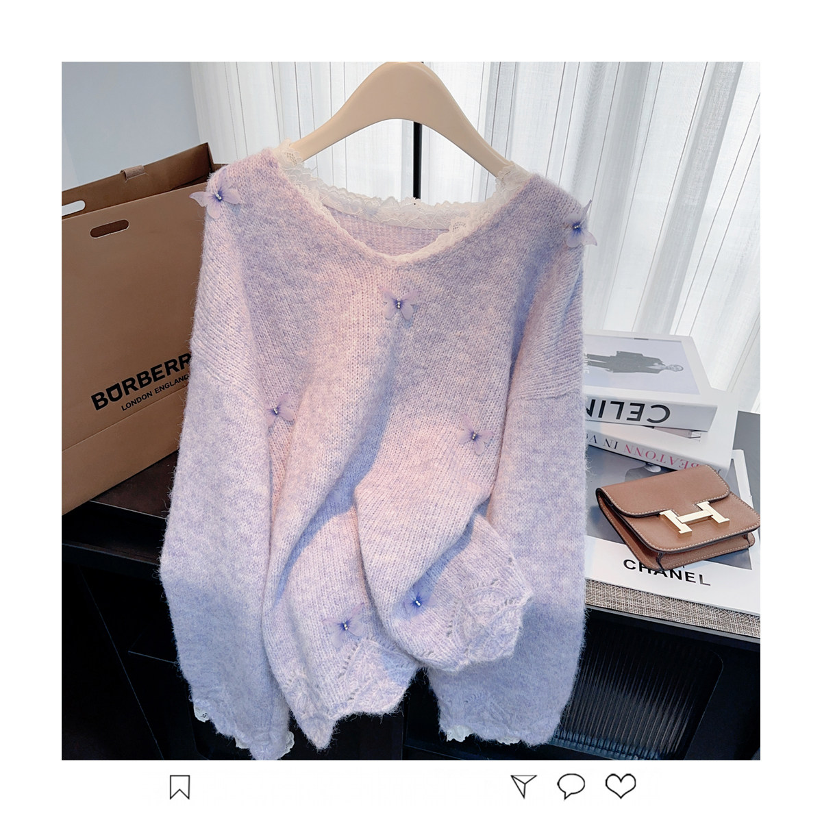 紫色蕾絲V領毛衣女秋冬內搭多巴胺打底衫可外穿純欲慵嬾大朗上衣