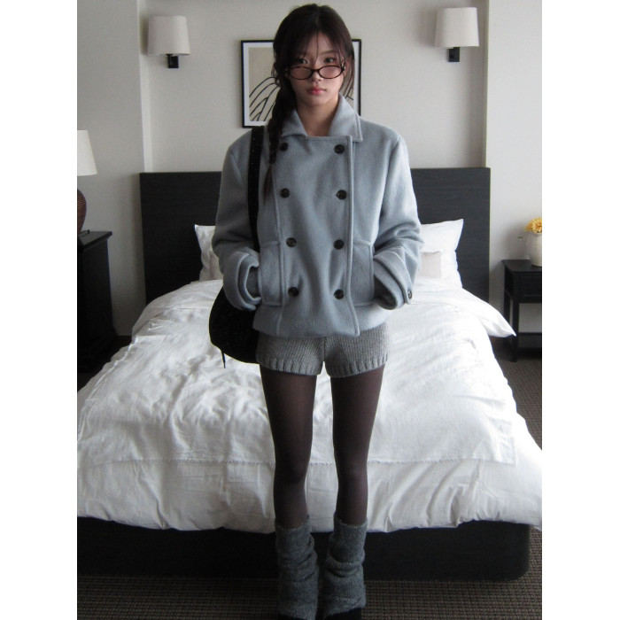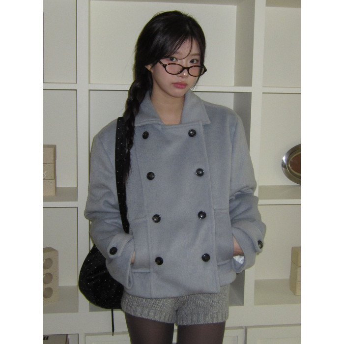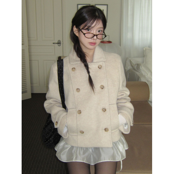 韓國復古學院風日系少女翻領雙排釦夾棉短款羊毛呢外套大衣