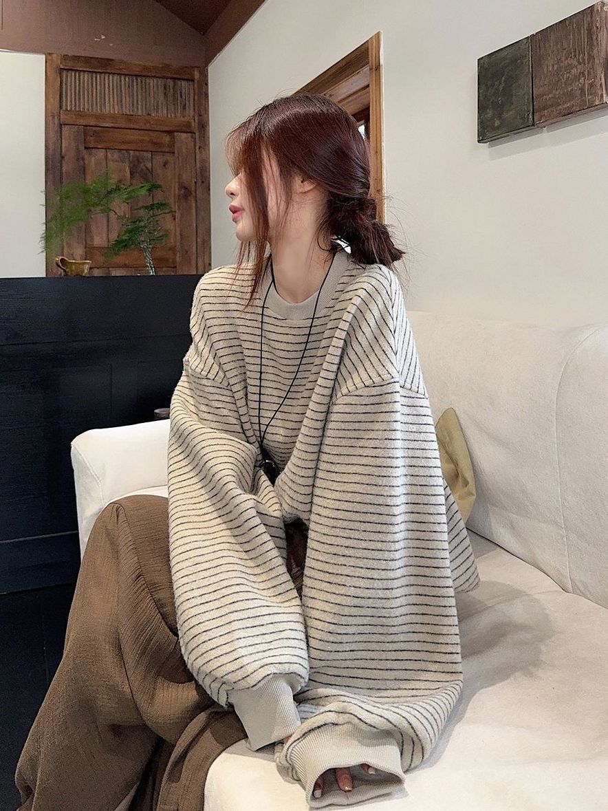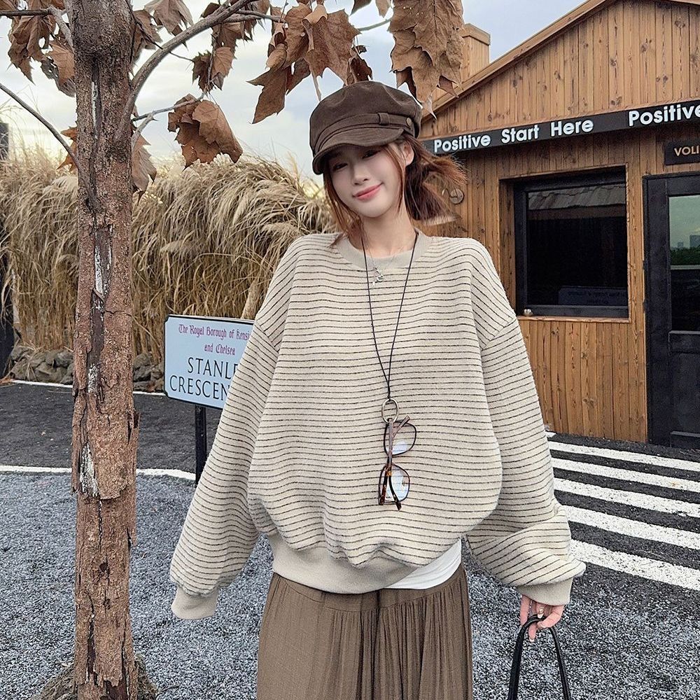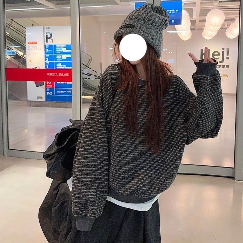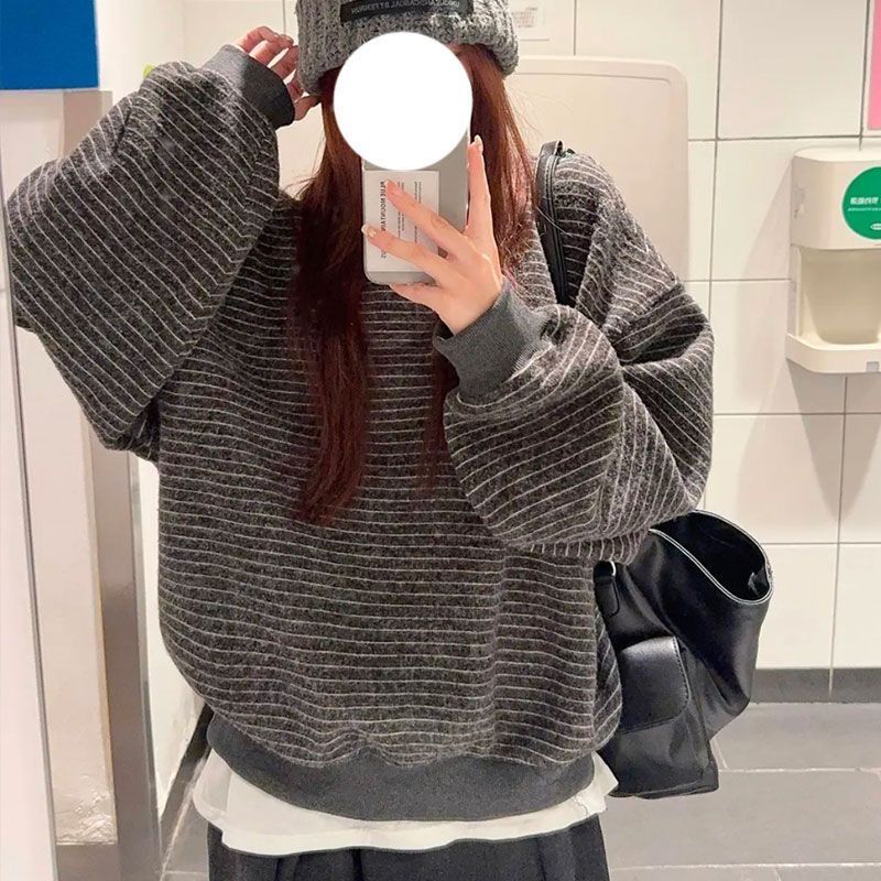 韓系條紋長袖圓領衛衣女2025新款春秋冬寬松慵懶風oversize上衣潮