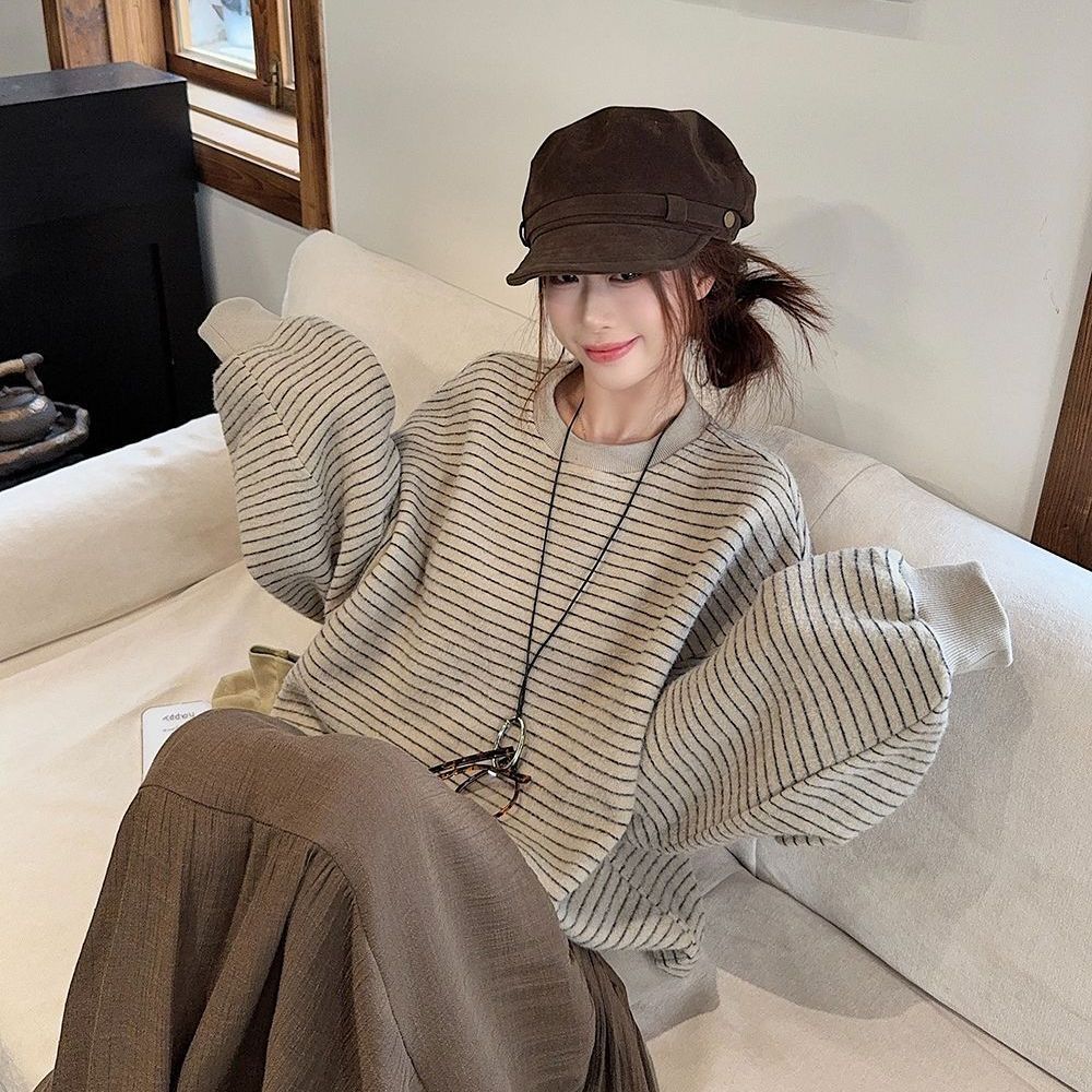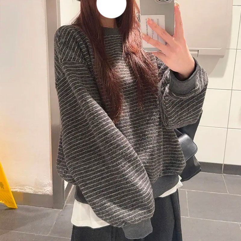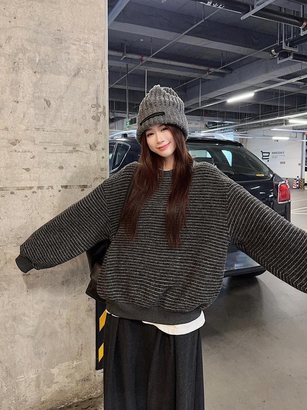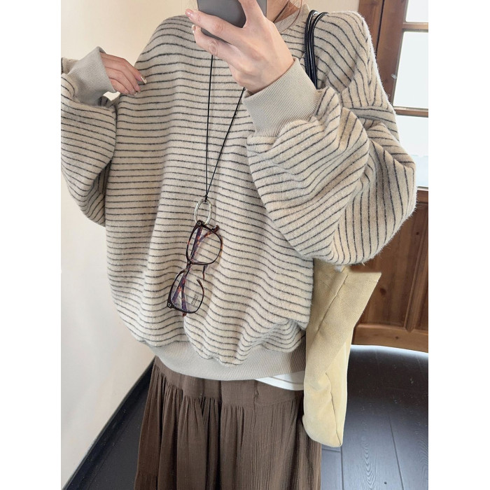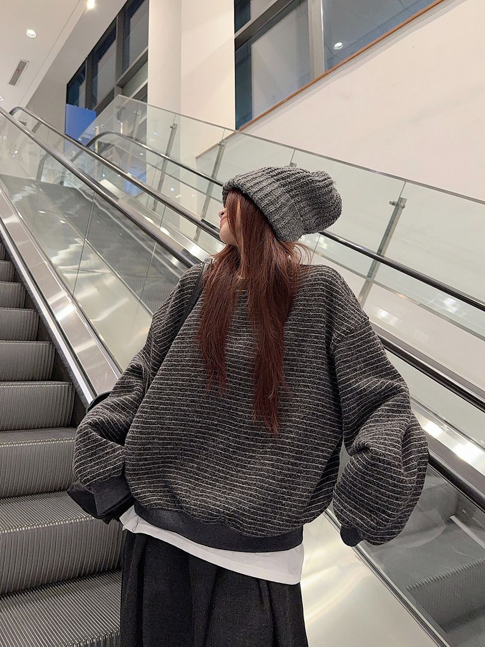 韓系條紋長袖圓領衛衣女2025新款春秋冬寬松慵懶風oversize上衣潮