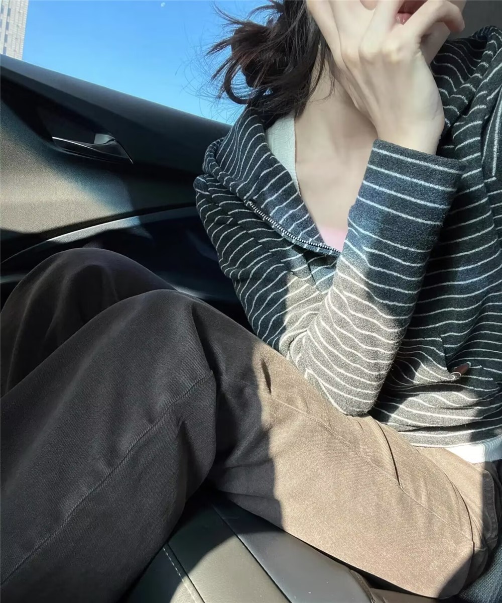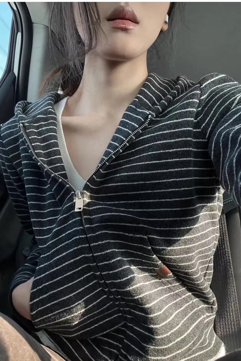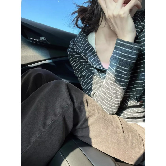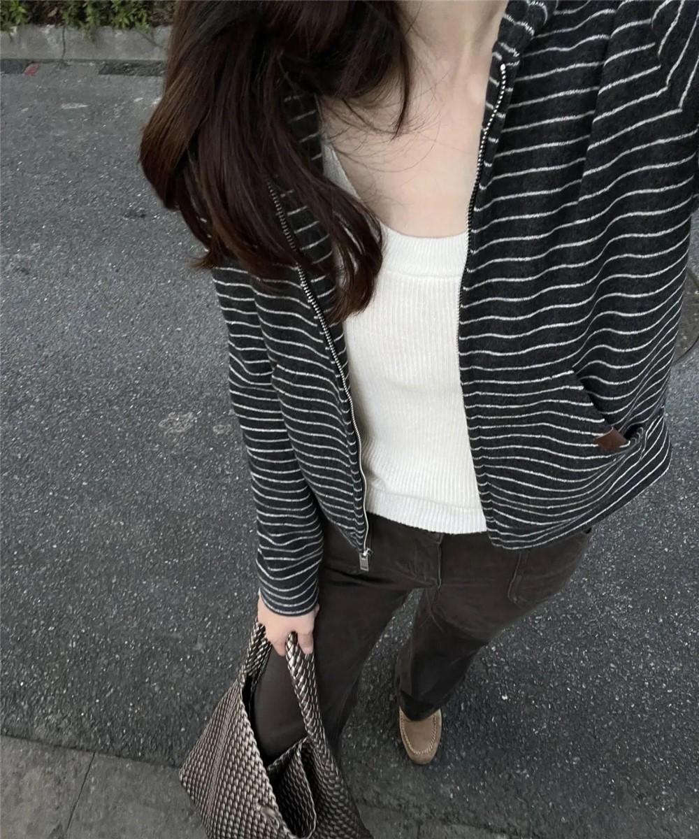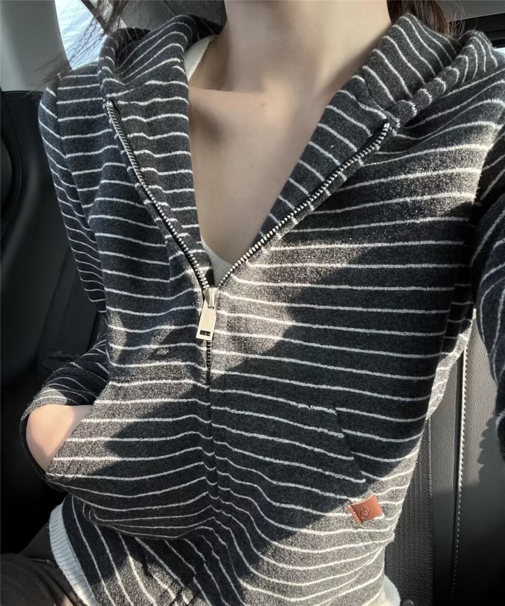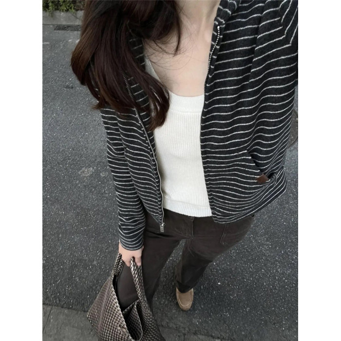 韓系秋冬季灰色連帽條紋開衫毛衣外套女休閒軟糯針織衫上衣衛衣