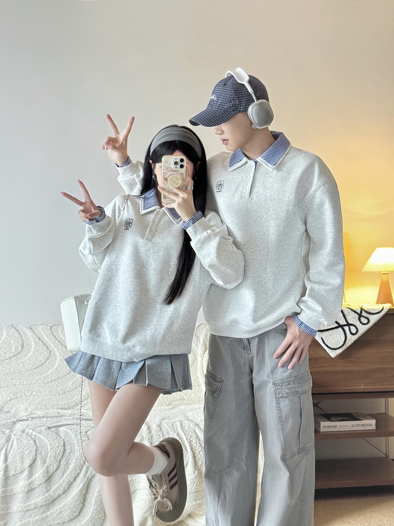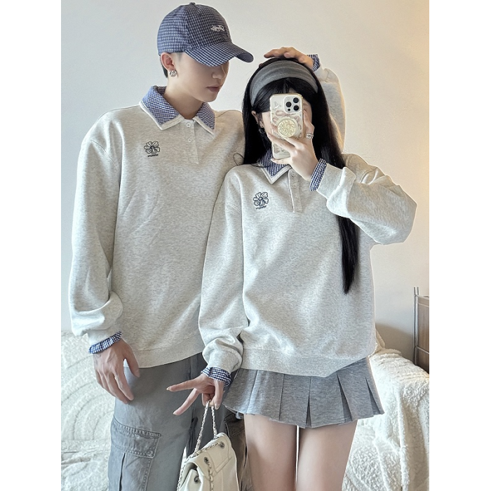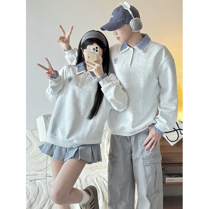 美式刺綉假兩件polo領衛衣女2025春秋新款情侶學院風寬松休閒上衣
