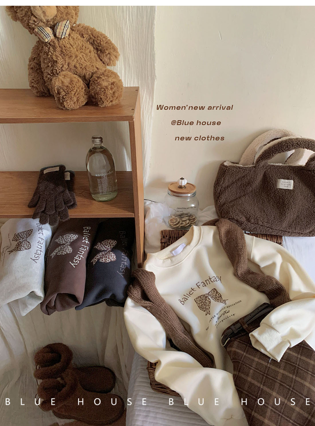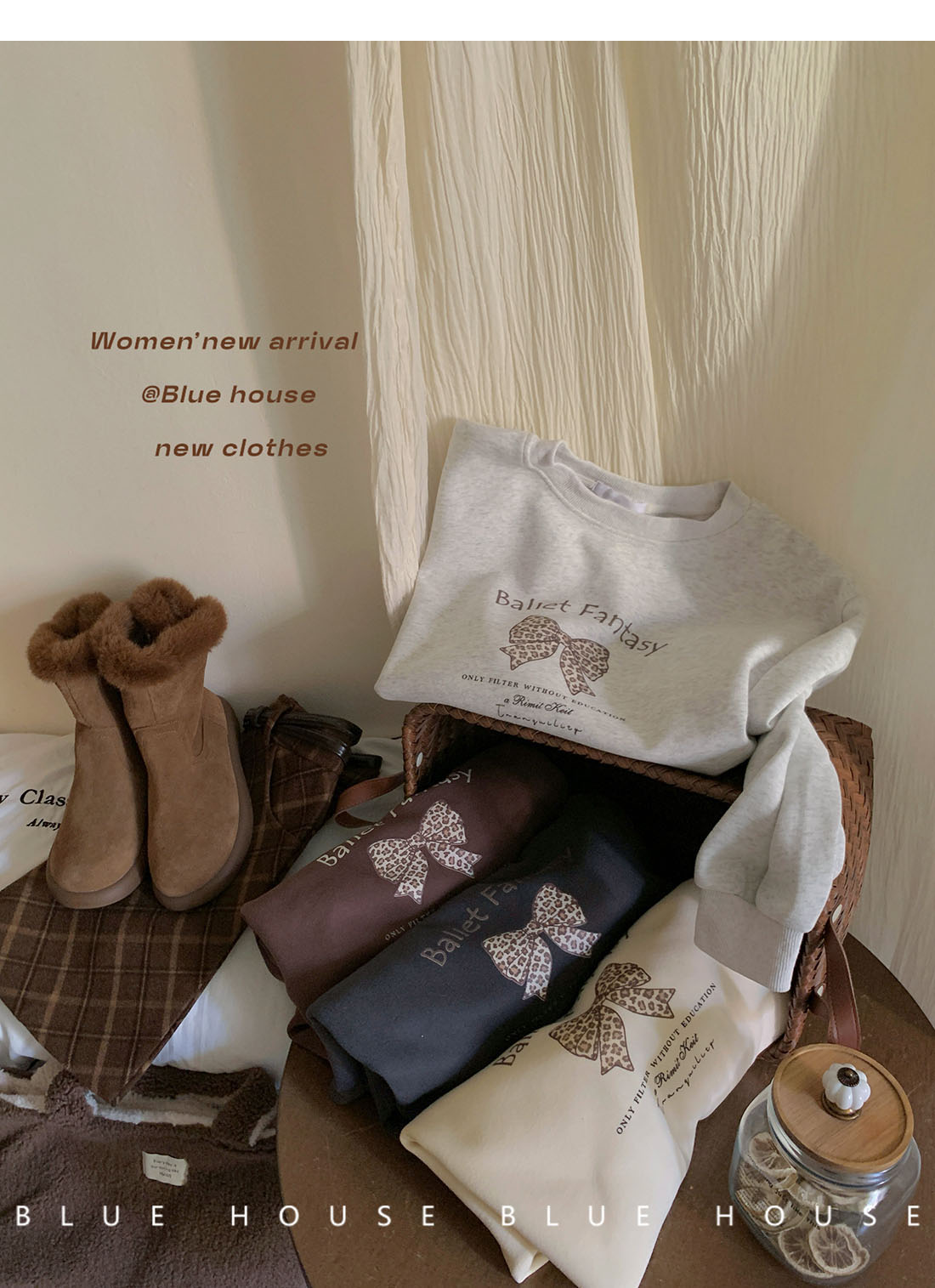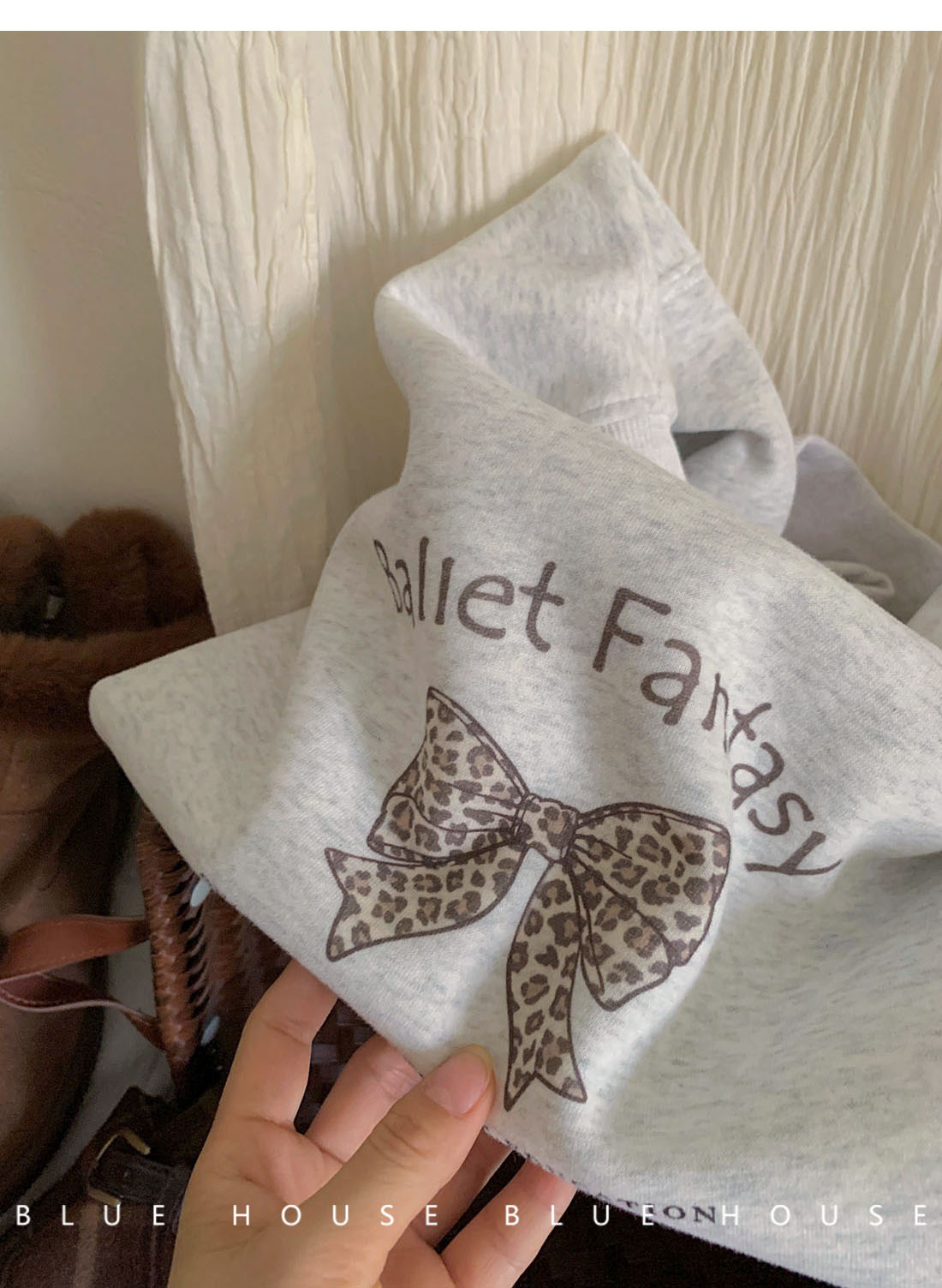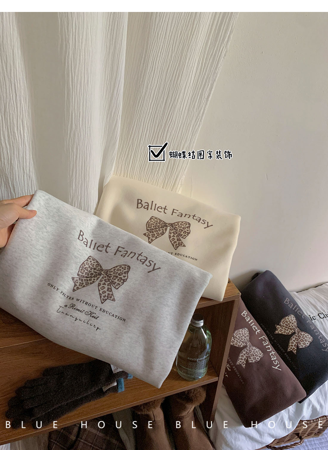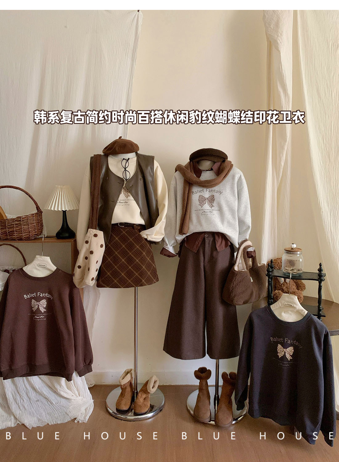 韓版時尚豹紋蝴蝶結圓領長袖衛衣女秋冬寬松休閒百搭減齡套頭上衣