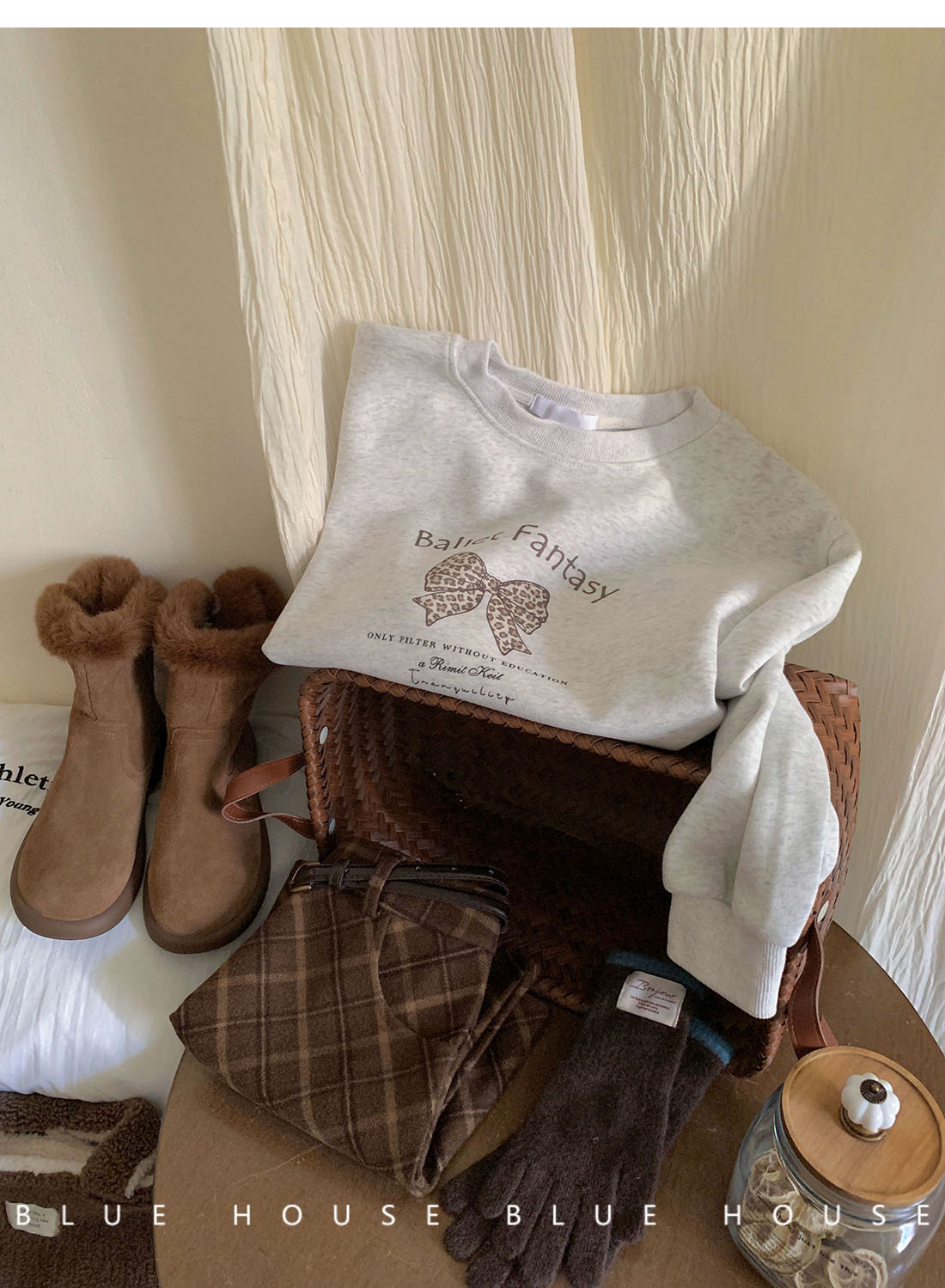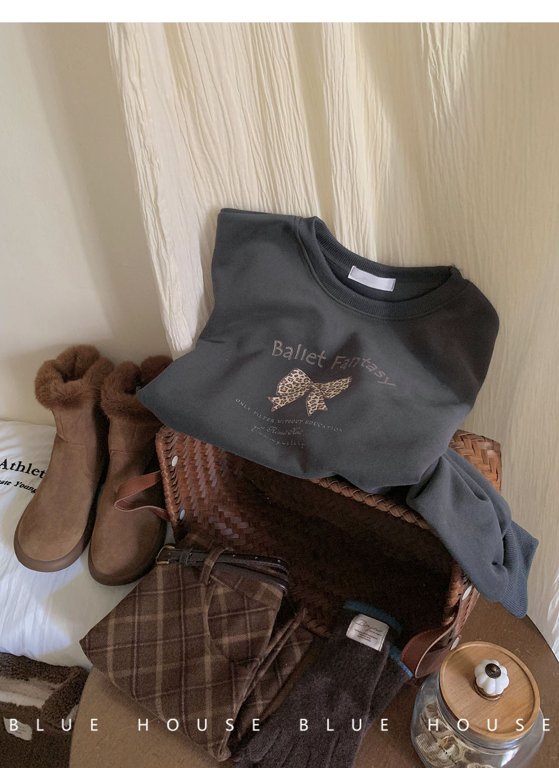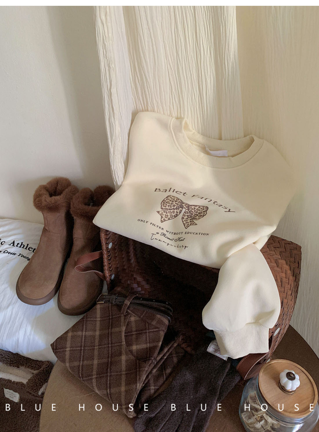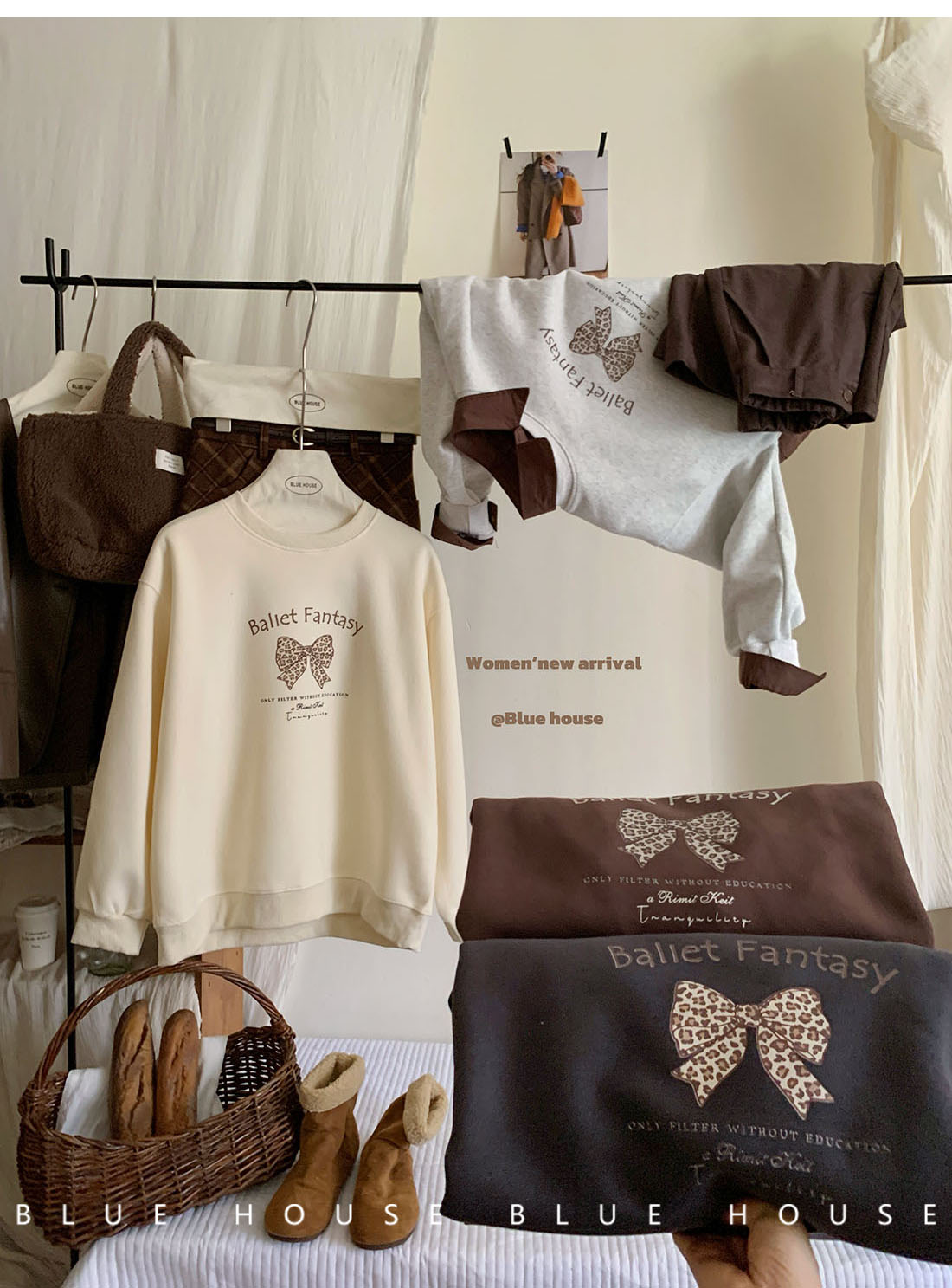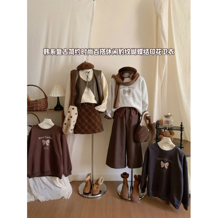韓版時尚豹紋蝴蝶結圓領長袖衛衣女秋冬寬松休閒百搭減齡套頭上衣