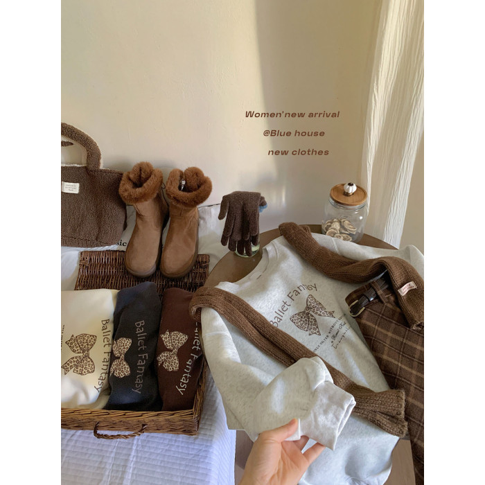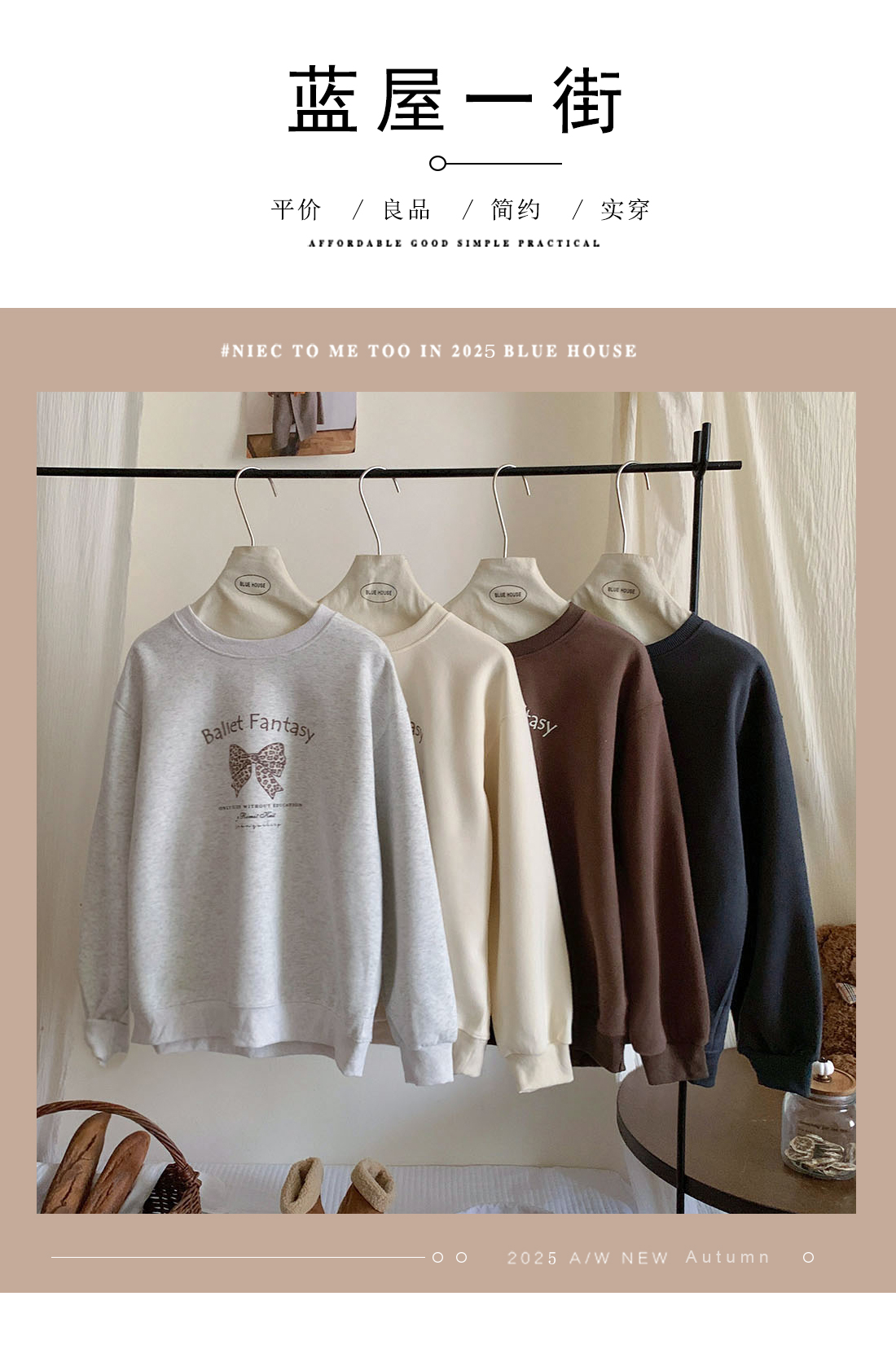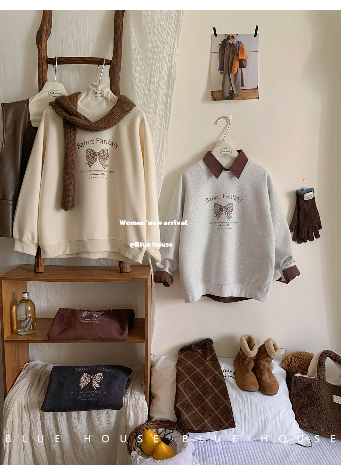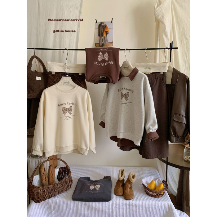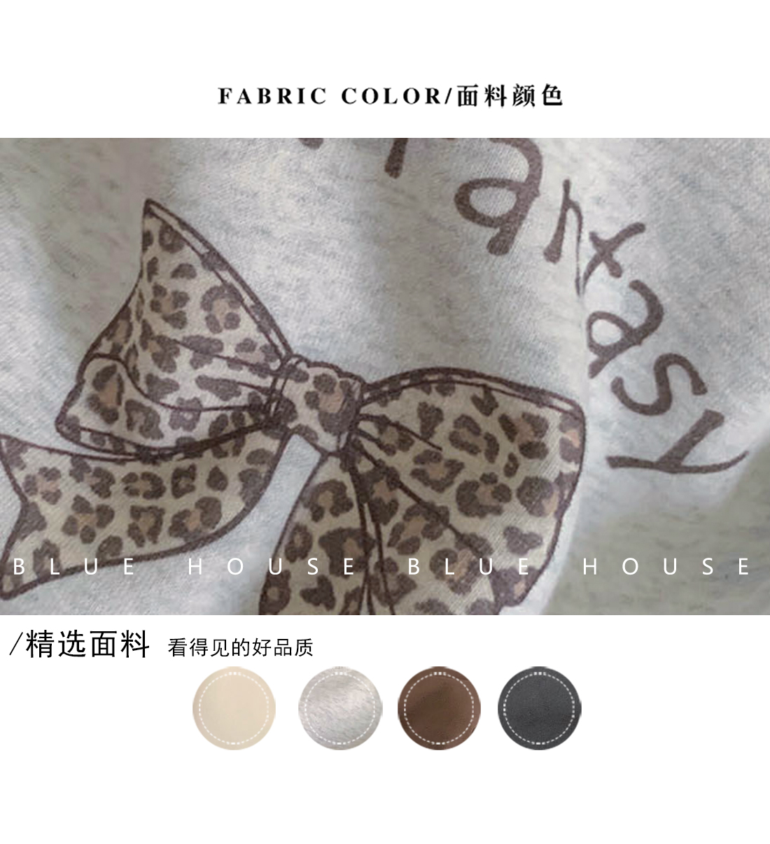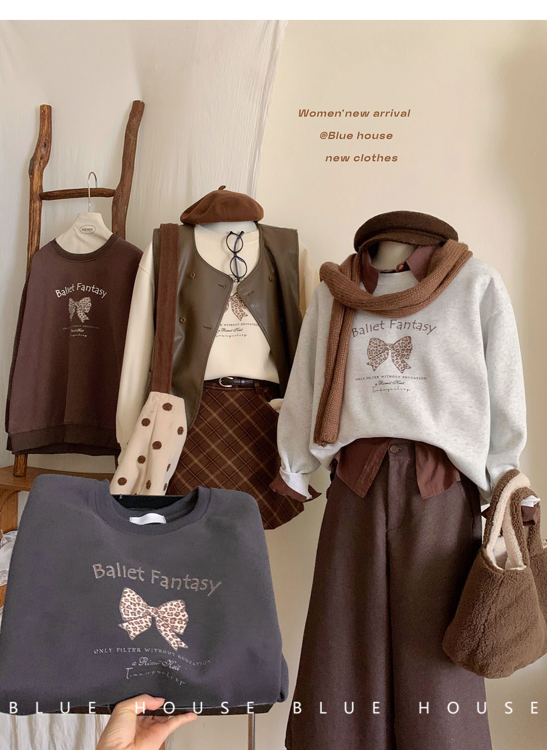韓版時尚豹紋蝴蝶結圓領長袖衛衣女秋冬寬松休閒百搭減齡套頭上衣