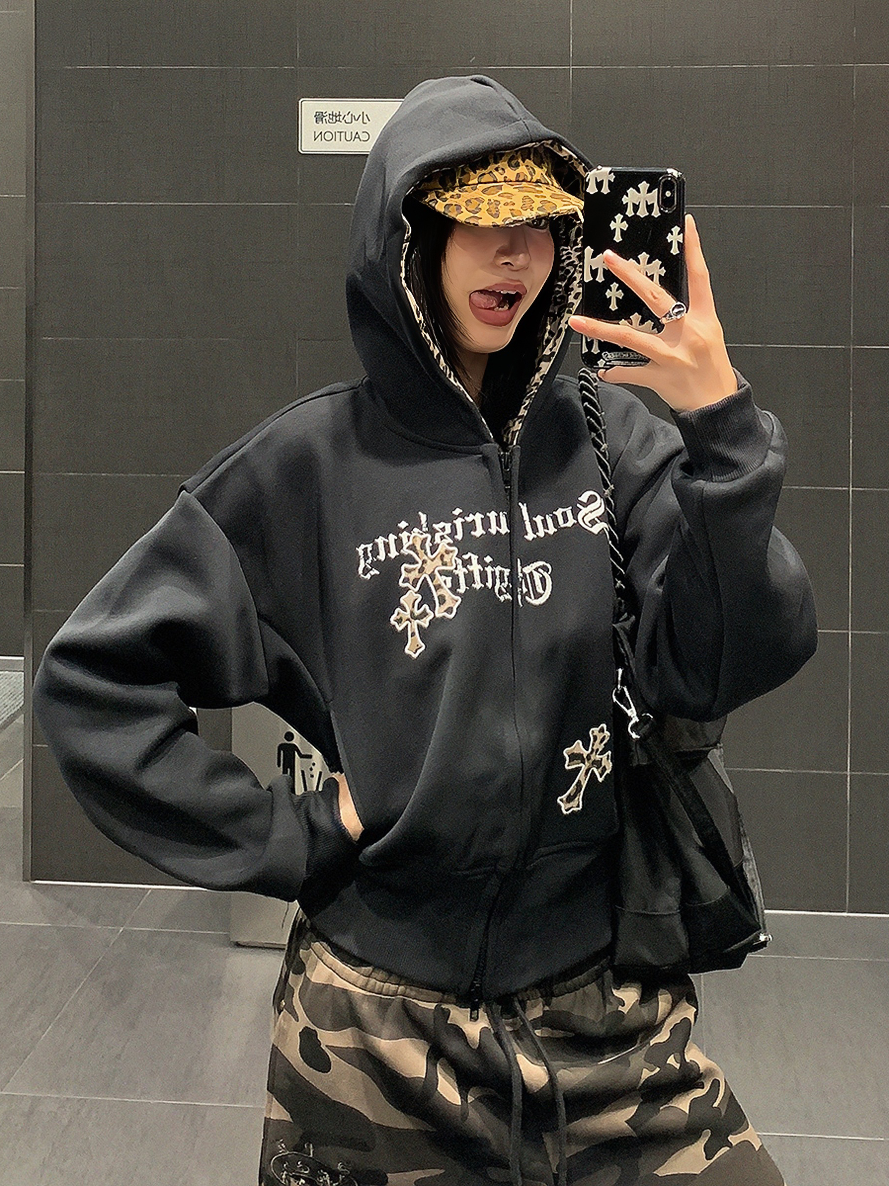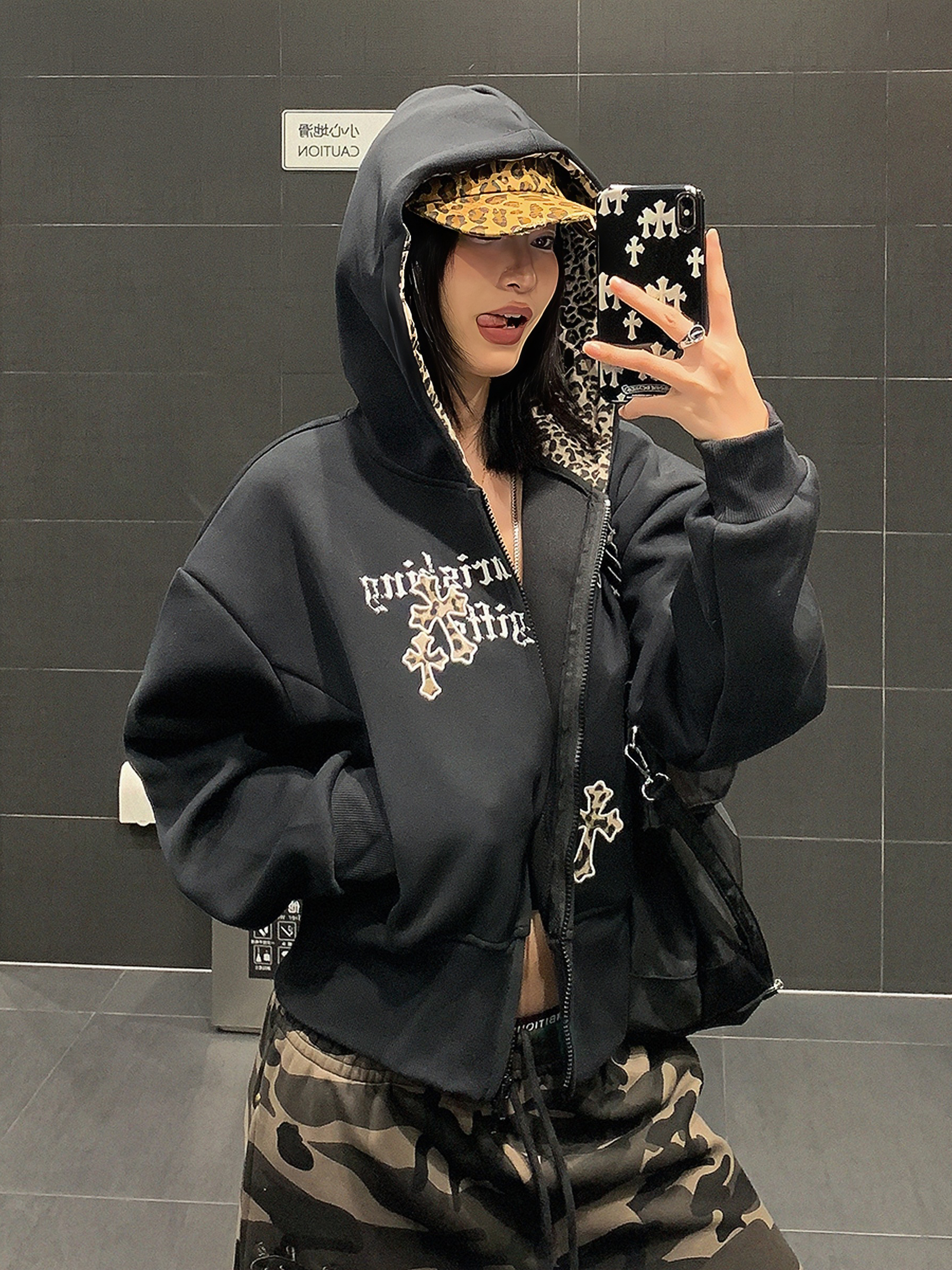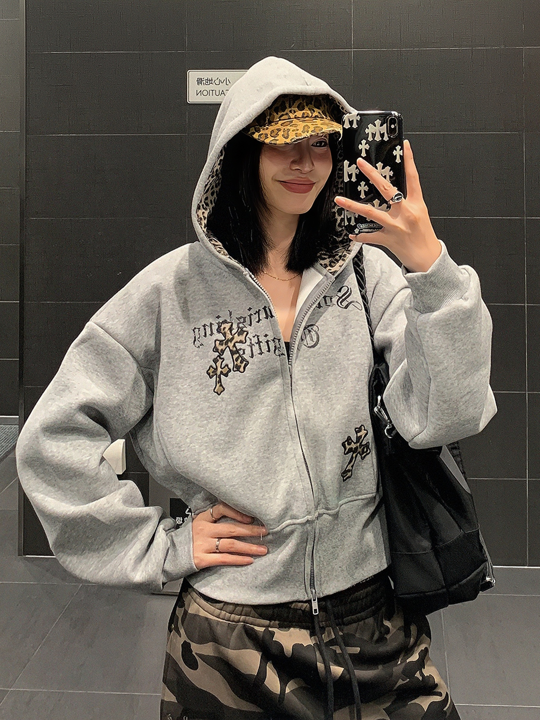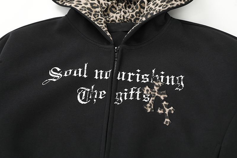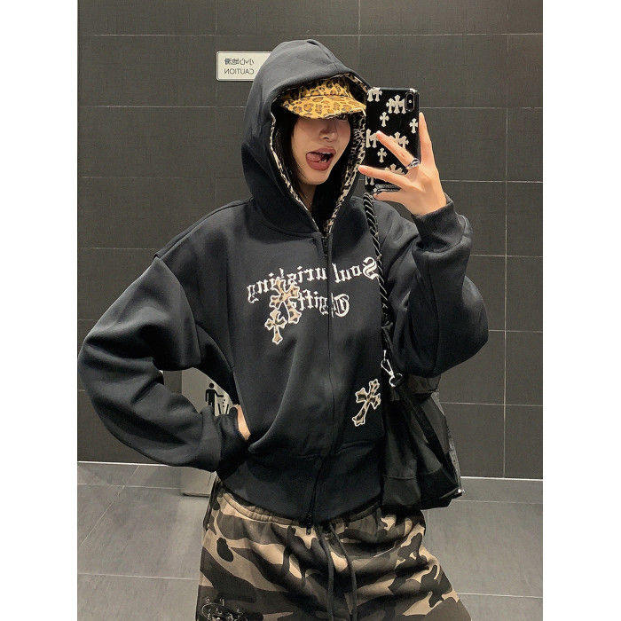 USKM美式復古豹紋十字架連帽衛衣女寬松休閒短款開衫外套帽衫上衣