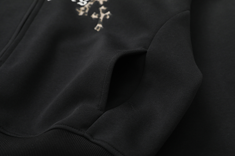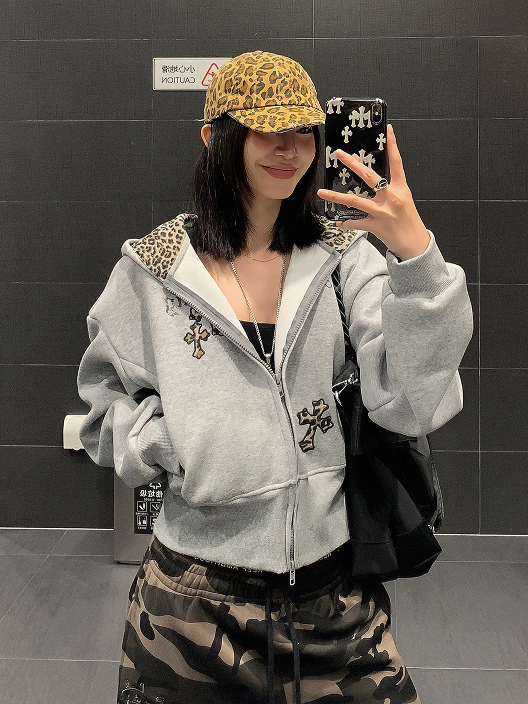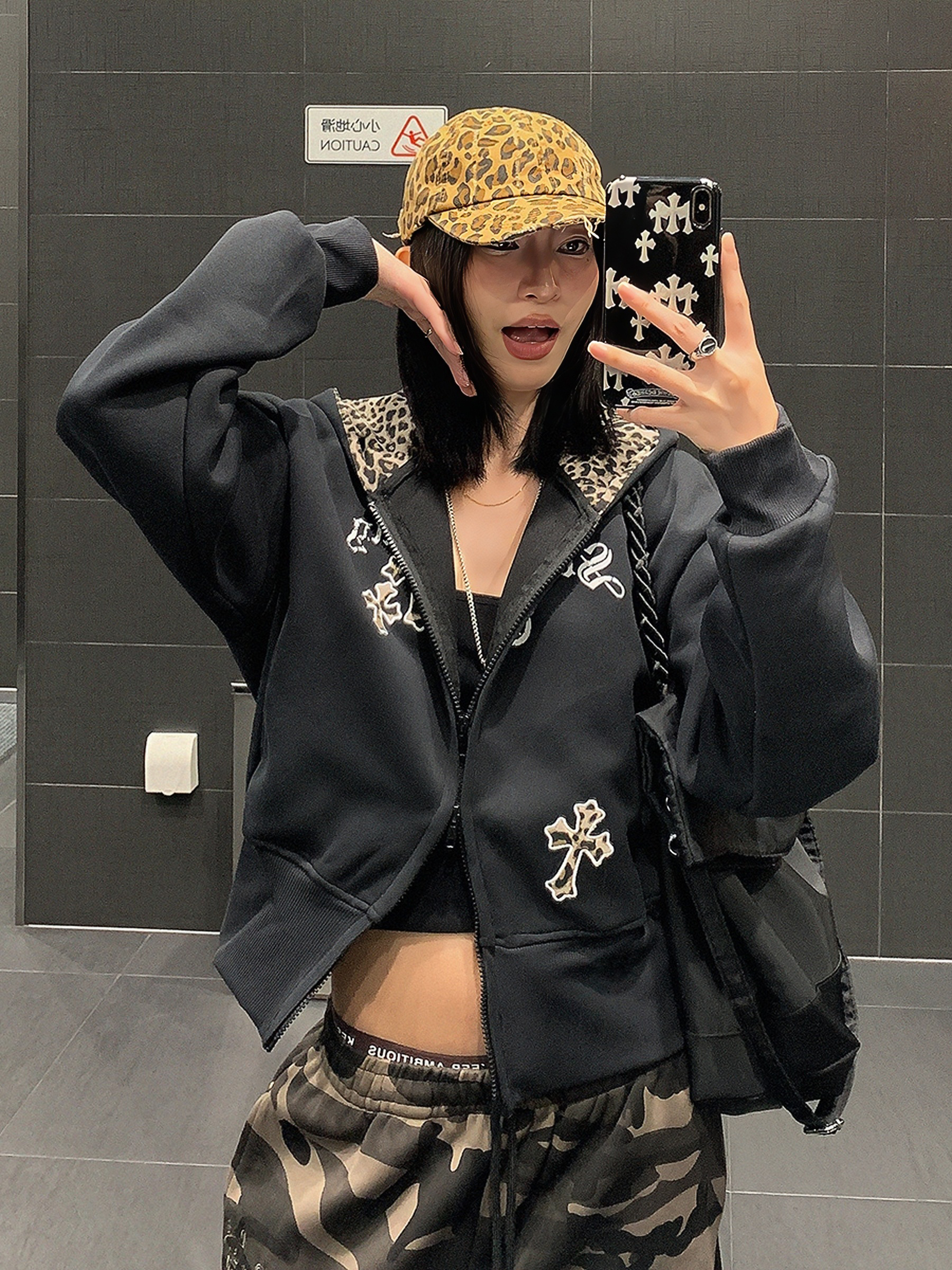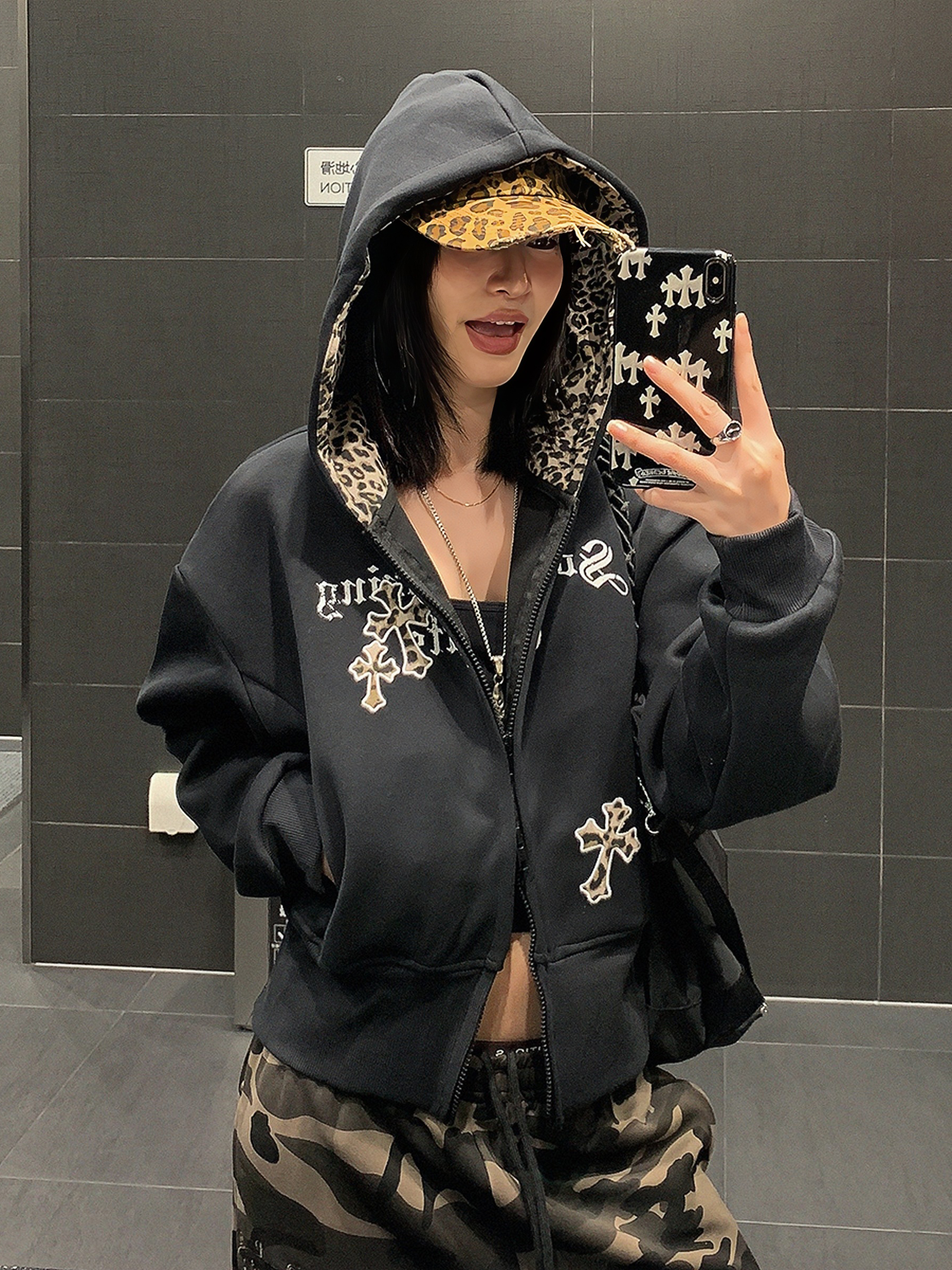 USKM美式復古豹紋十字架連帽衛衣女寬松休閒短款開衫外套帽衫上衣