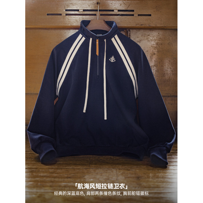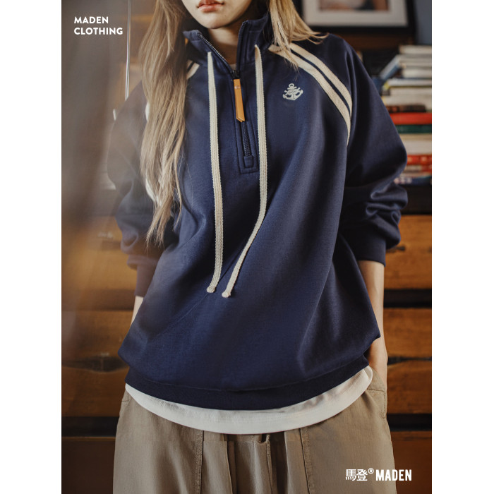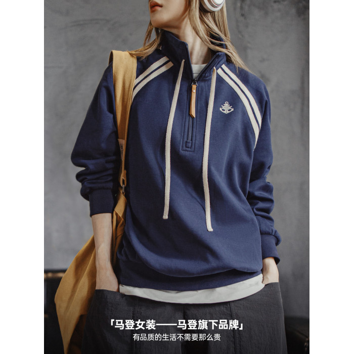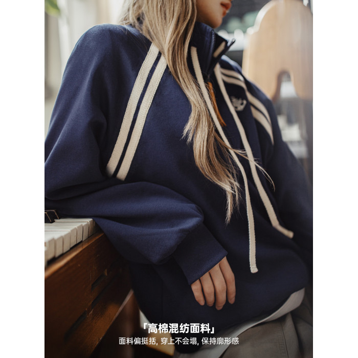 馬登美式復古學院風藏青色半拉鍊翻高立領套頭長袖無帽衛衣女士秋
