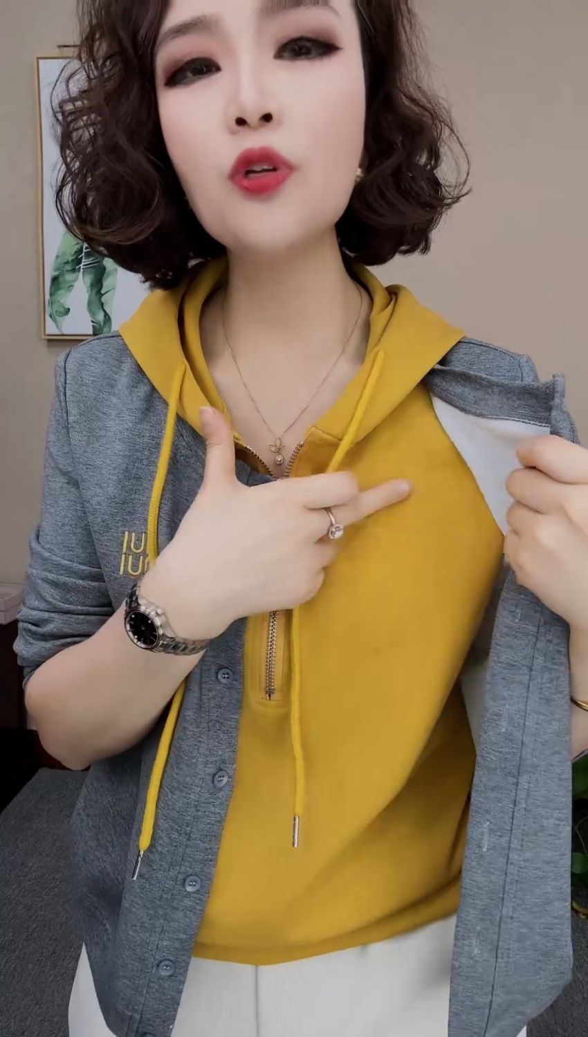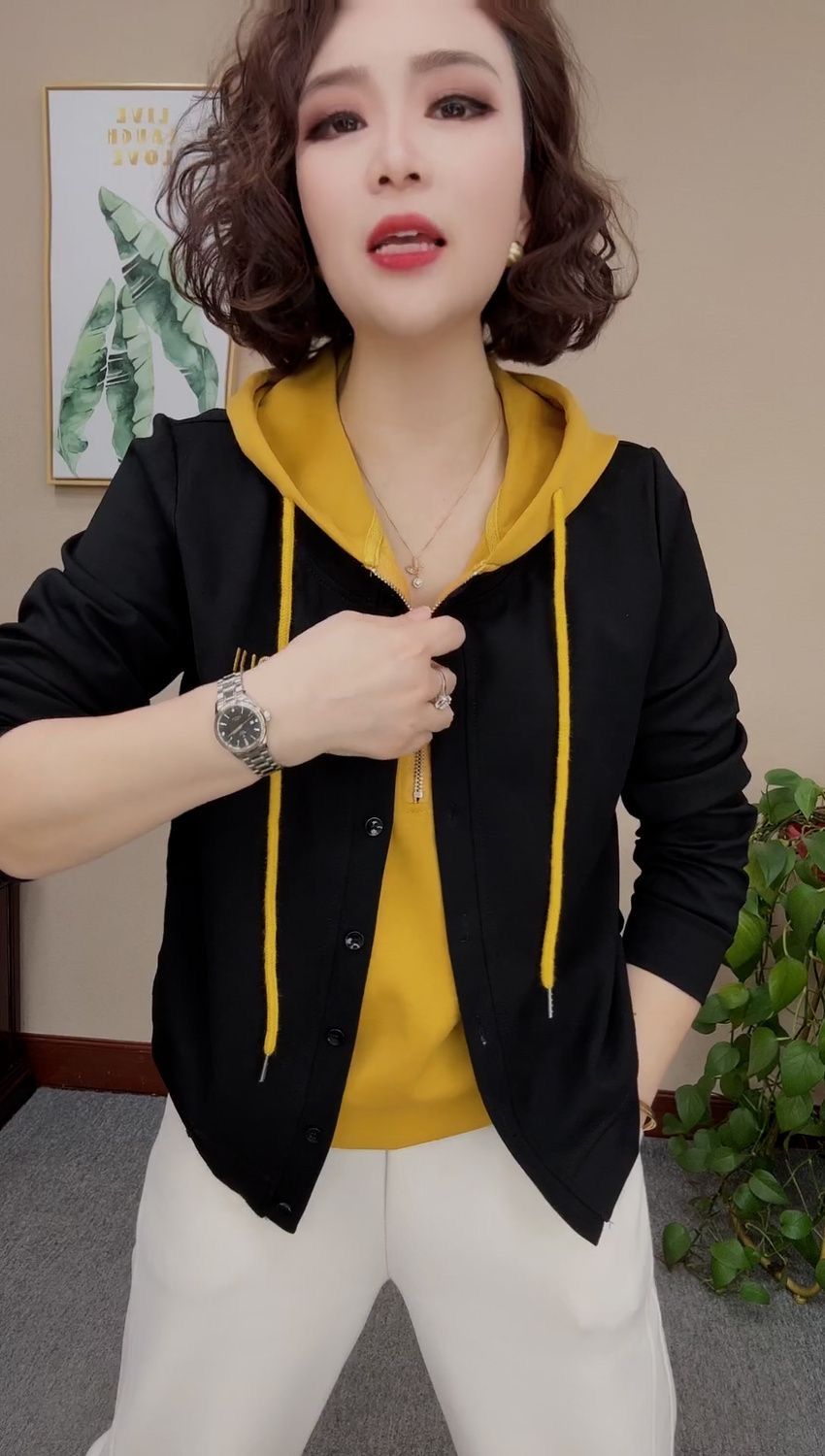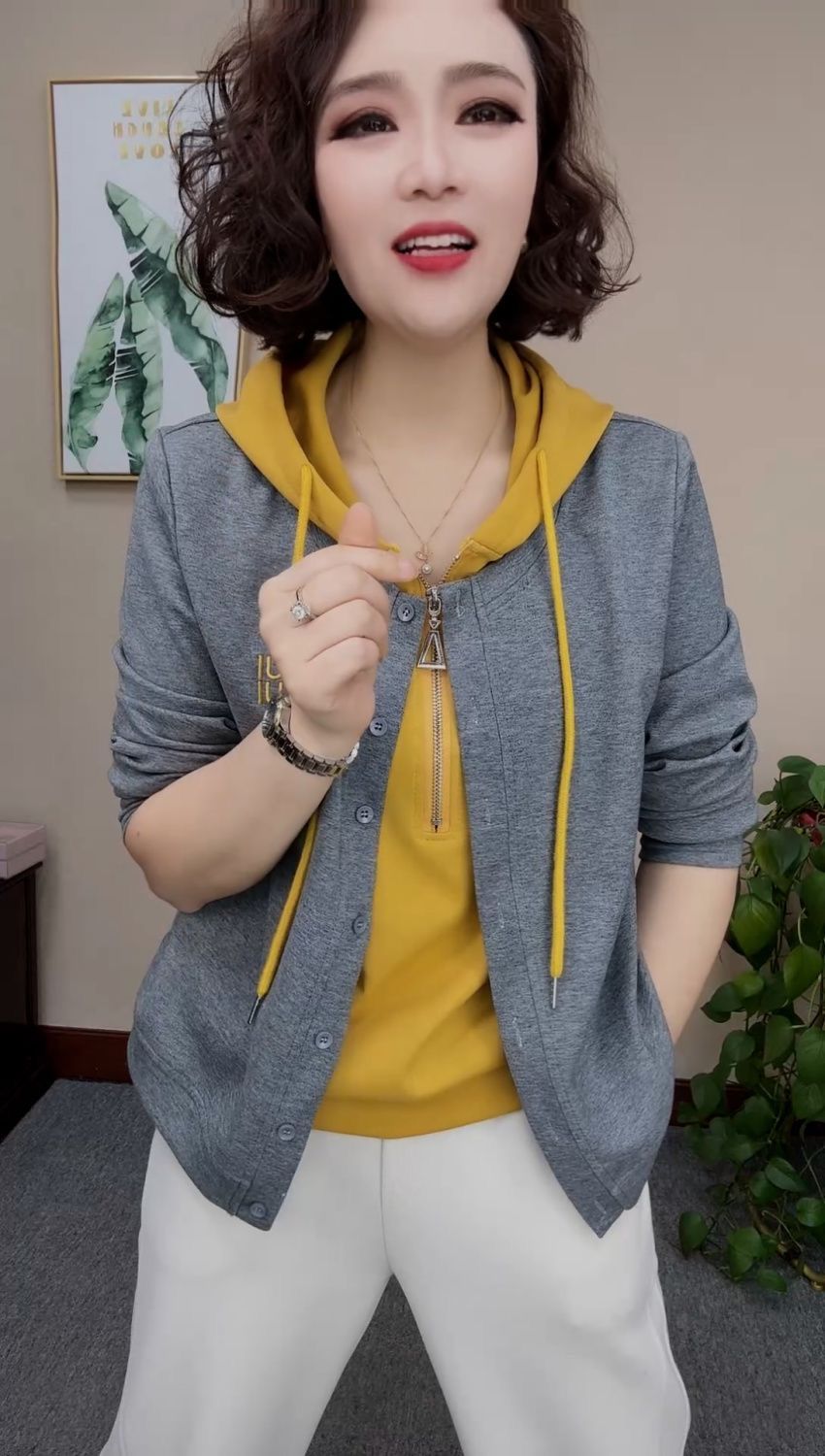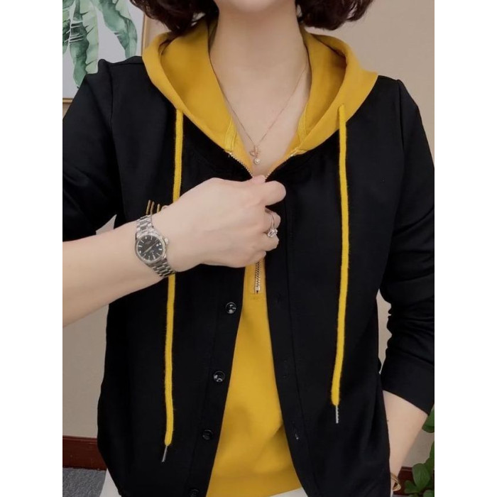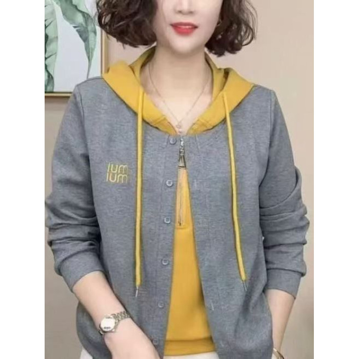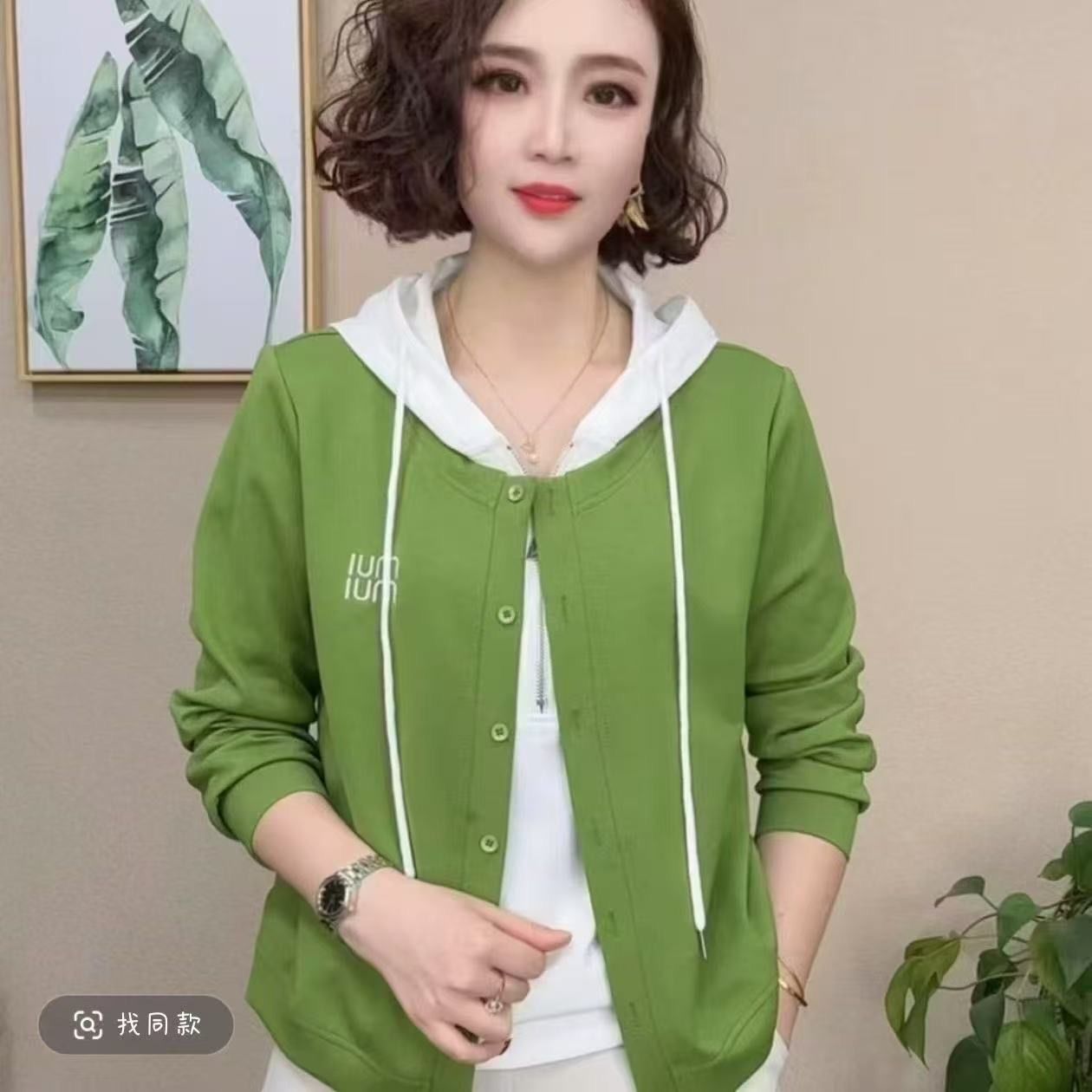 春秋新款時尚連帽假兩件衛衣女百搭遮肚顯瘦寬松休閒減齡長袖上衣