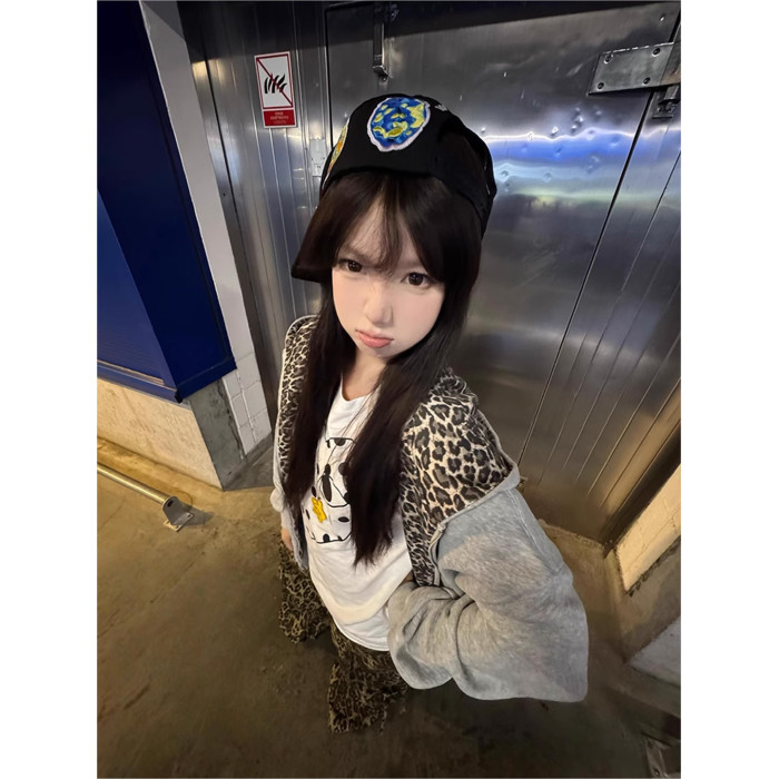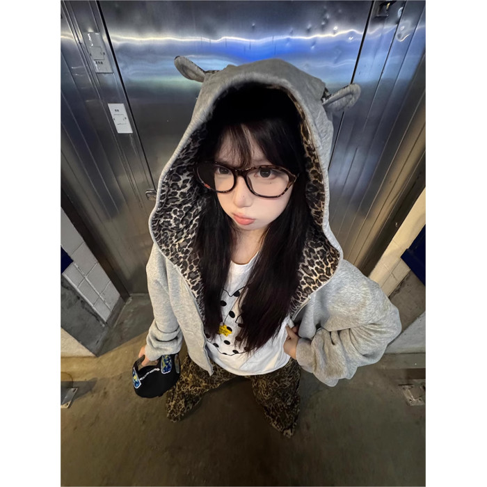 美式國潮豹紋立體耳朵開衫衛衣女春秋季慵懶高街小衆別致拉鍊外套