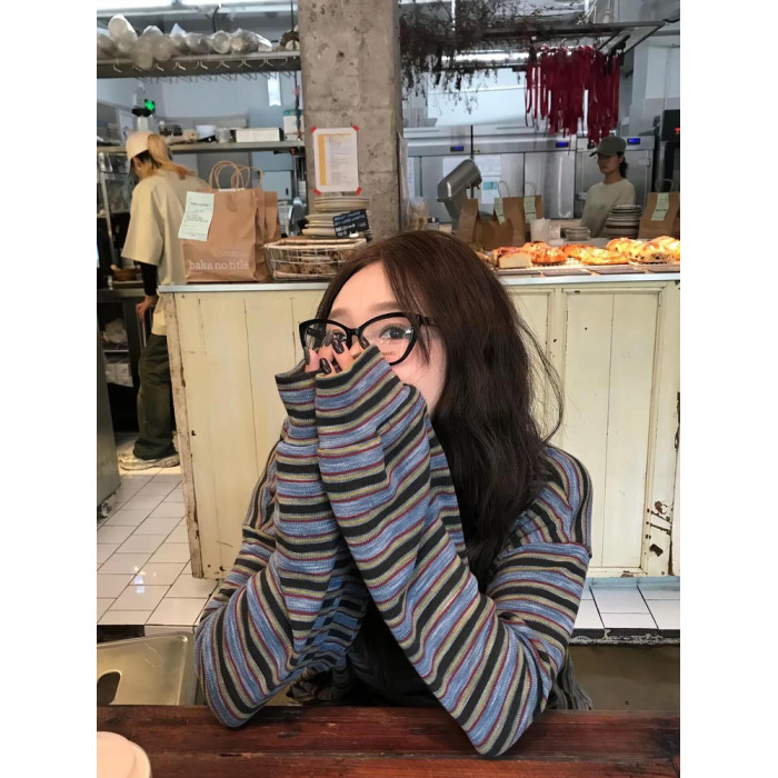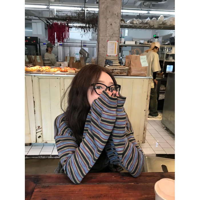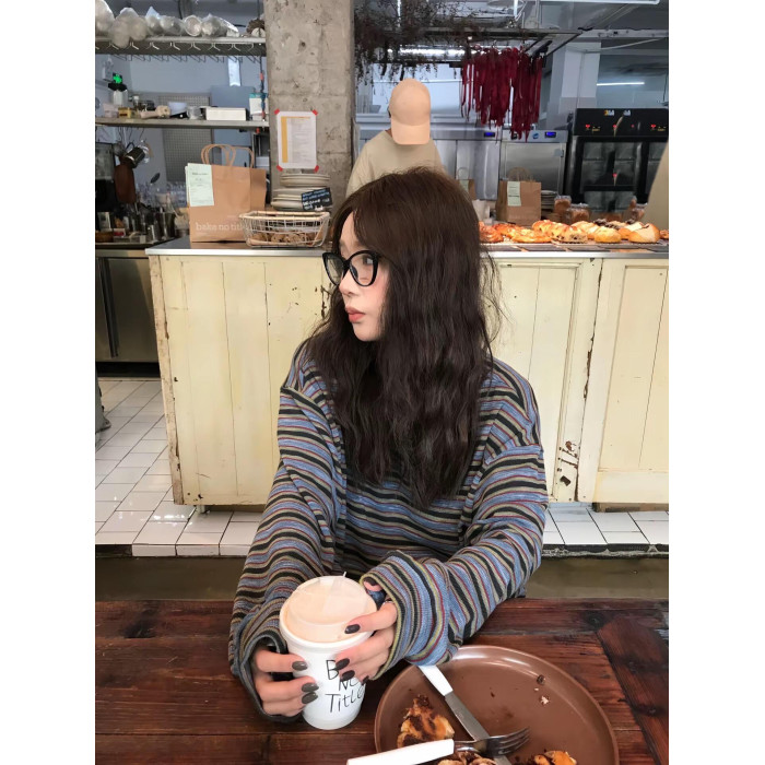 韓系慵懶設計感條紋復古長袖衛衣女秋季小衆休閒圓領寬松針織上衣
