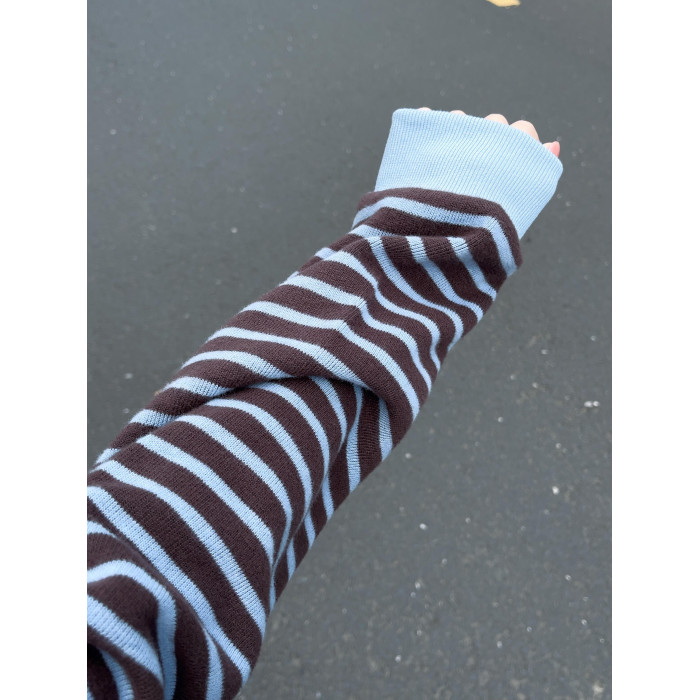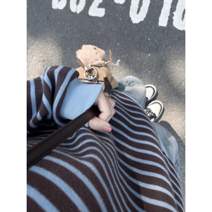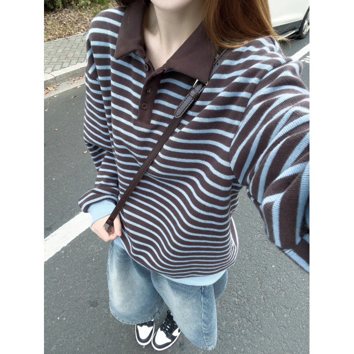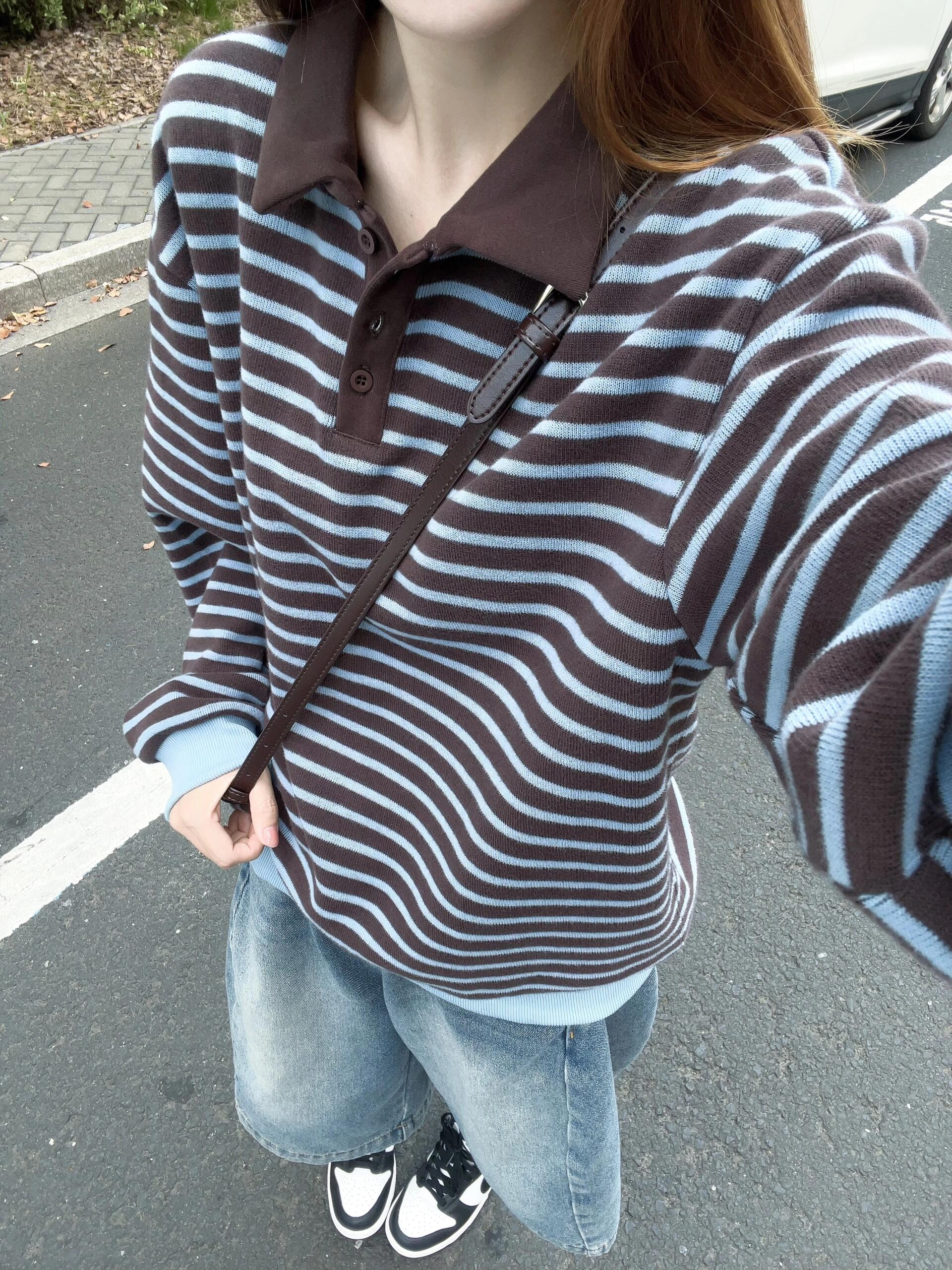 韓系學院風翻領條紋衛衣女秋季復古百搭撞色寬松休閒長袖毛衣上衣