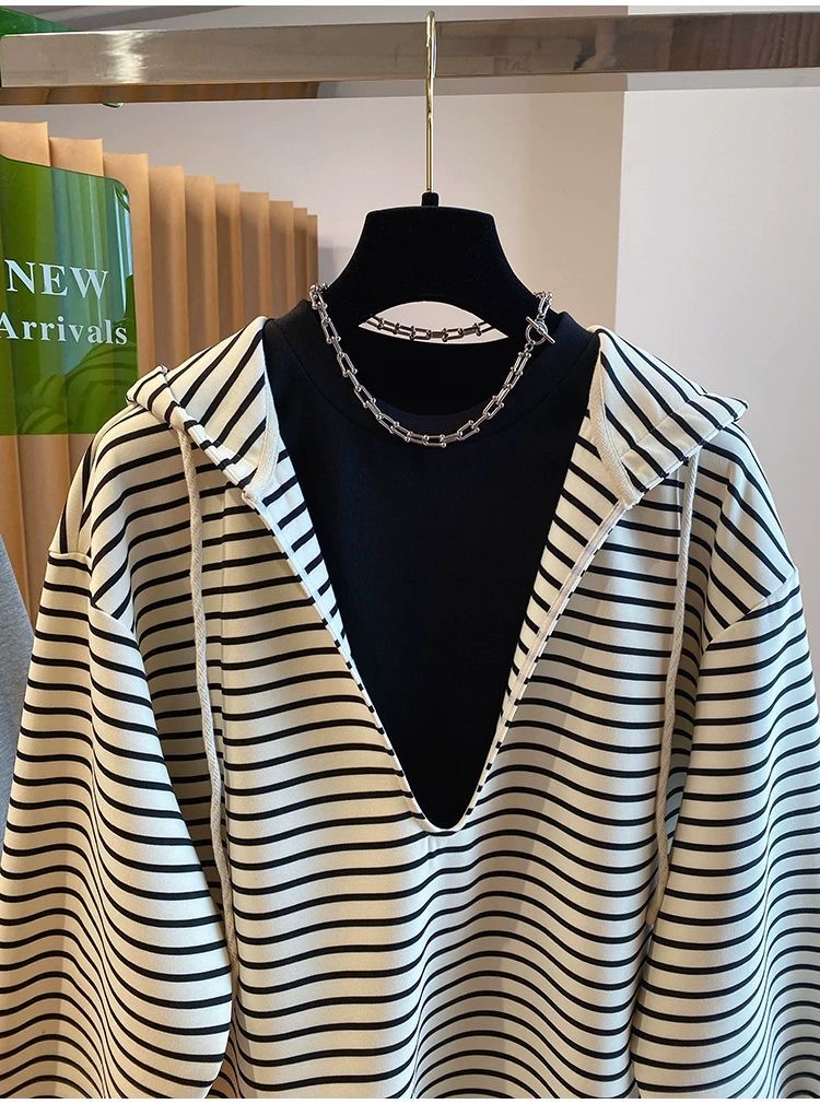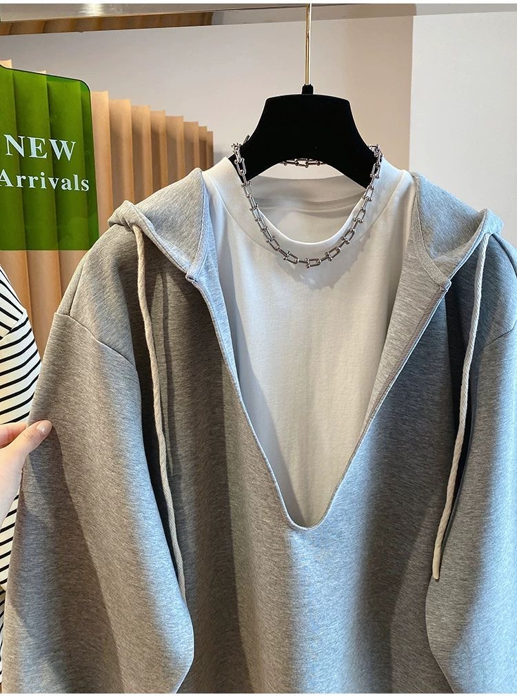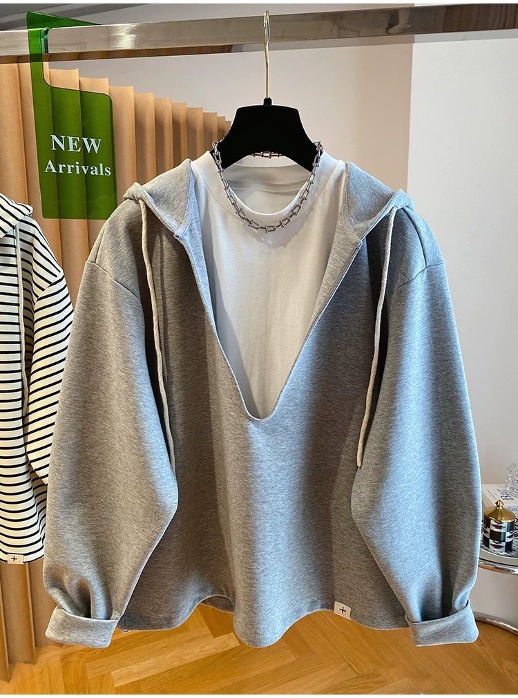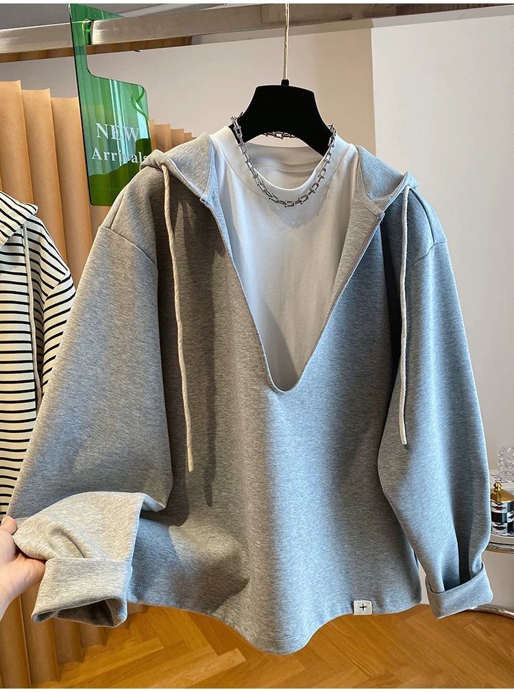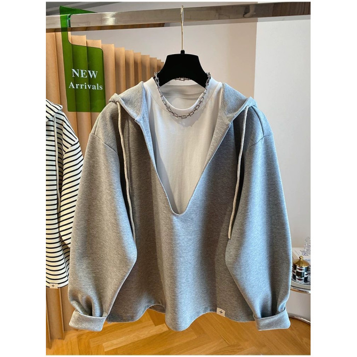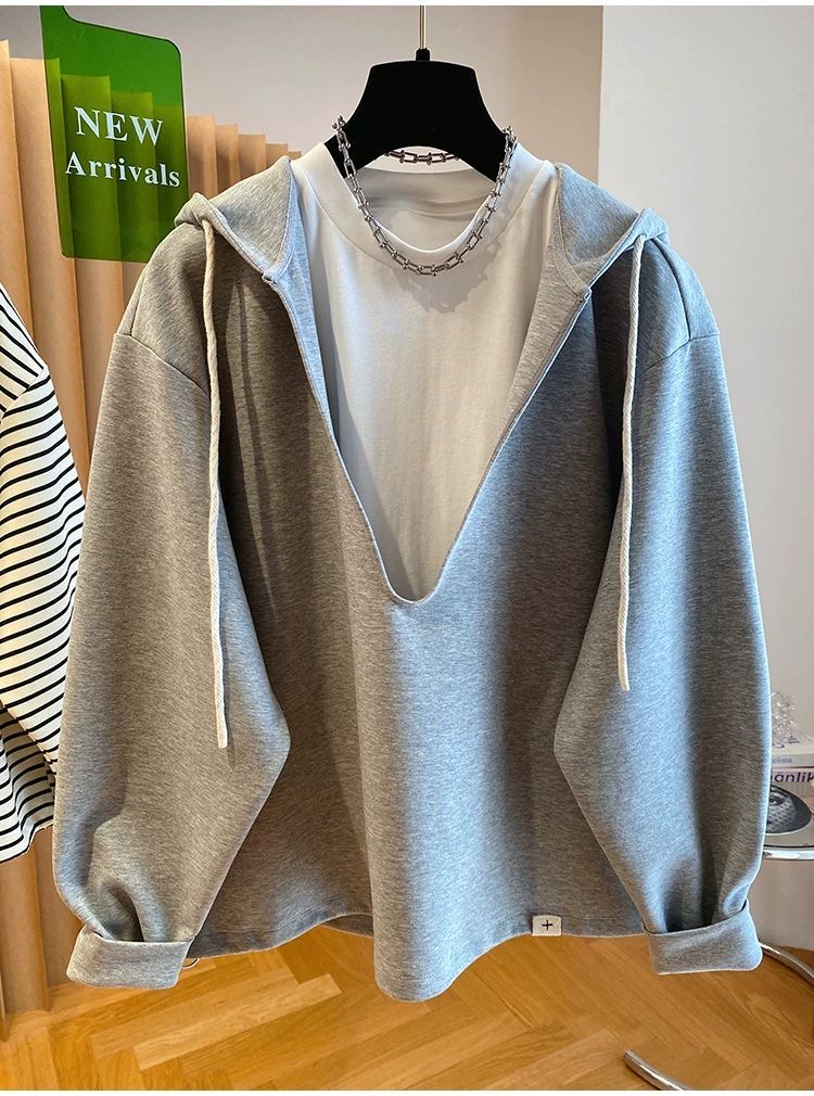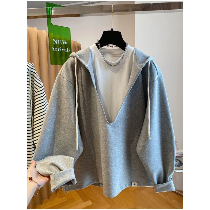 大碼300斤韓系設計感V領連帽假兩件衛衣女春秋款寬松遮肚顯瘦上衣