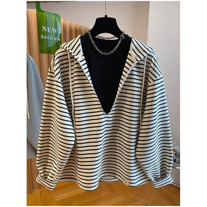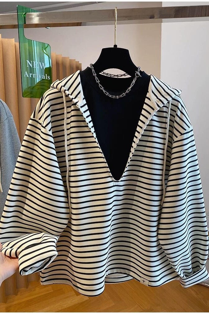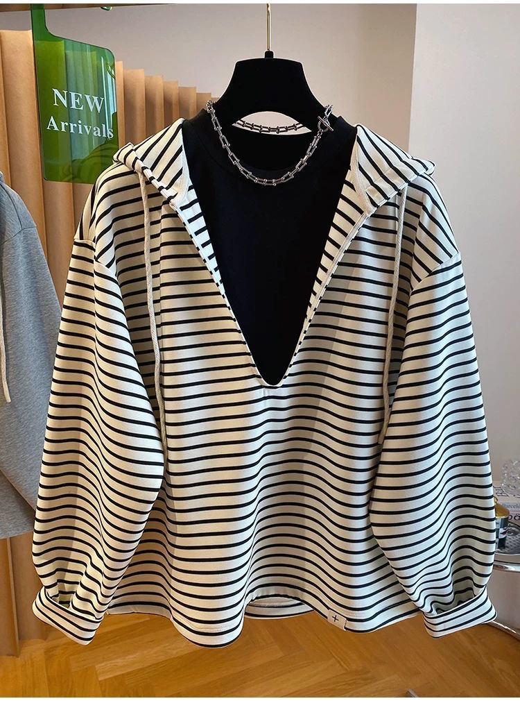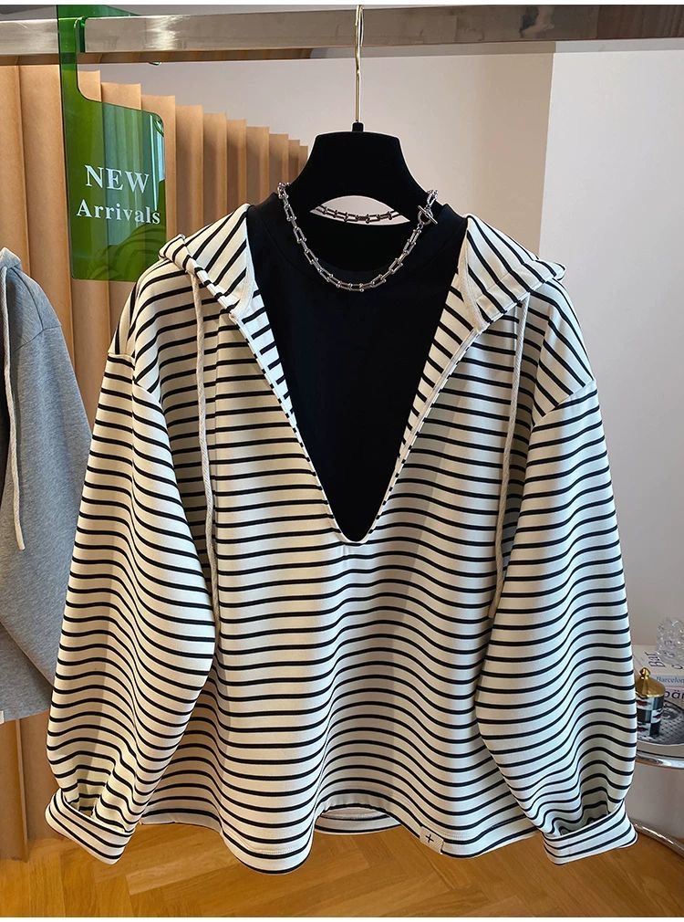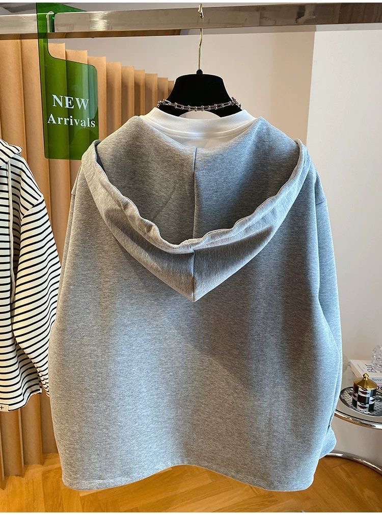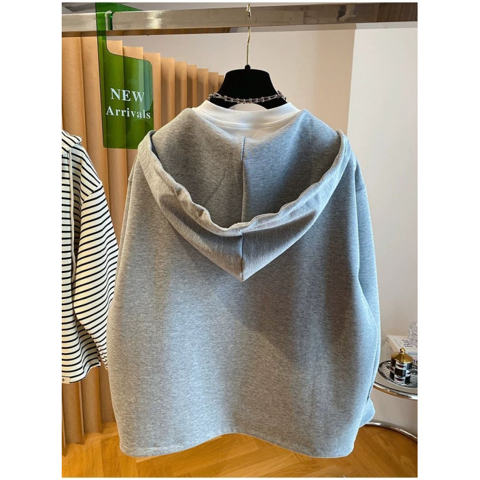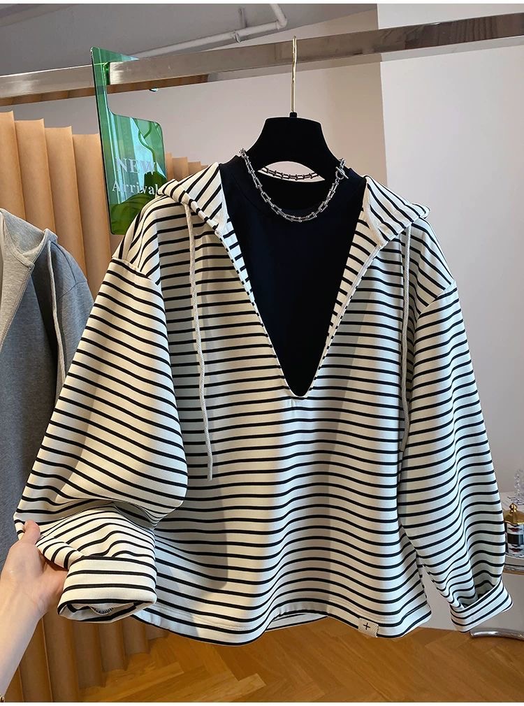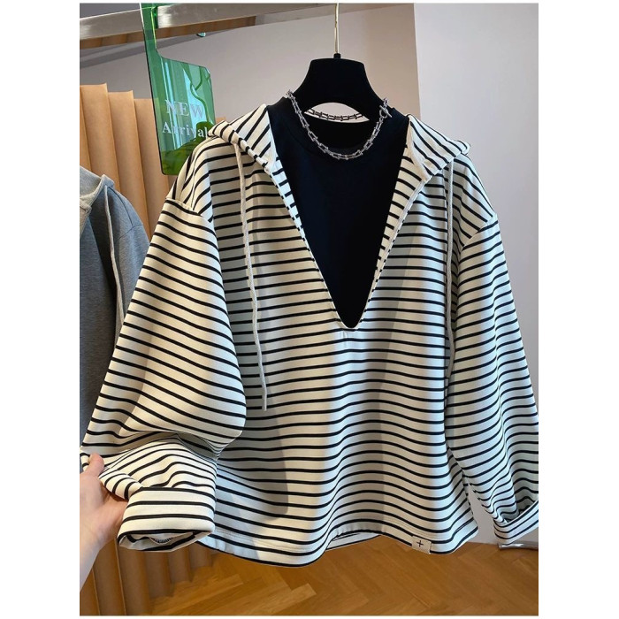 大碼300斤韓系設計感V領連帽假兩件衛衣女春秋款寬松遮肚顯瘦上衣