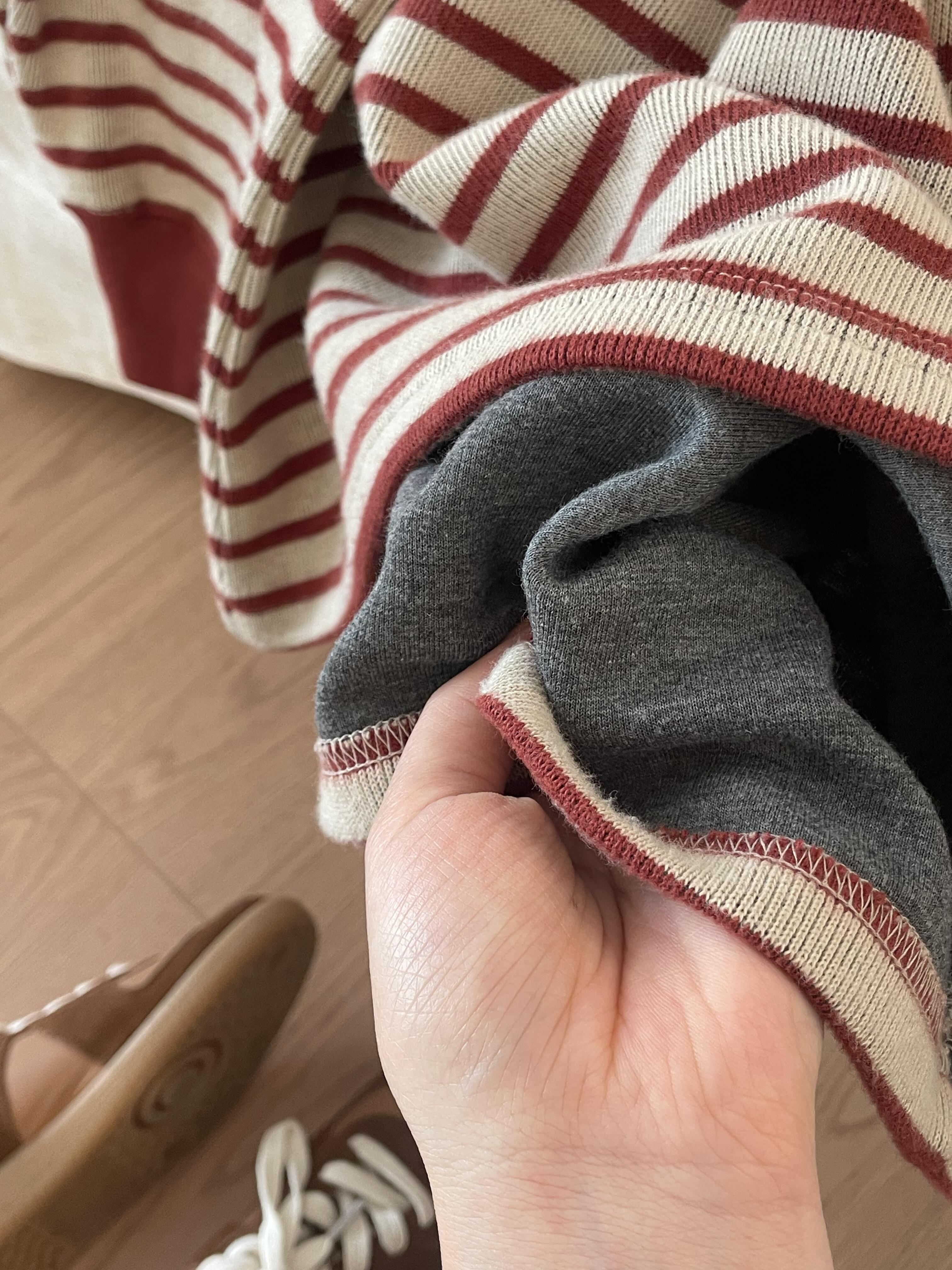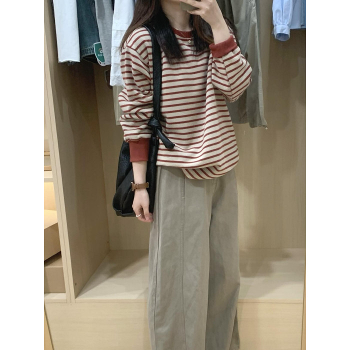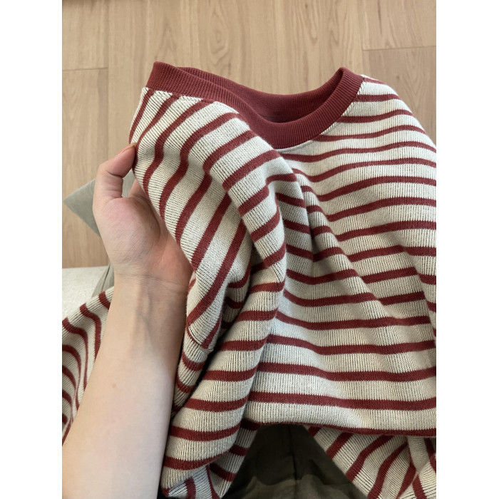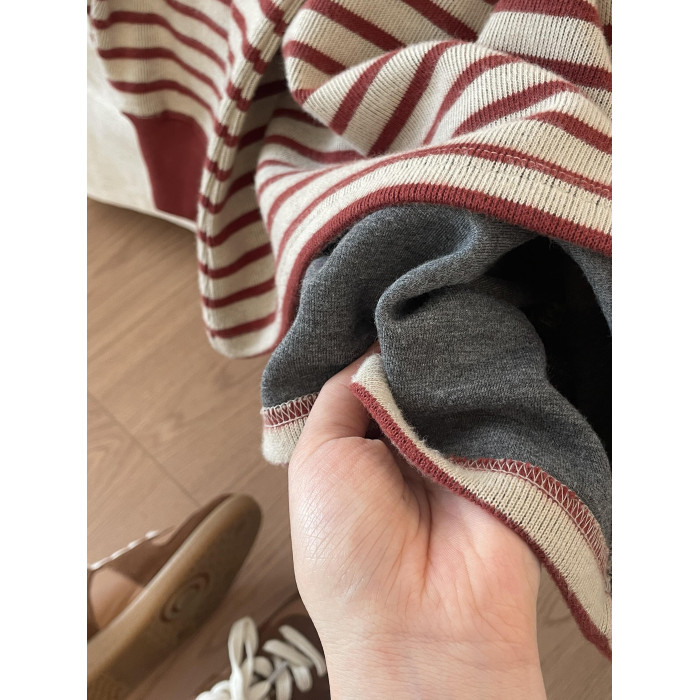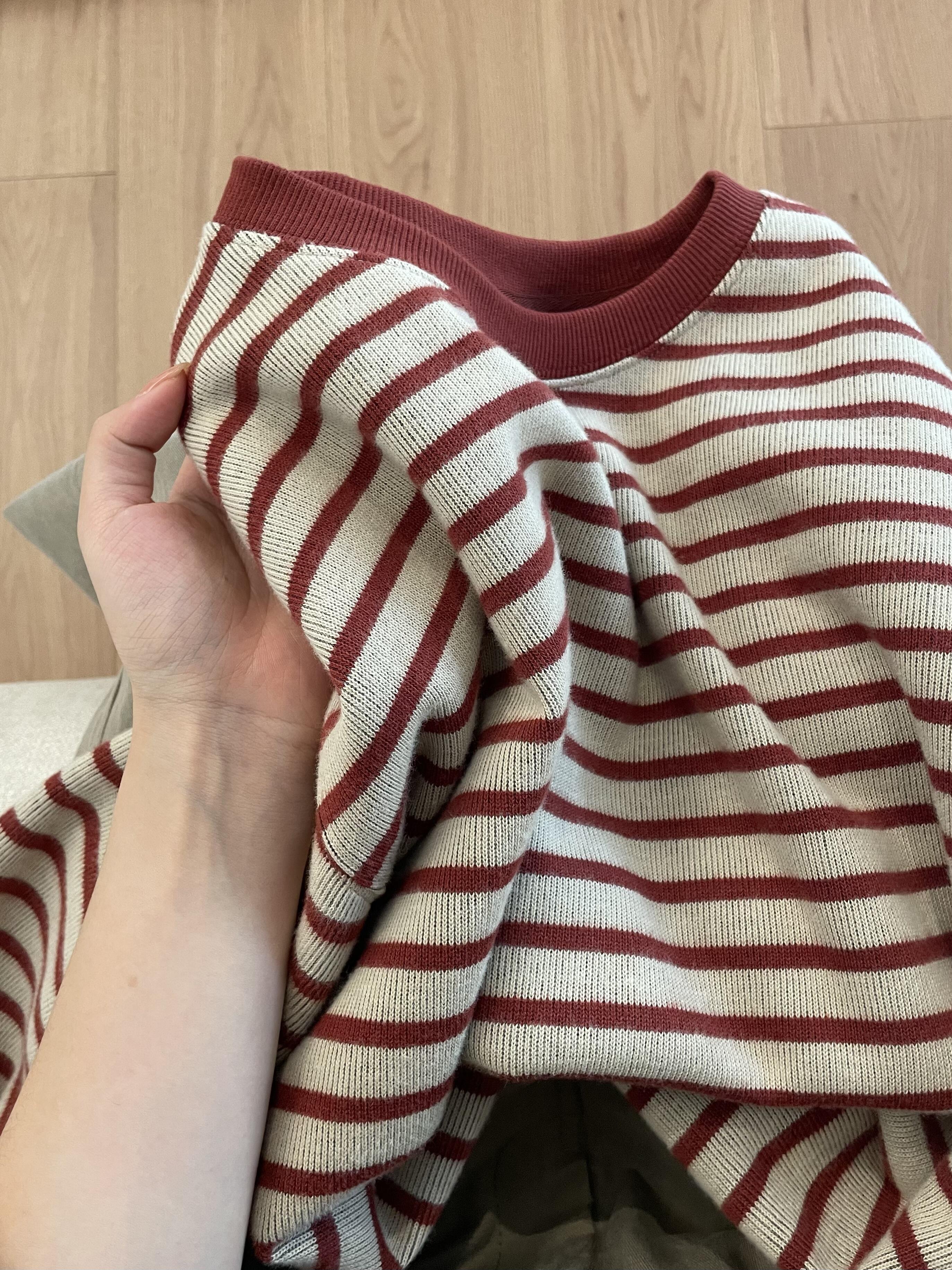 韓系設計感拼接紅灰色條紋圓領衛衣女秋冬寬松軟糯加厚長袖上衣