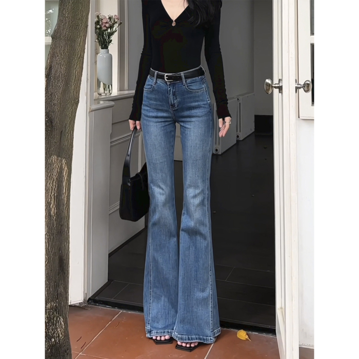 復古藍微喇牛仔褲女2025秋季新款寬松顯瘦彈力喇叭馬蹄拖地長褲子
