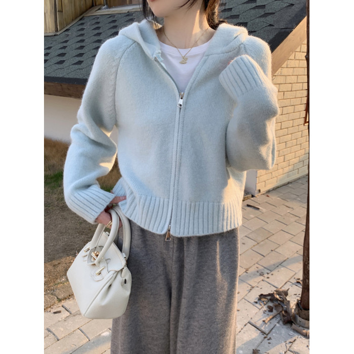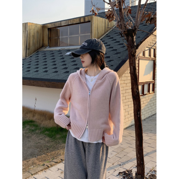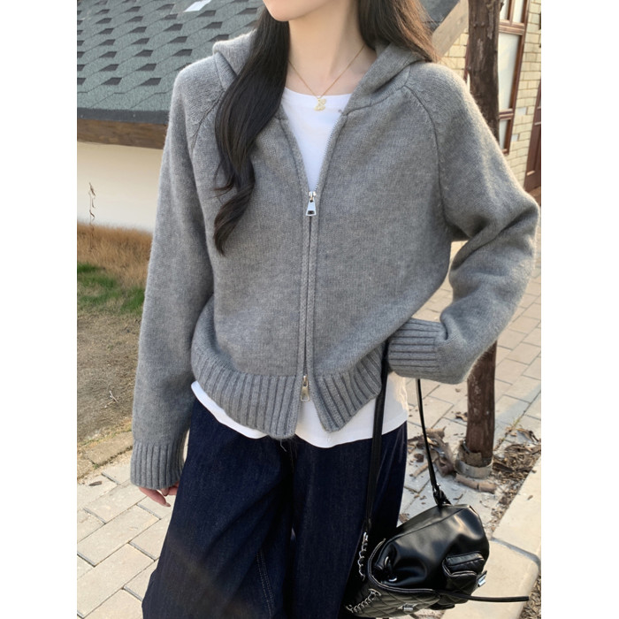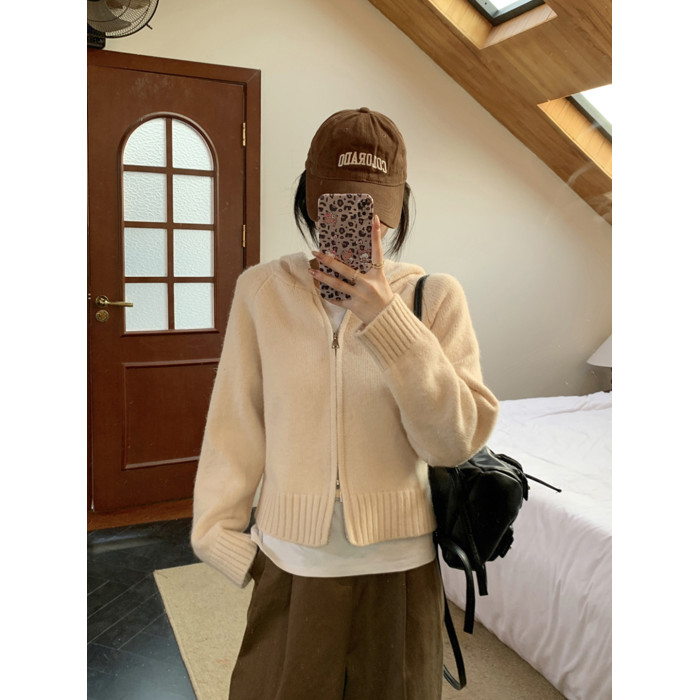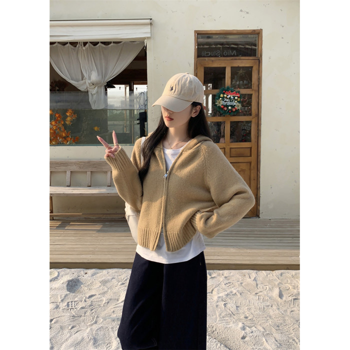簡約風純色連帽拉鍊開衫加厚2025秋新款韓版百搭寬松顯瘦針織上衣