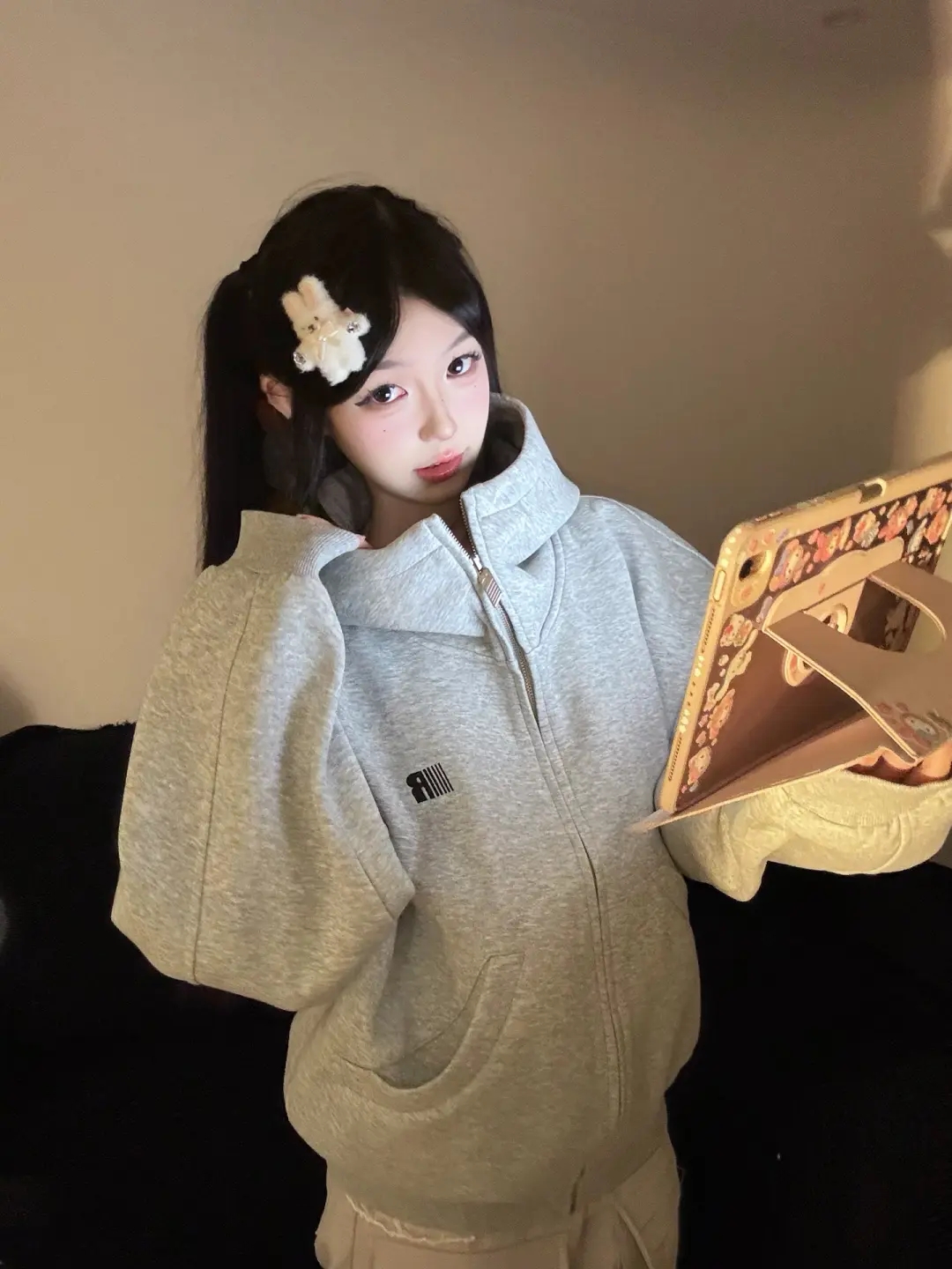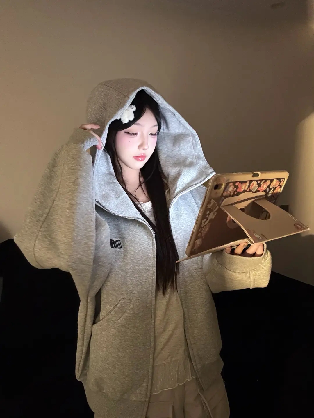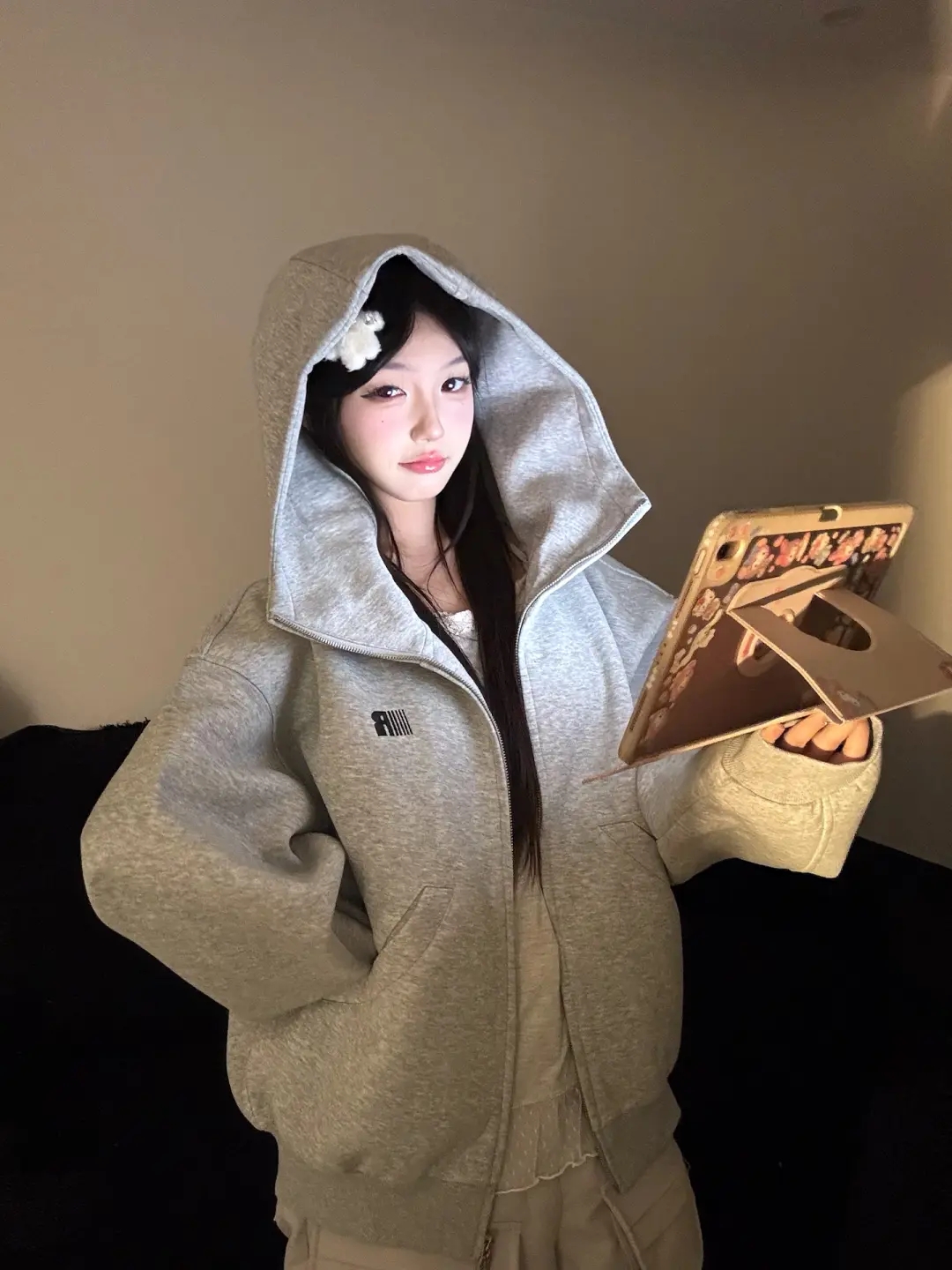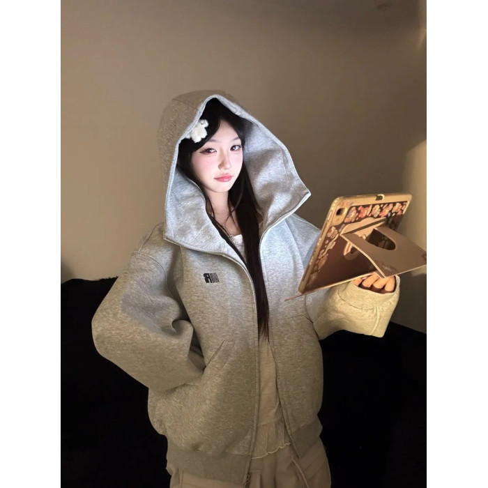 美式連帽高領開衫灰色衛衣外套女2025新款高街oversize寬松上衣服