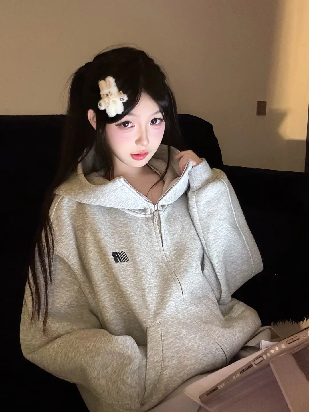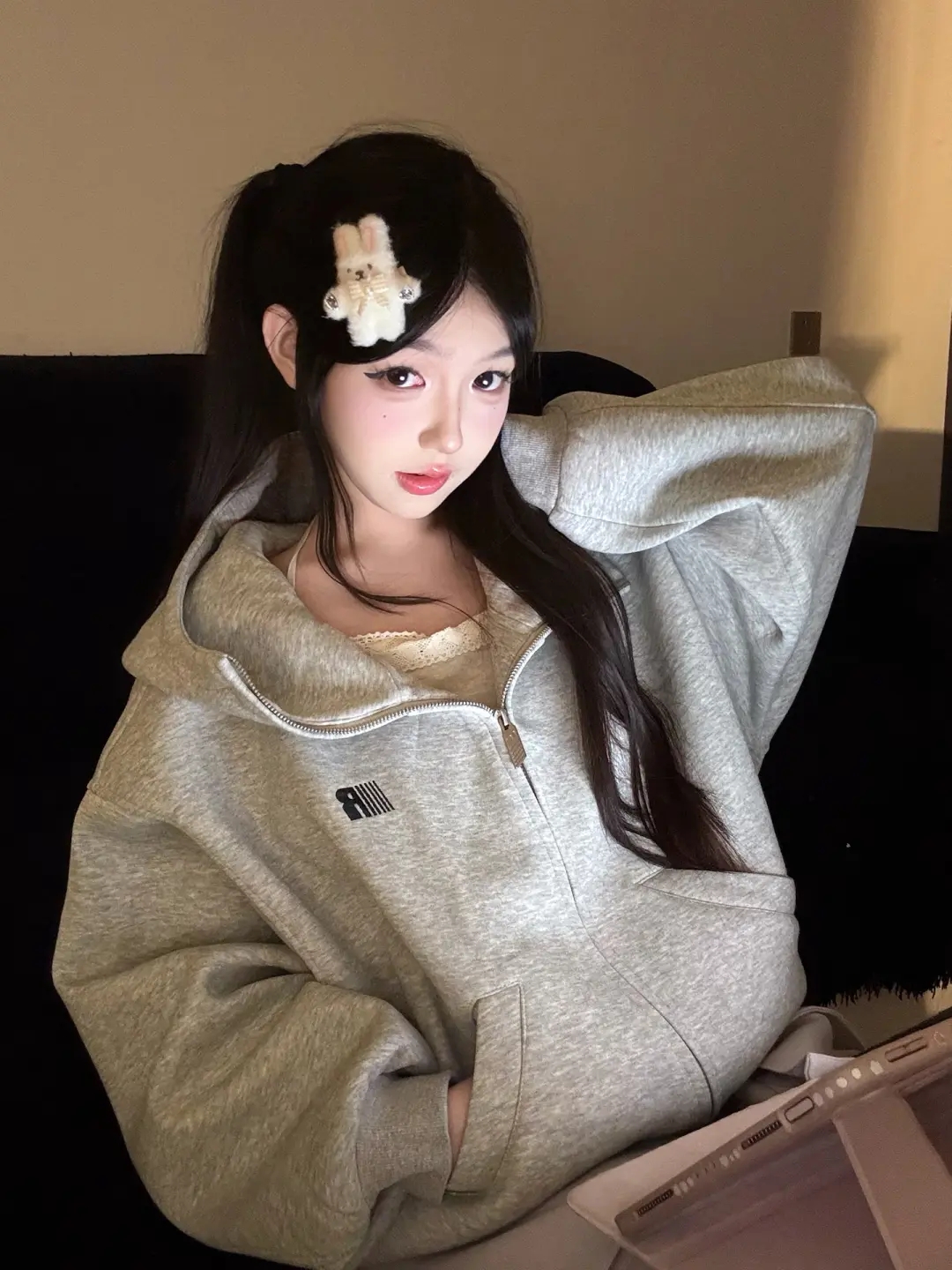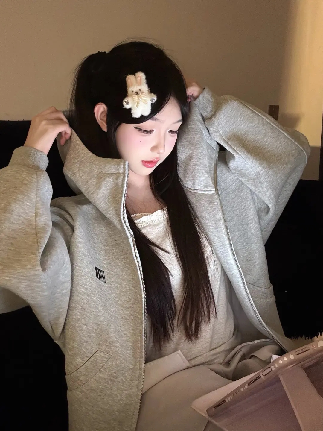 美式連帽高領開衫灰色衛衣外套女2025新款高街oversize寬松上衣服