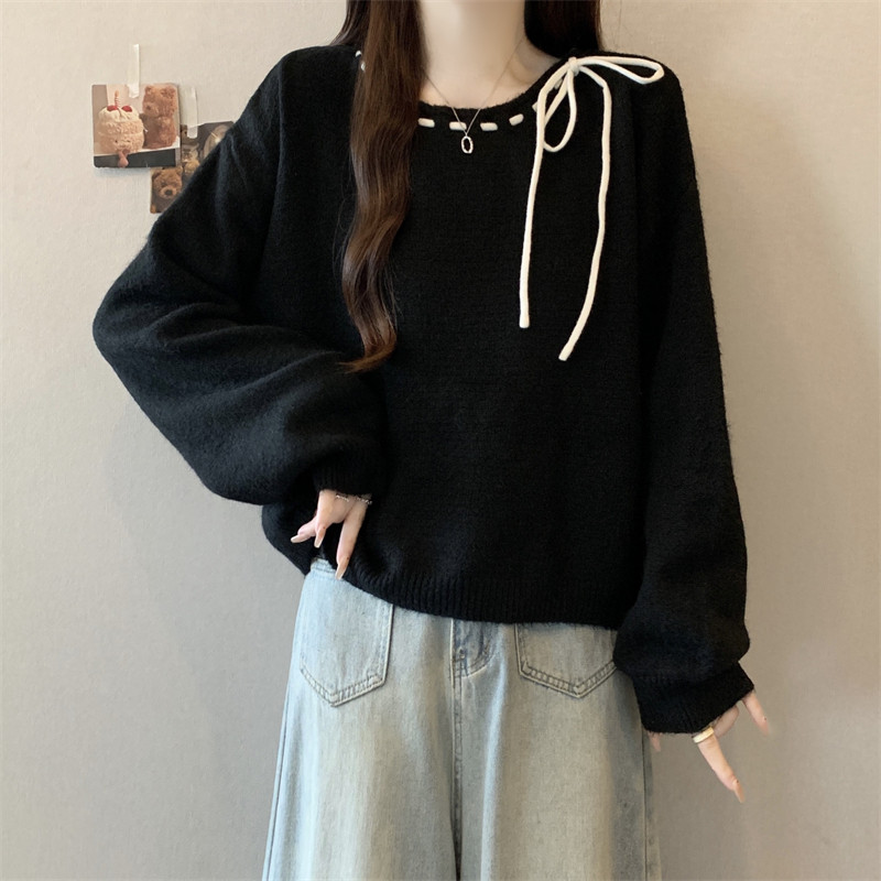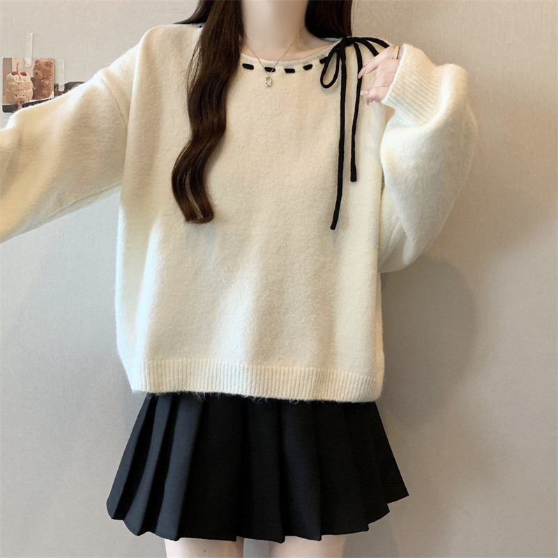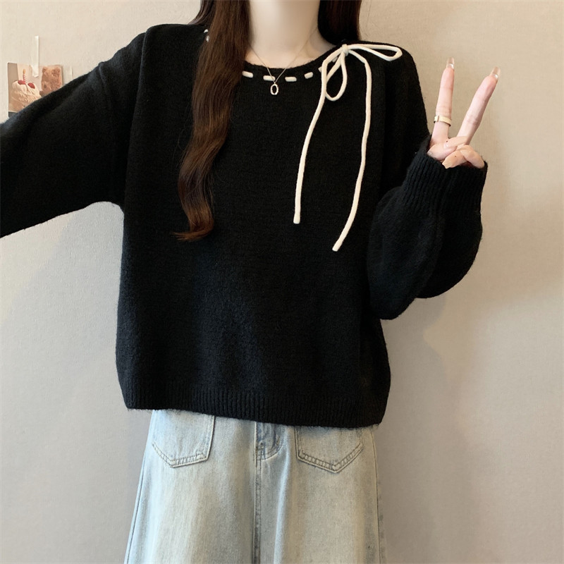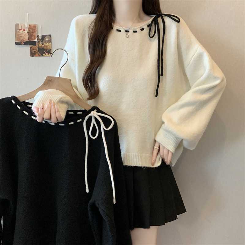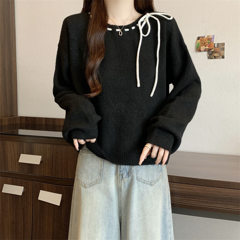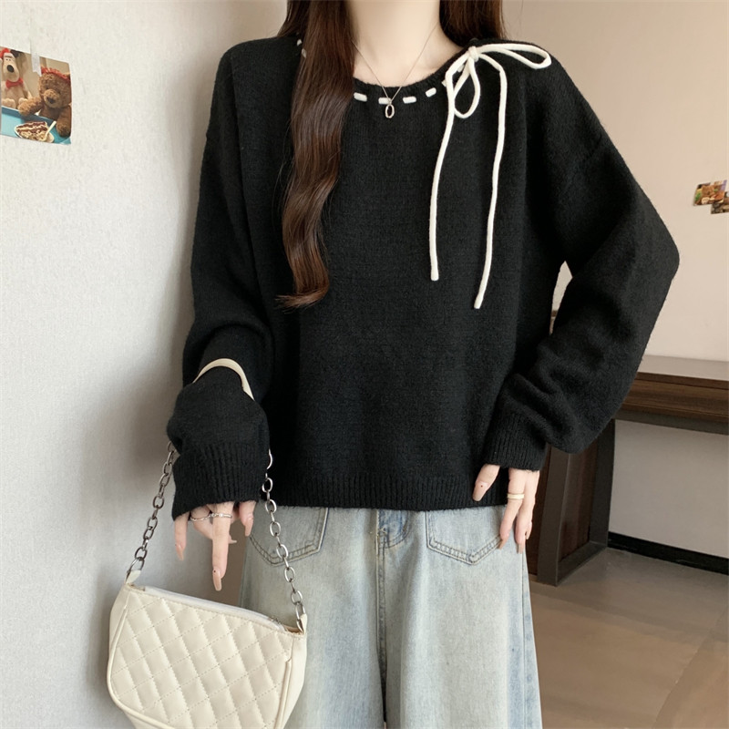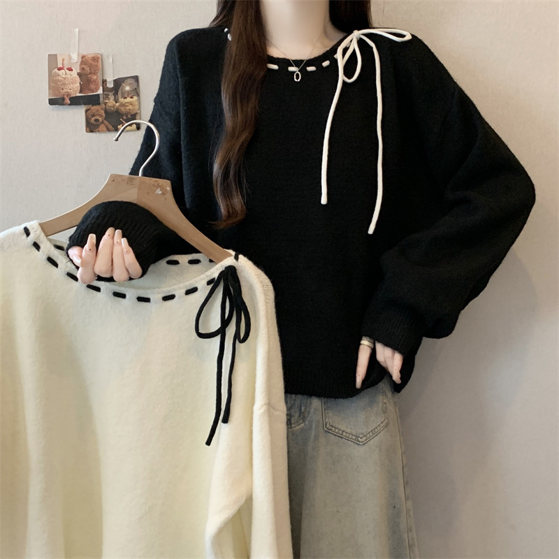 寬松蝴蝶結系帶正肩針織衫女秋季大碼胖mm軟糯慵懶巨好看減齡上衣