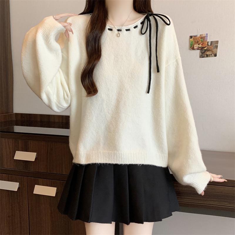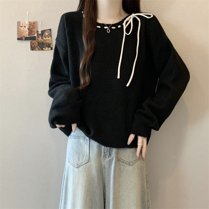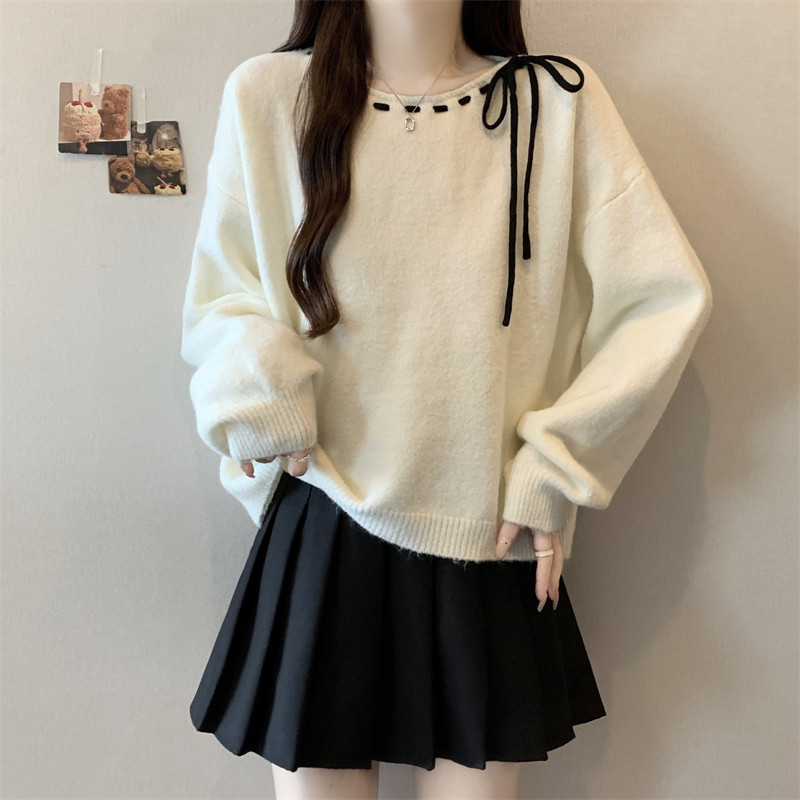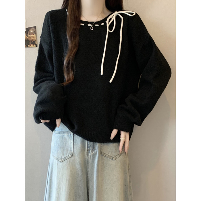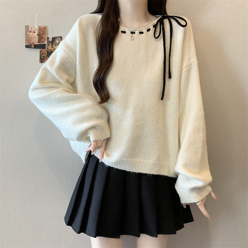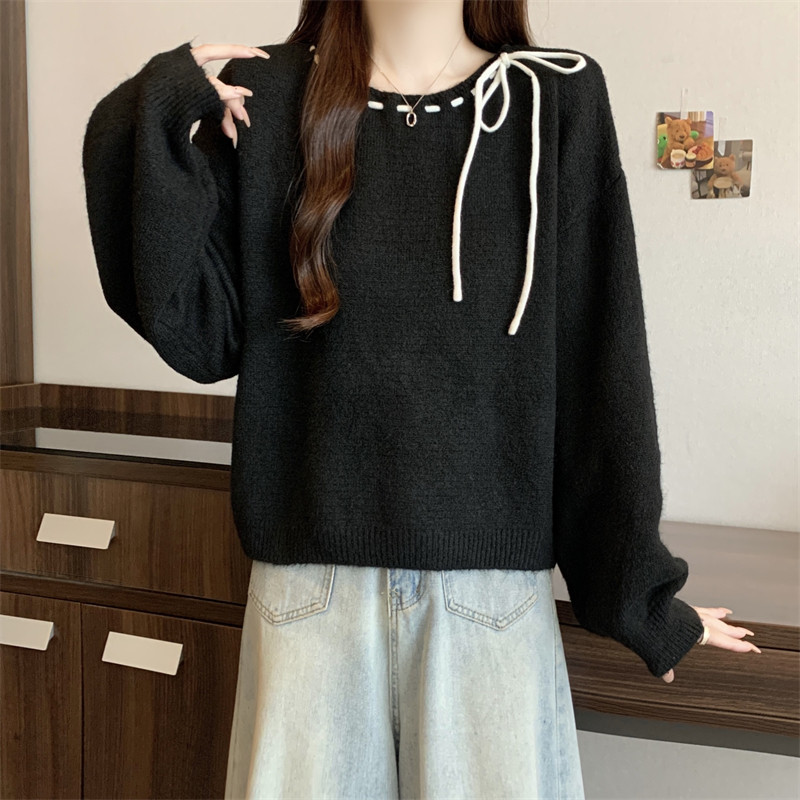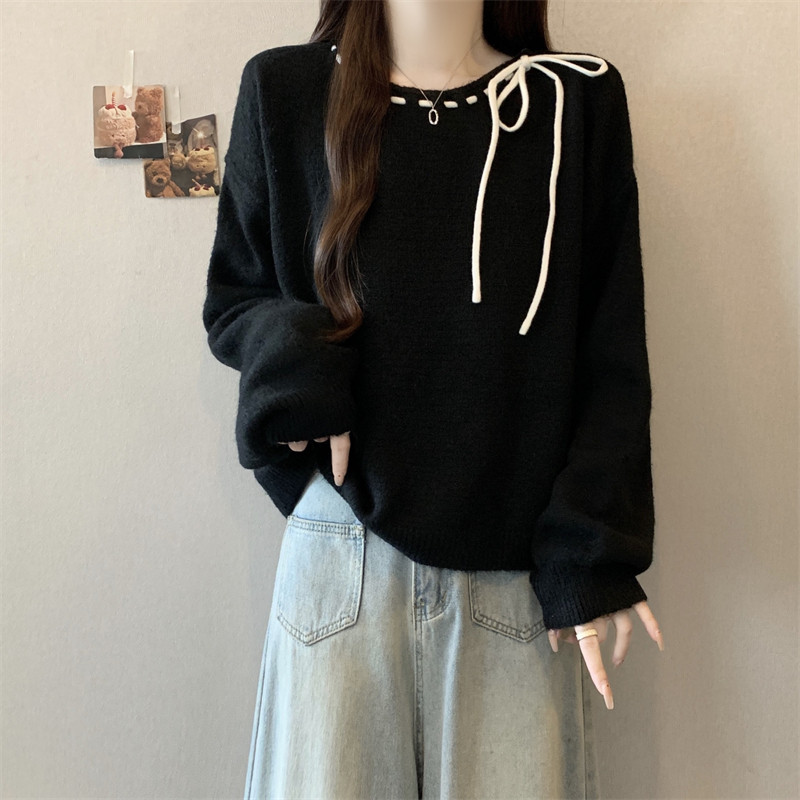 寬松蝴蝶結系帶正肩針織衫女秋季大碼胖mm軟糯慵懶巨好看減齡上衣