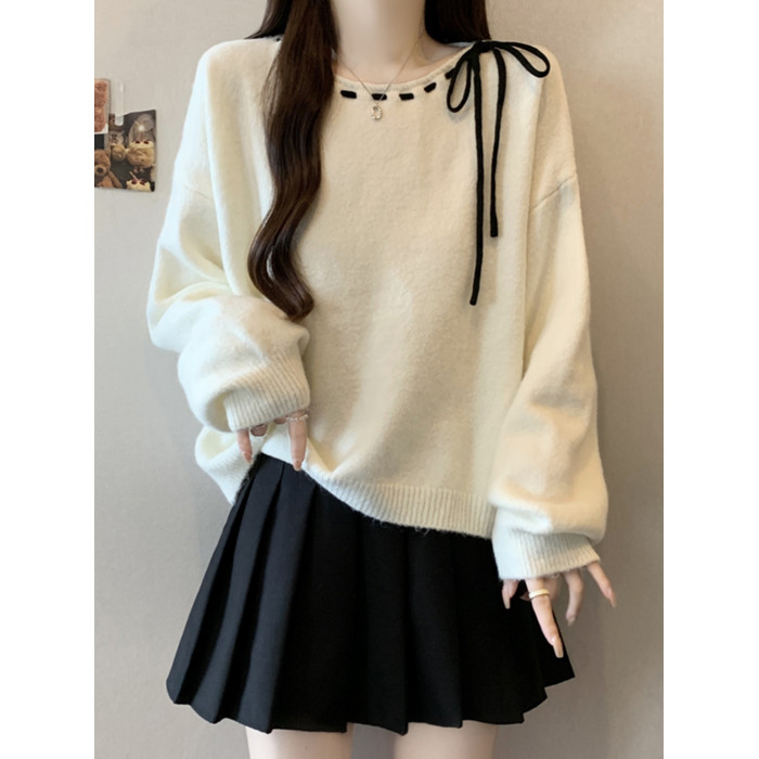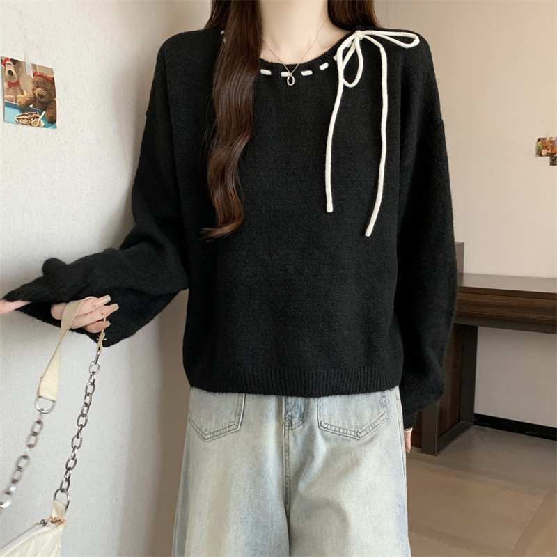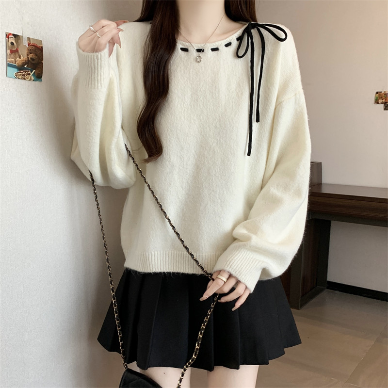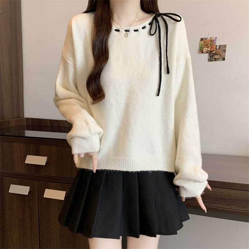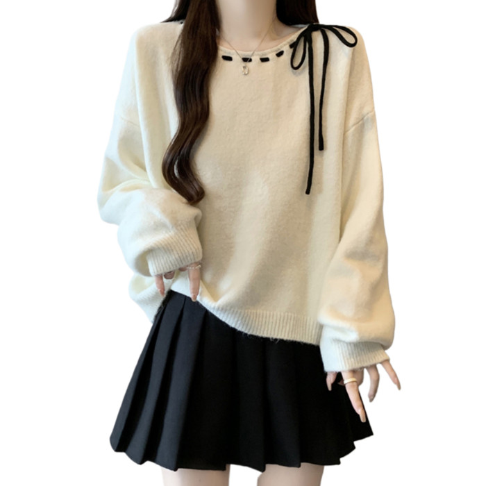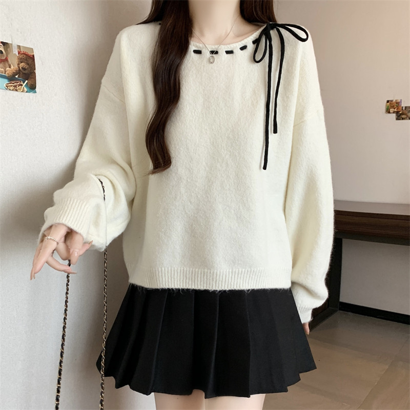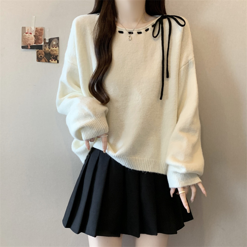 寬松蝴蝶結系帶正肩針織衫女秋季大碼胖mm軟糯慵懶巨好看減齡上衣