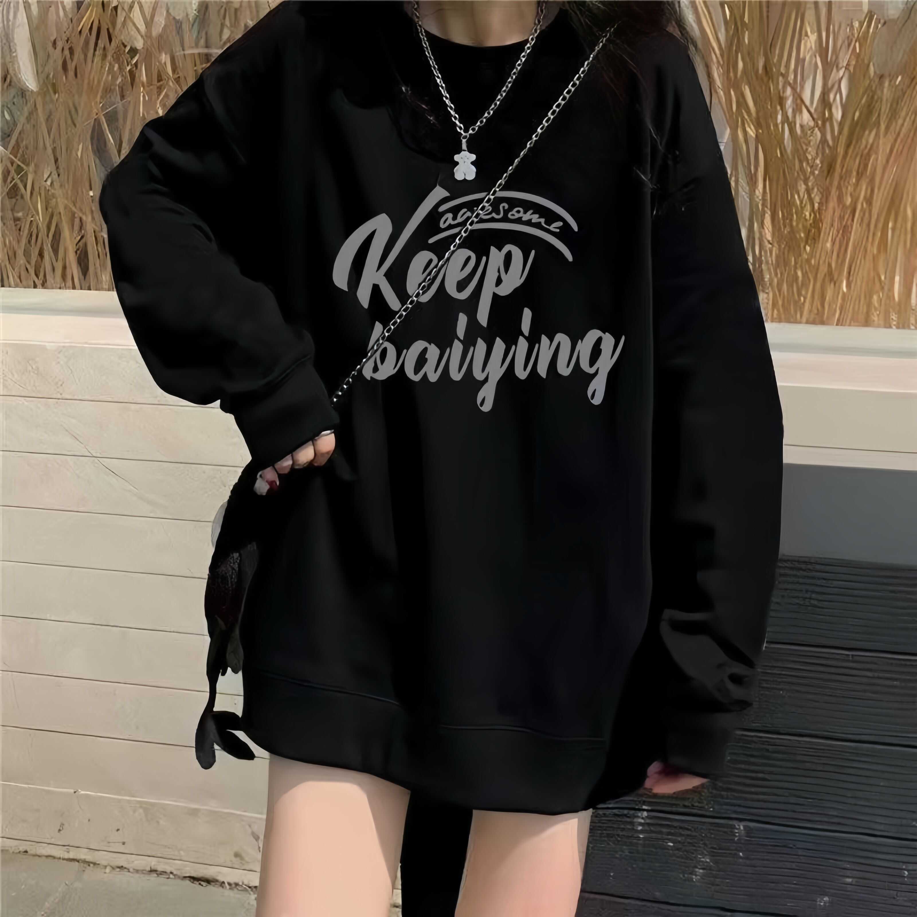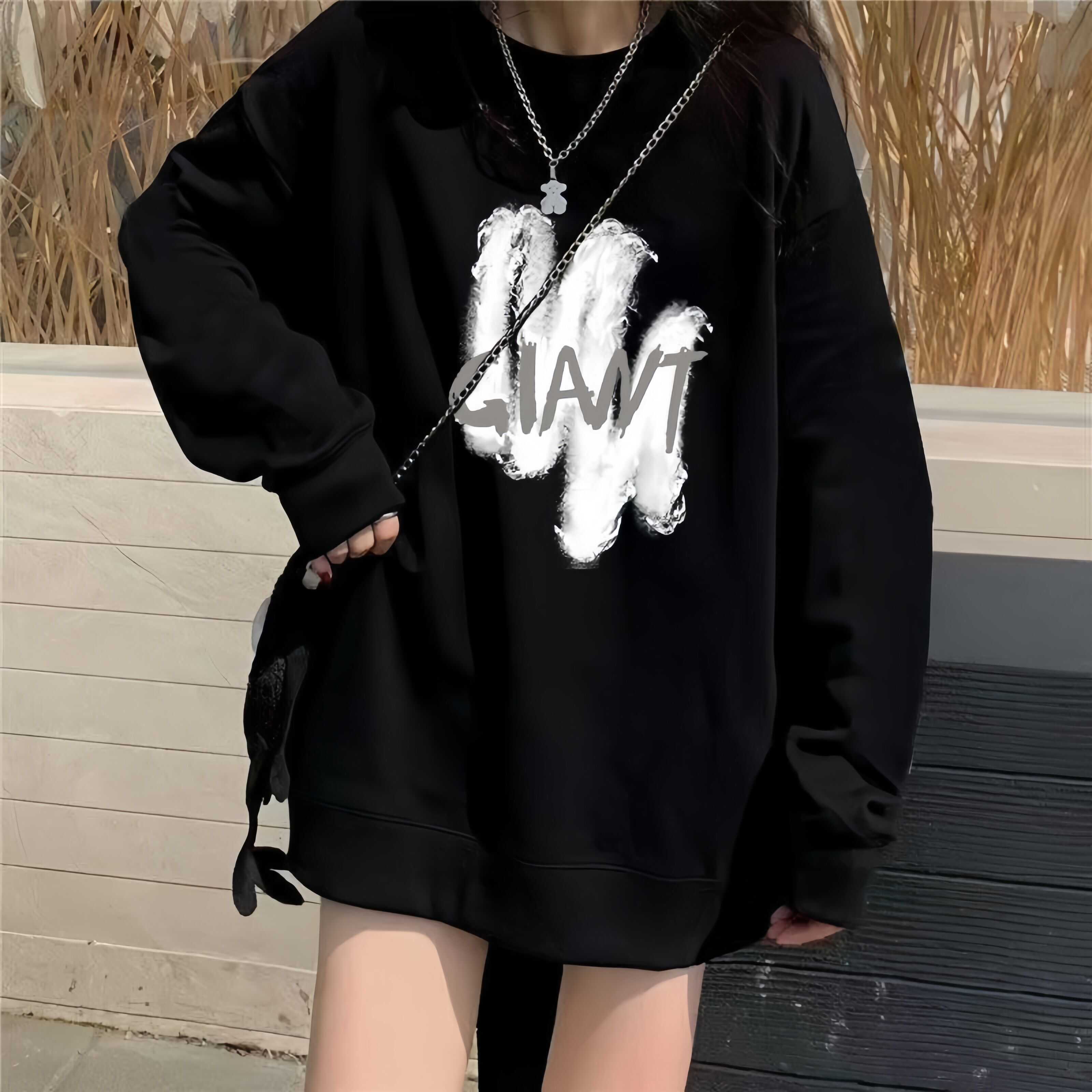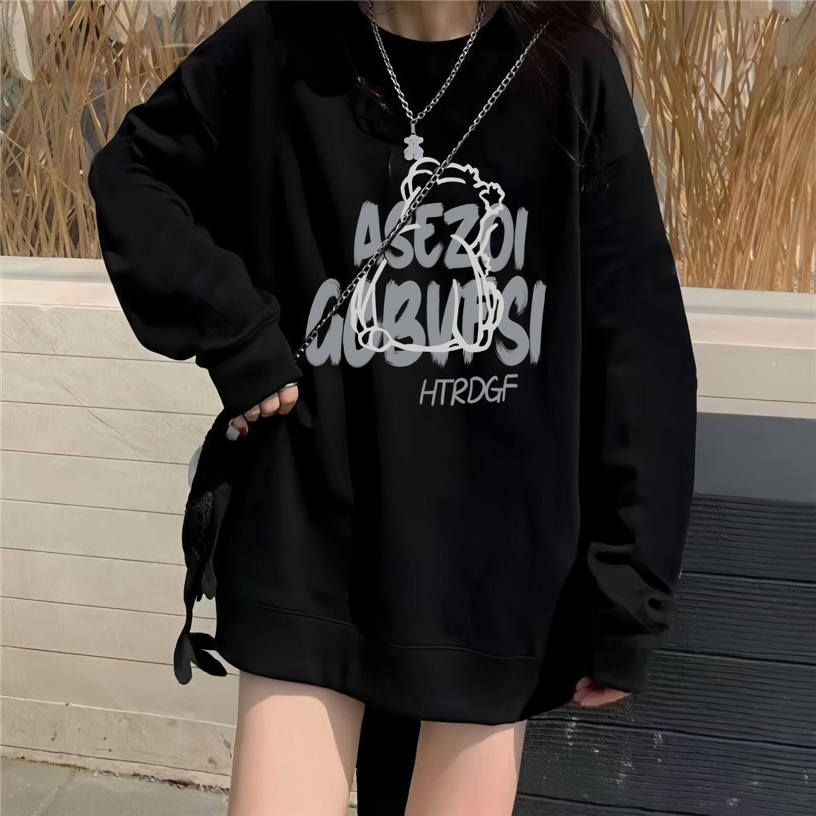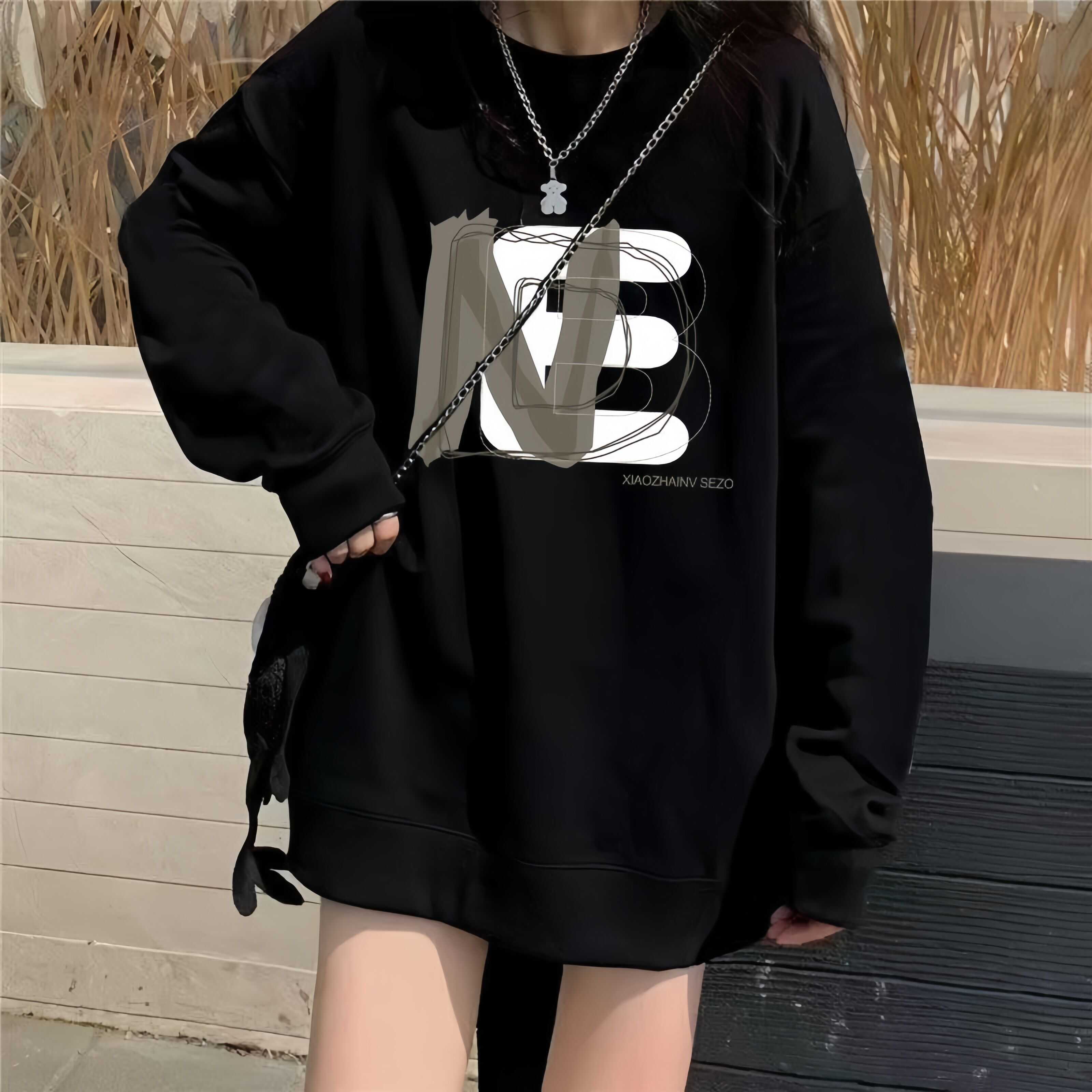 純棉黑色圓領衛衣女2025新款爆款春秋季美式復古寬松慵懶無帽上衣